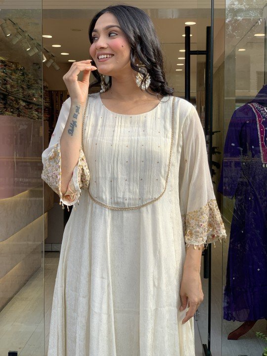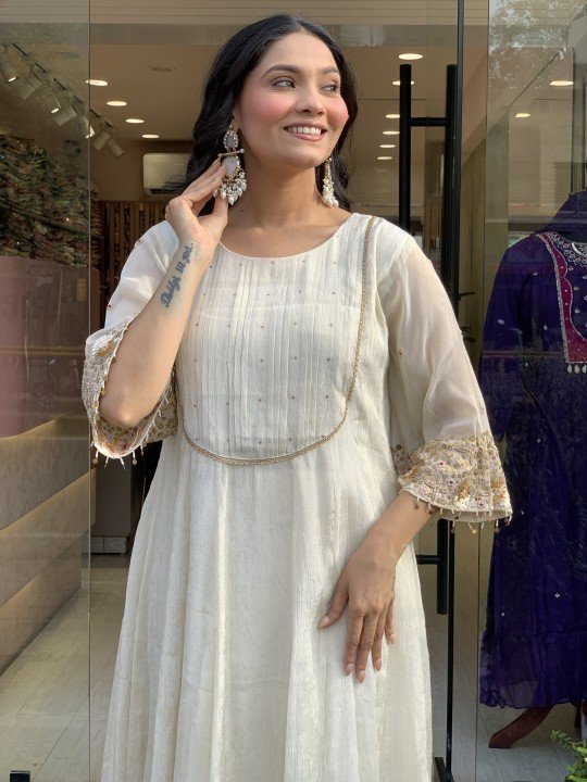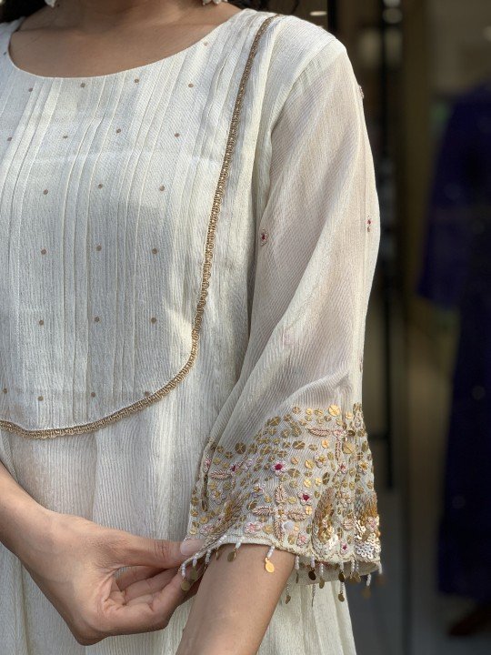 Pure chinon silk Anarkali in a beautifully sober off-white shade, featuring heavy zardozi handwork on the sleeves. Paired with a striped shimmer dupatta and elegant crepe silk pants. A graceful and timeless outfit perfect for special occasions. Sizes available from 38 to 46. ✨