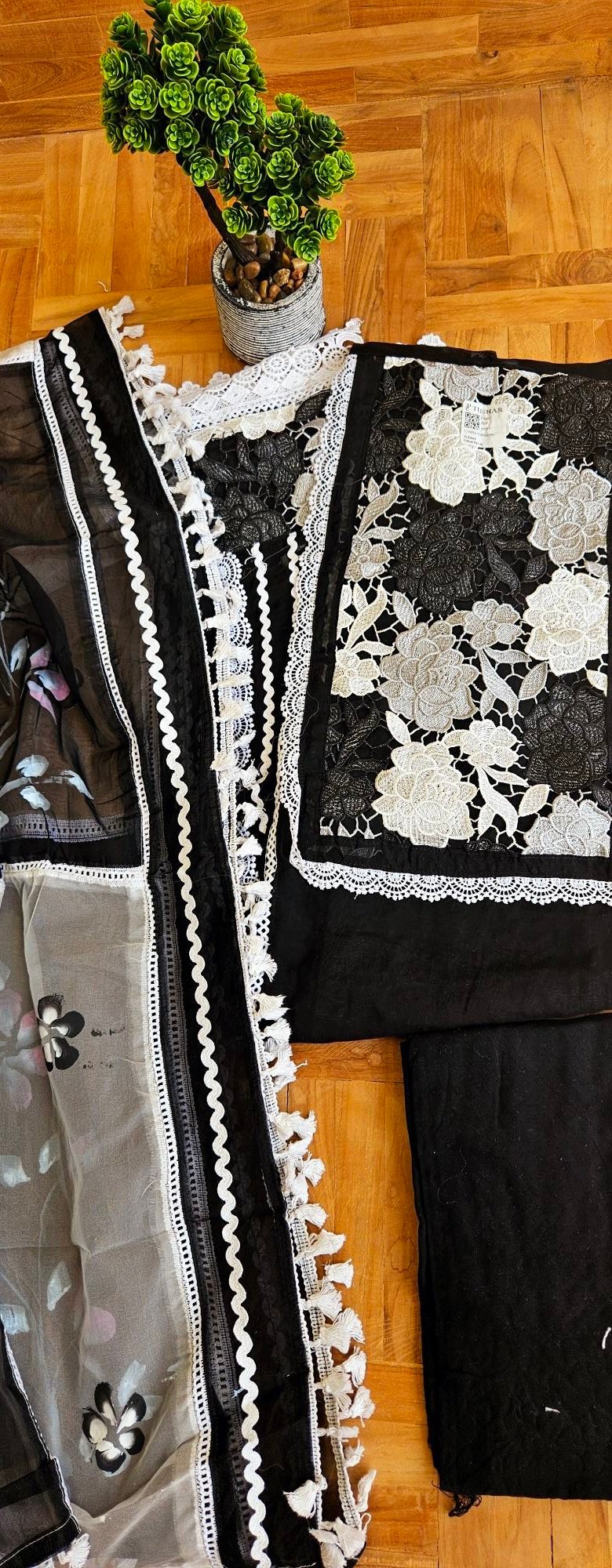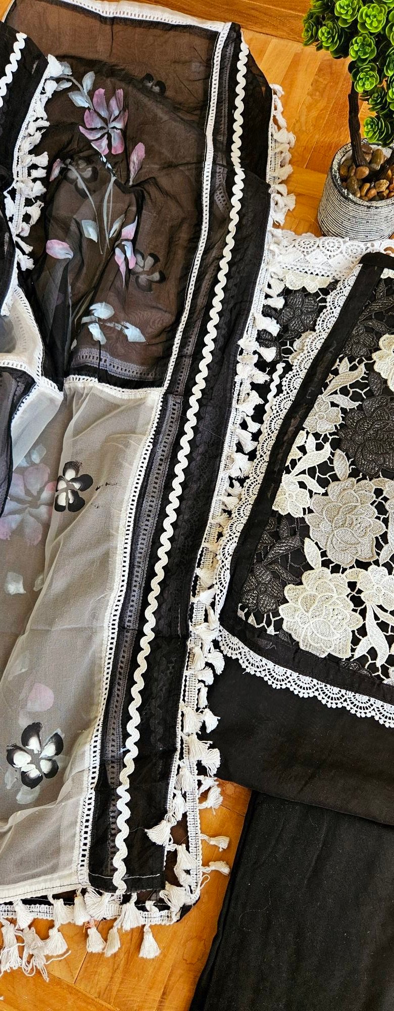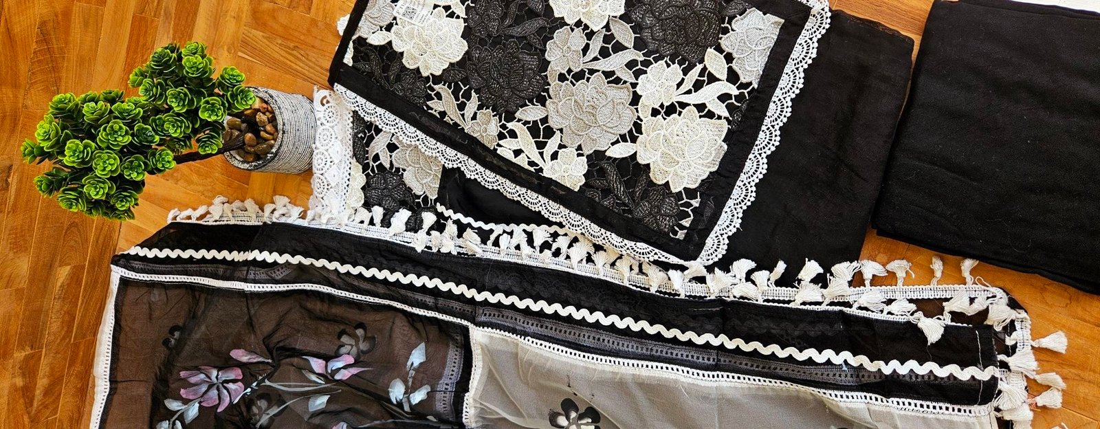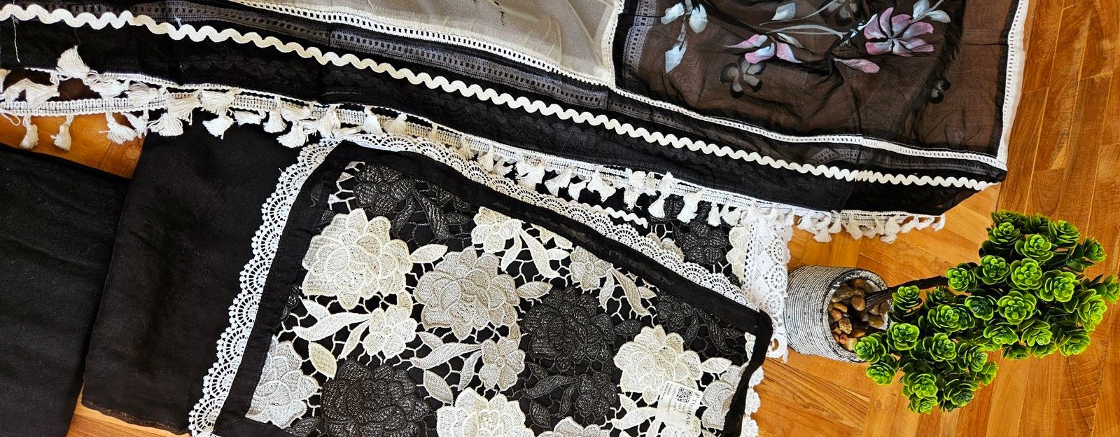 Beautiful muslin boutique dress adorned with delicate crochet lace work, paired with a graceful muslin handpainted dupatta. Comes with a comfortable santoon bottom — a perfect blend of elegance and artisanal charm. ✨