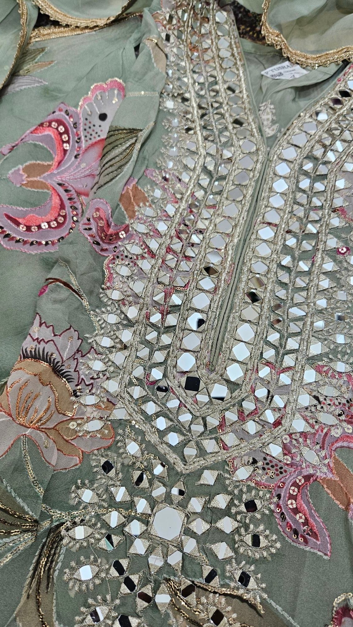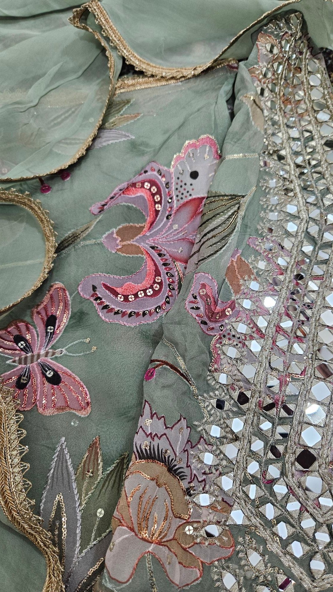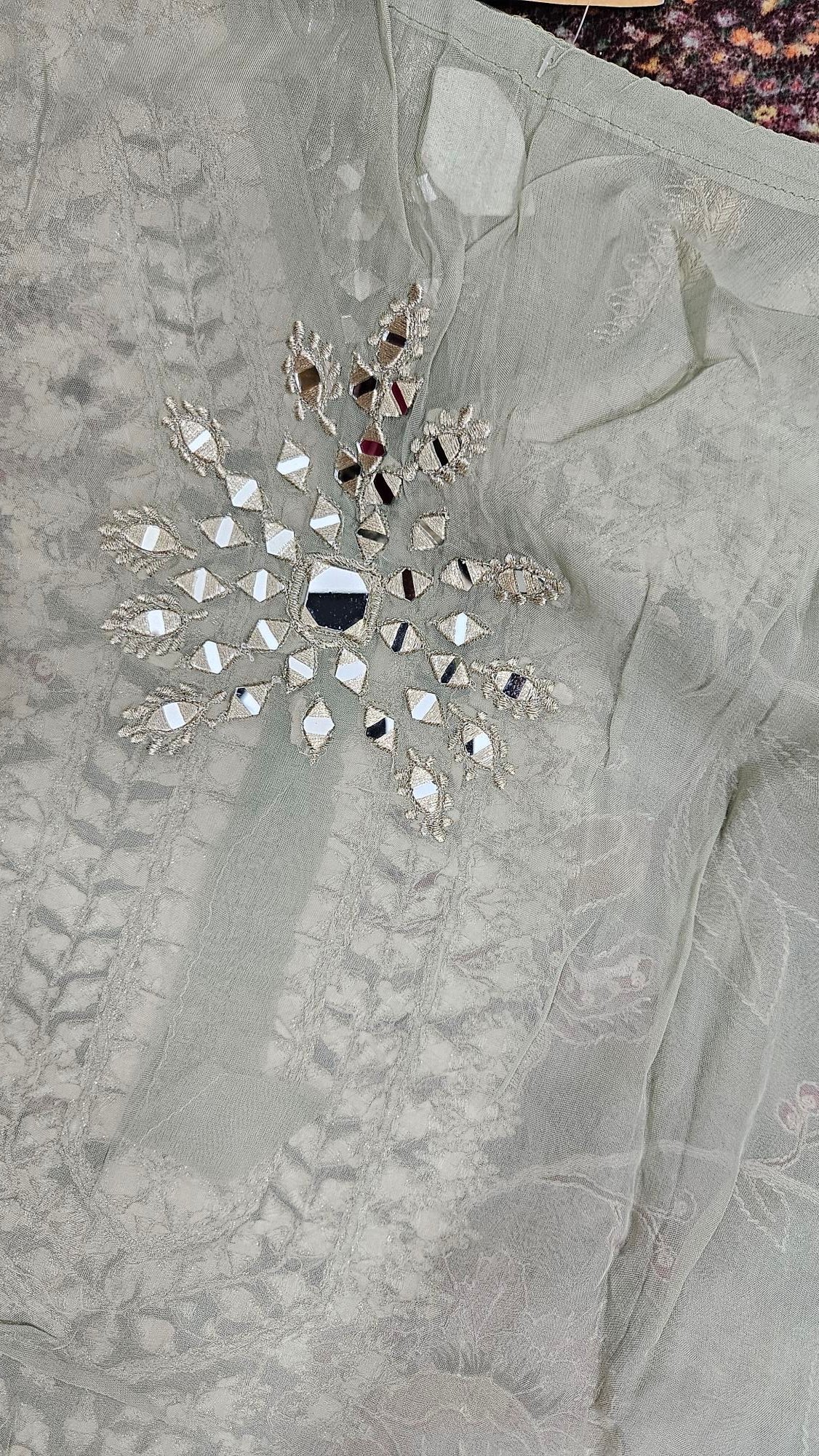 A luxurious organza outfit with intricate mirror embroidery on the shirt, sleeves, and dupatta — ideal for formal occasions, weddings, or festive nights. The fabric has a graceful fall and shines subtly in light.