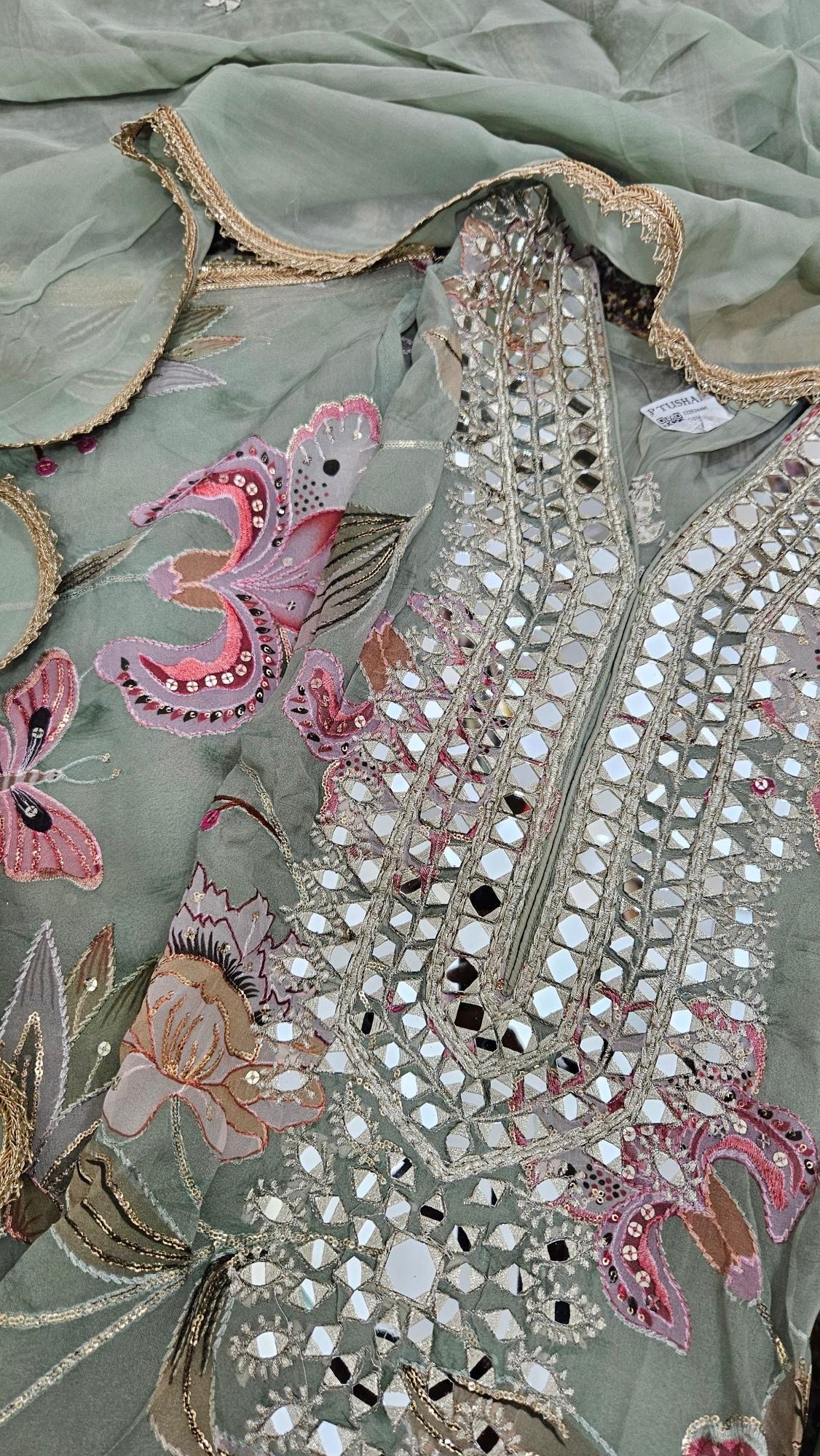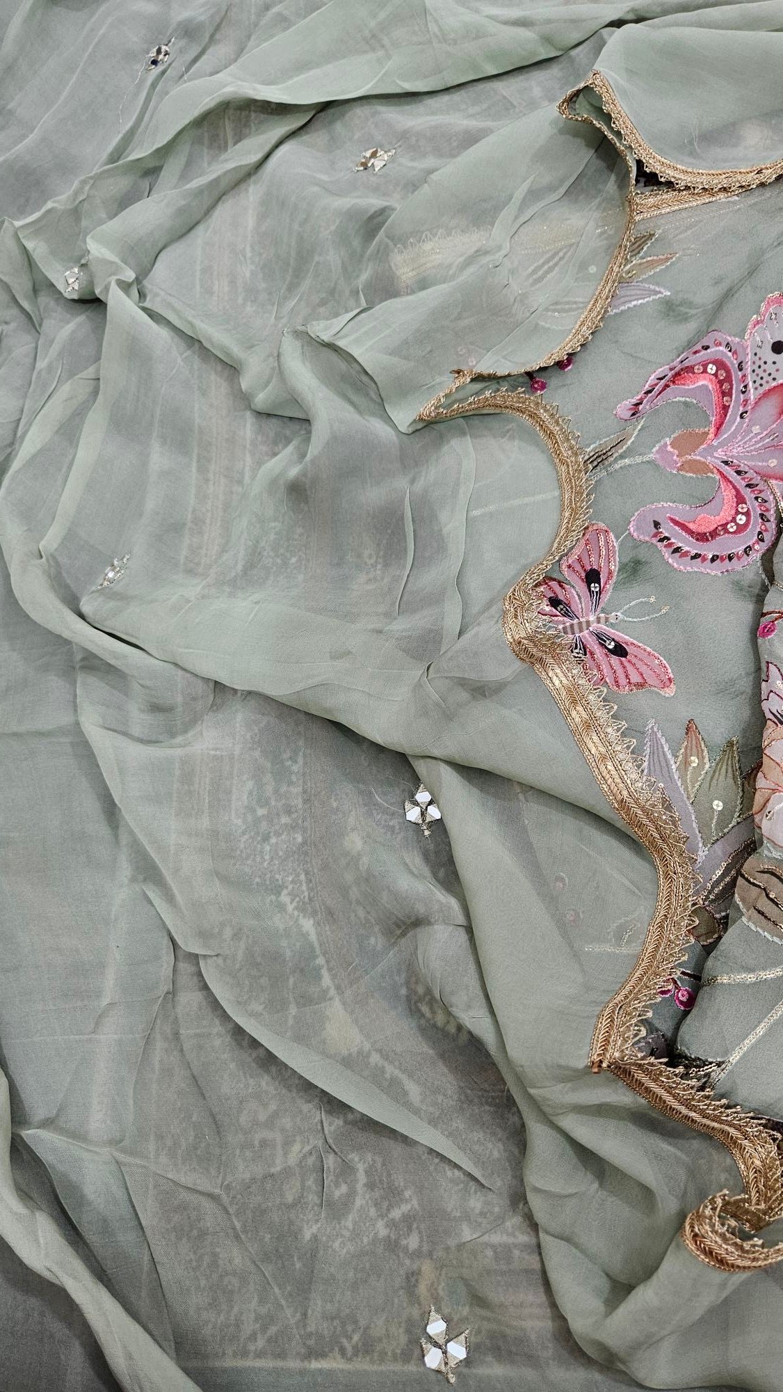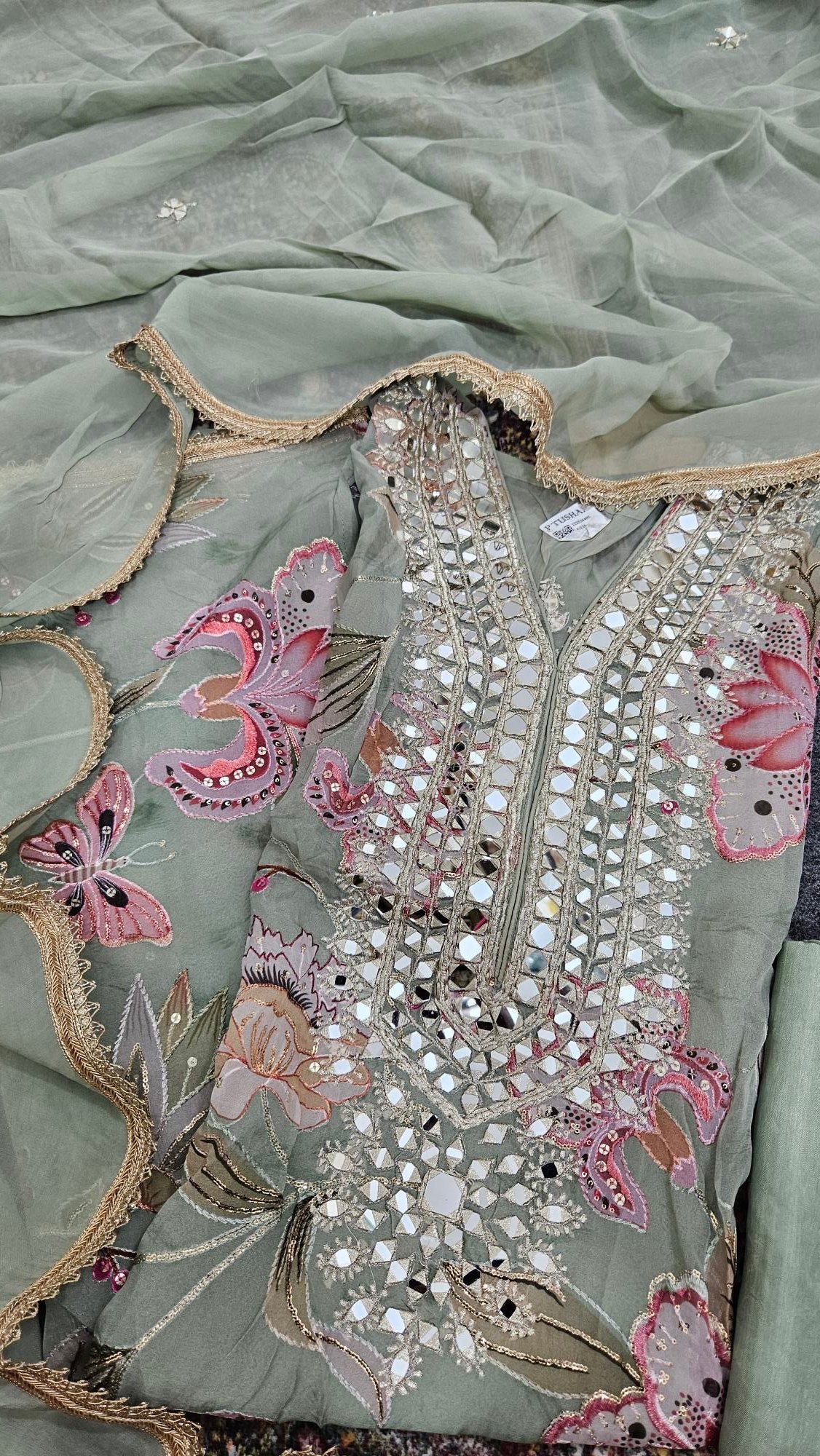 A luxurious organza outfit with intricate mirror embroidery on the shirt, sleeves, and dupatta — ideal for formal occasions, weddings, or festive nights. The fabric has a graceful fall and shines subtly in light.