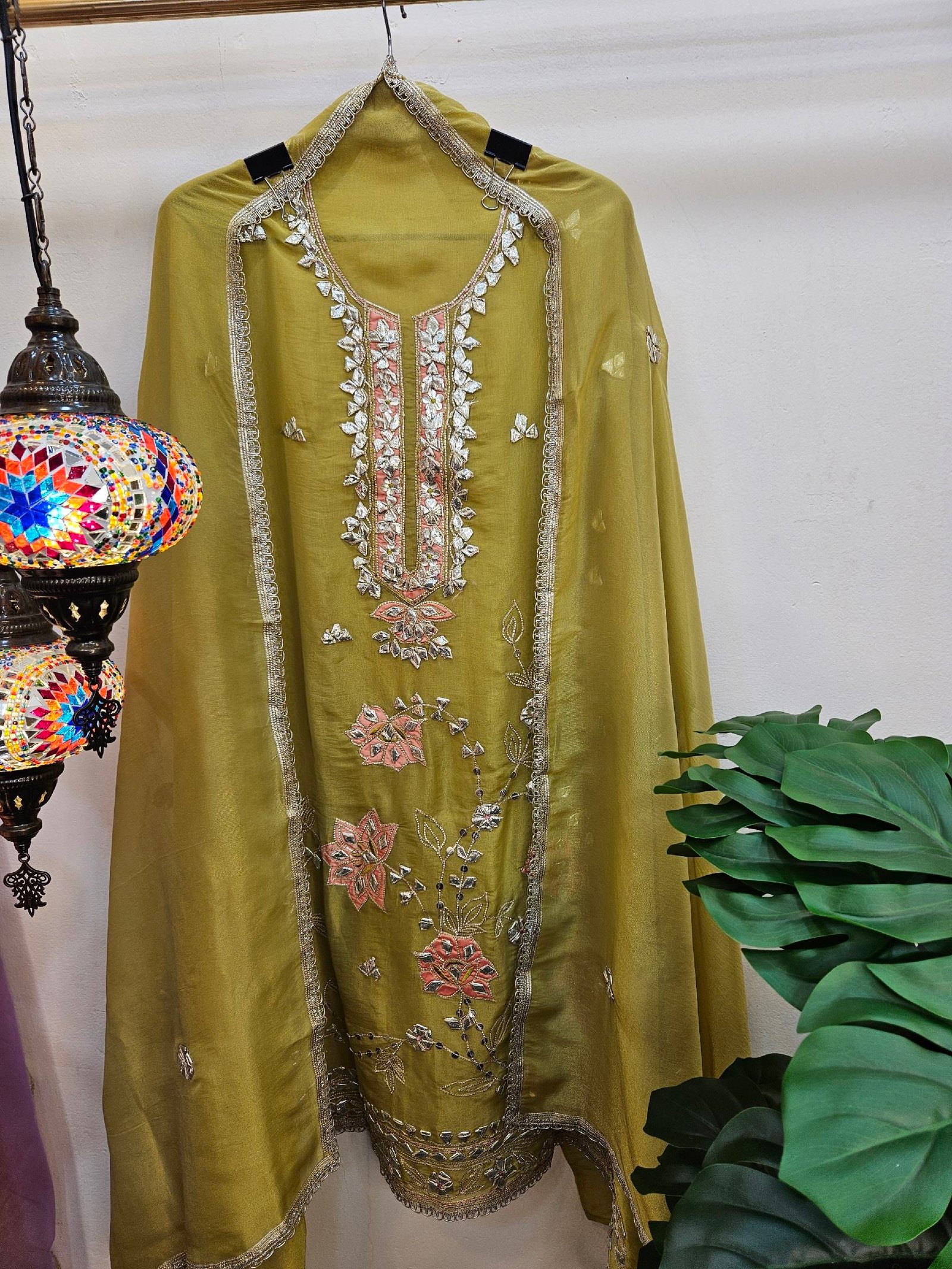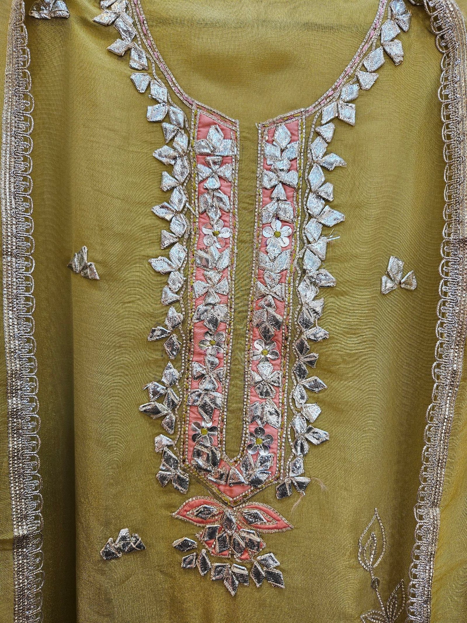 Pure simar fabric with heavy gotta work and elegant patch detailing for a rich festive look.