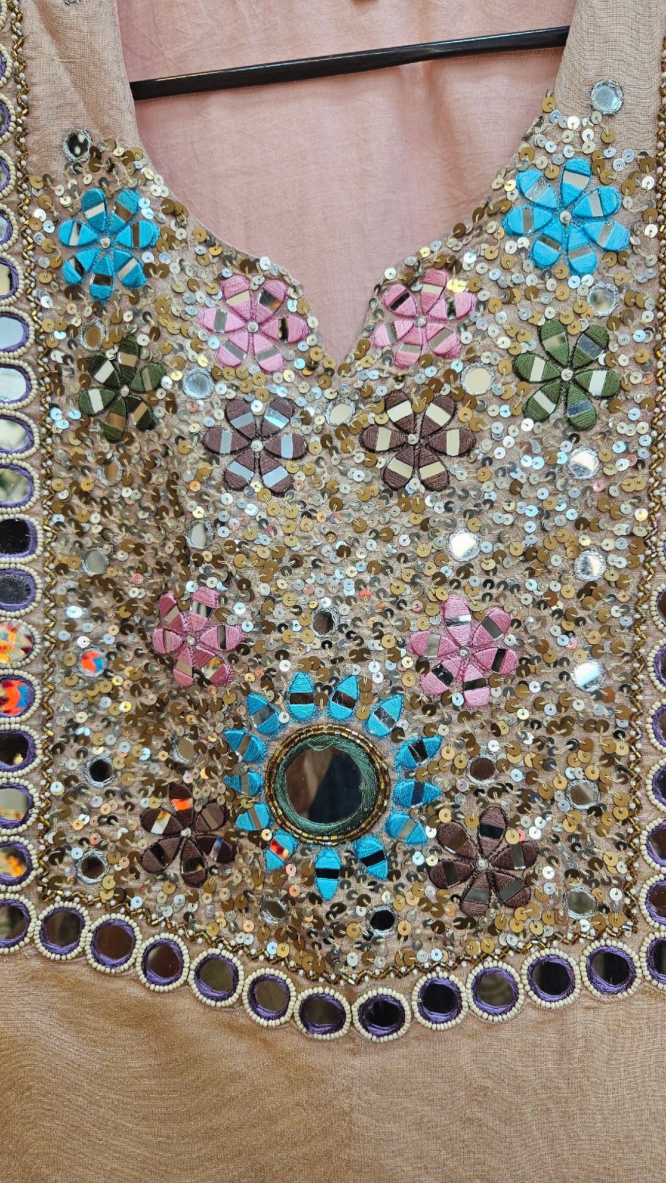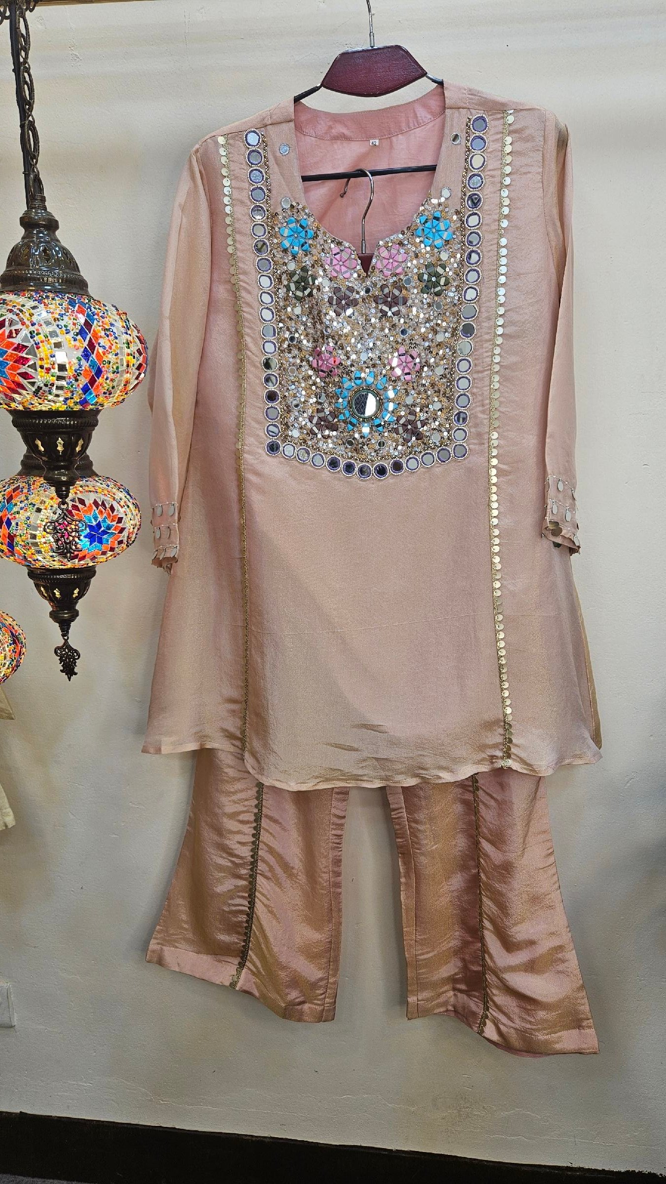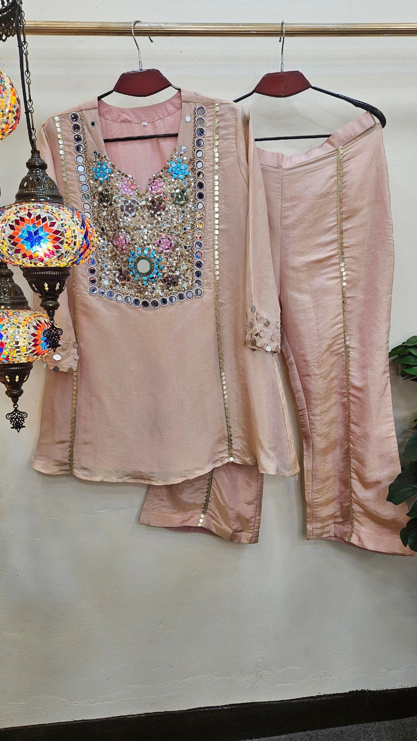 The outfit features intricate hand mirror work detailing on the neckline and sleeves, adding a subtle festive sparkle. Designed with a smart, tailored silhouette for a modern yet elegant look, paired with perfectly coordinated straight pants for effortless style and comfort.