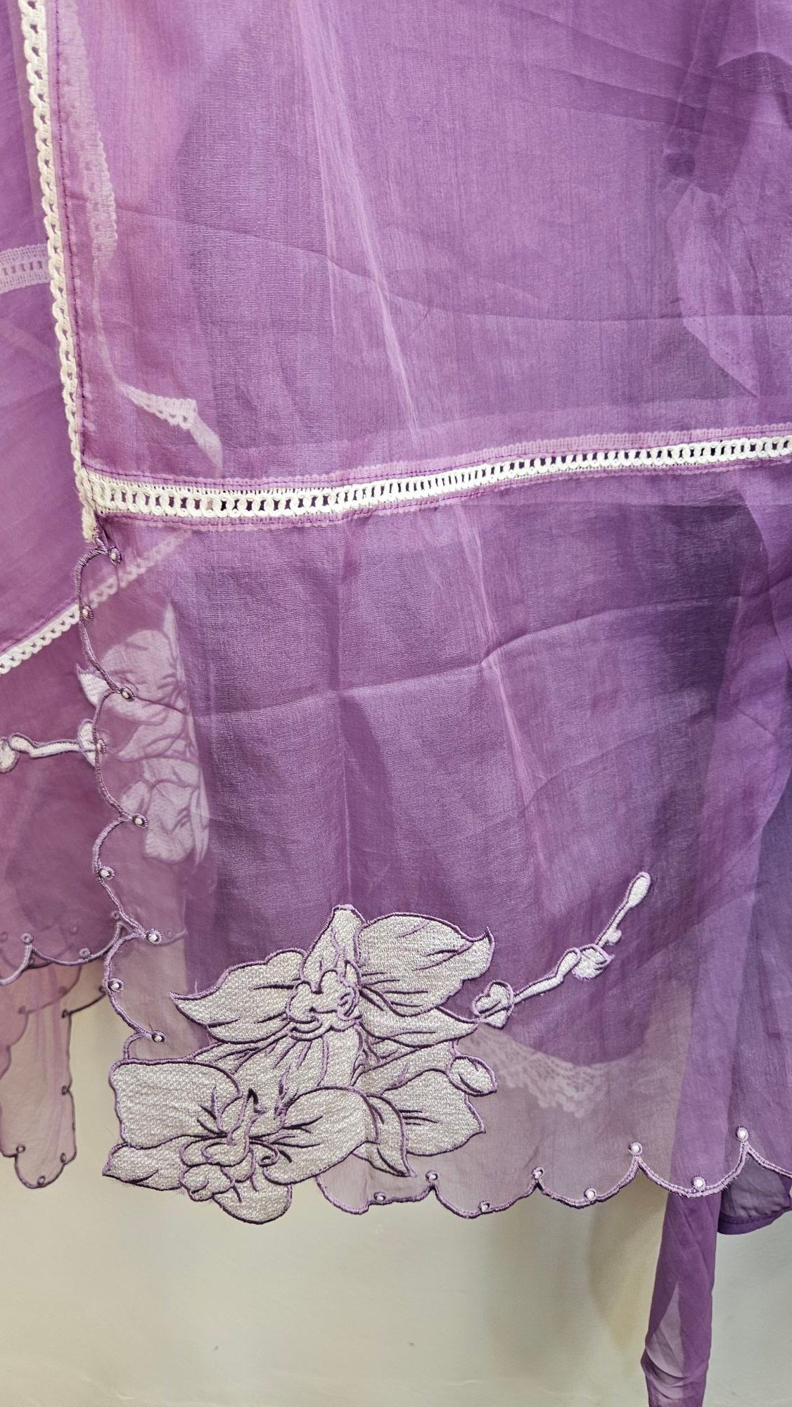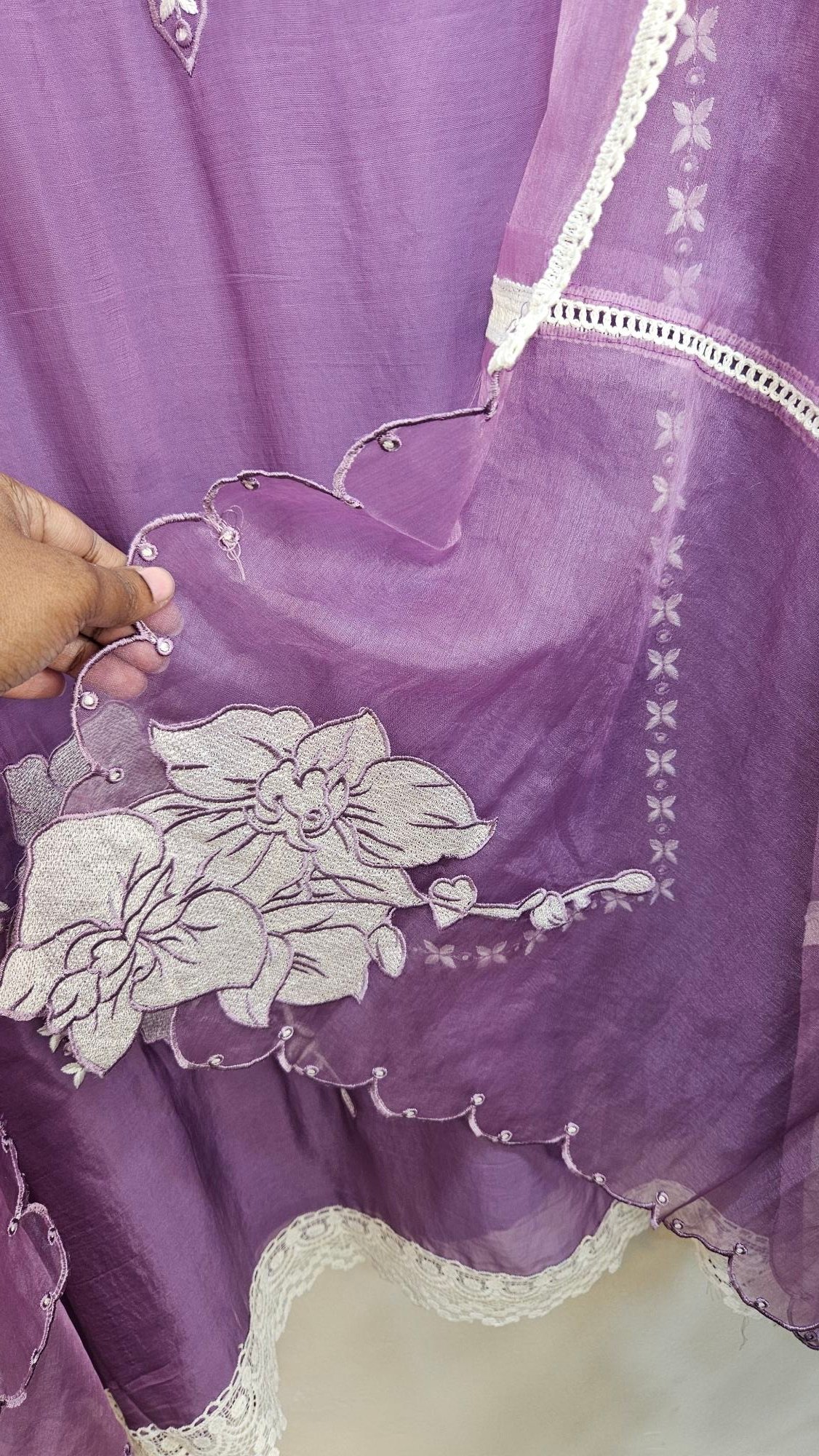 Pure muslin fabric beautifully adorned with elegant 3D embroidery for a rich and graceful look. Paired with a soft tissue dupatta featuring a delicate cutwork border and 3D embroidery detailing at the corners.