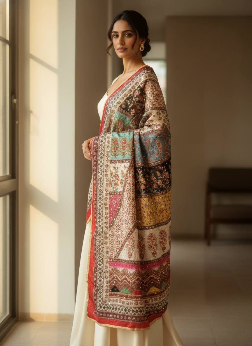 Multicolor Chinon Silk Dupatta with Mirror & Pearl Work
