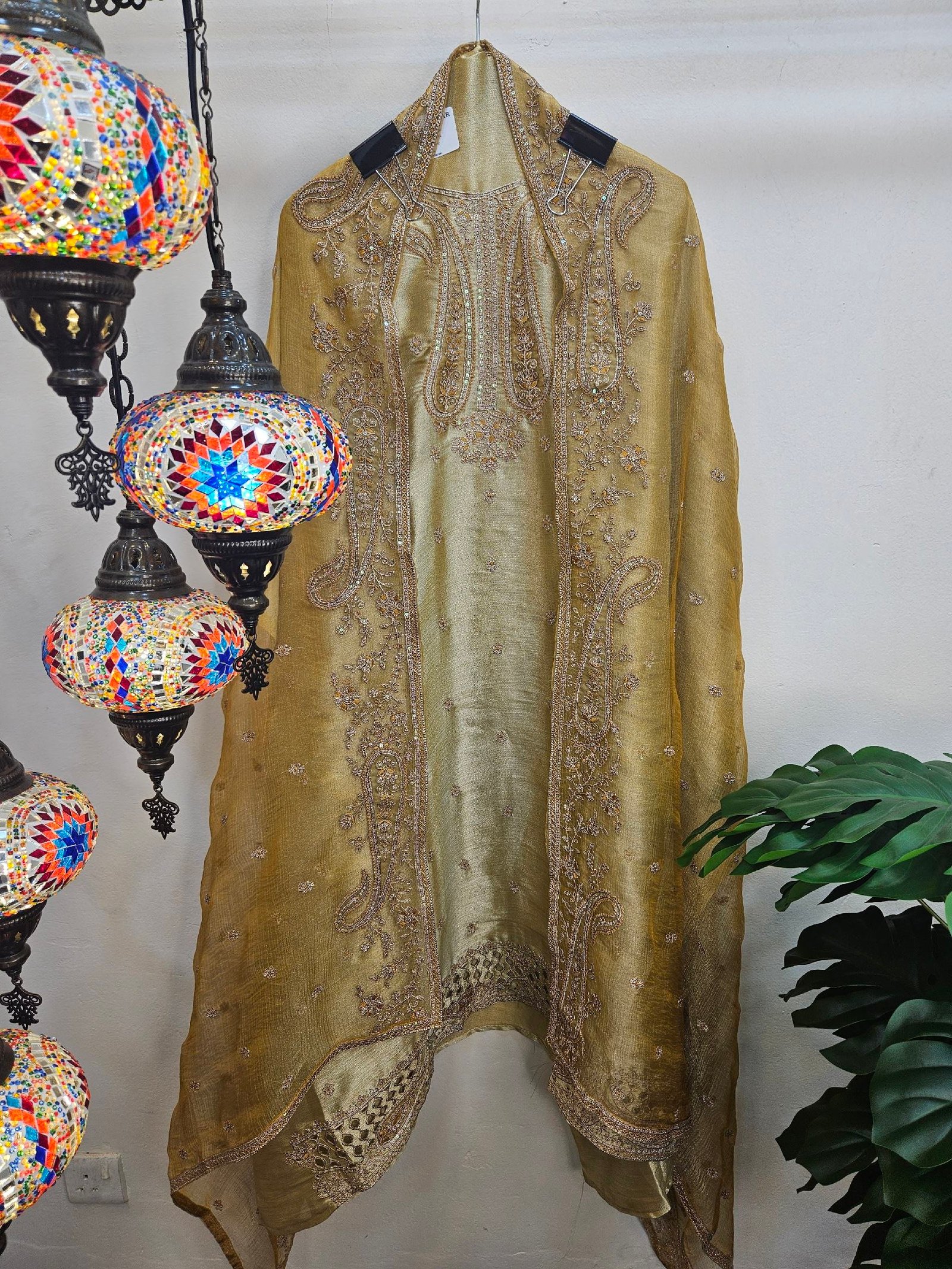 Pure Simar raw silk fabric with a stunning metallic finish, beautifully enhanced with elegant embroidery and intricate cutwork detailing. Paired with a graceful crush tissue Simar dupatta featuring delicate cutwork embroidery that adds charm and sophistication. Completed with a smooth Italian silk bottom for a rich and refined look.