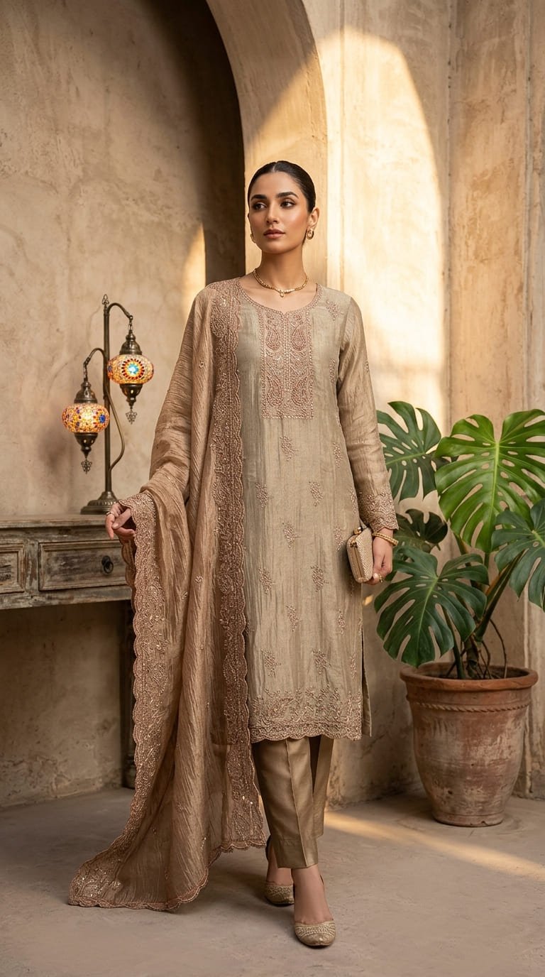 Pure Simar raw silk fabric with a stunning metallic finish, beautifully enhanced with elegant embroidery and intricate cutwork detailing. Paired with a graceful crush tissue Simar dupatta featuring delicate cutwork embroidery that adds charm and sophistication. Completed with a smooth Italian silk bottom for a rich and refined look.