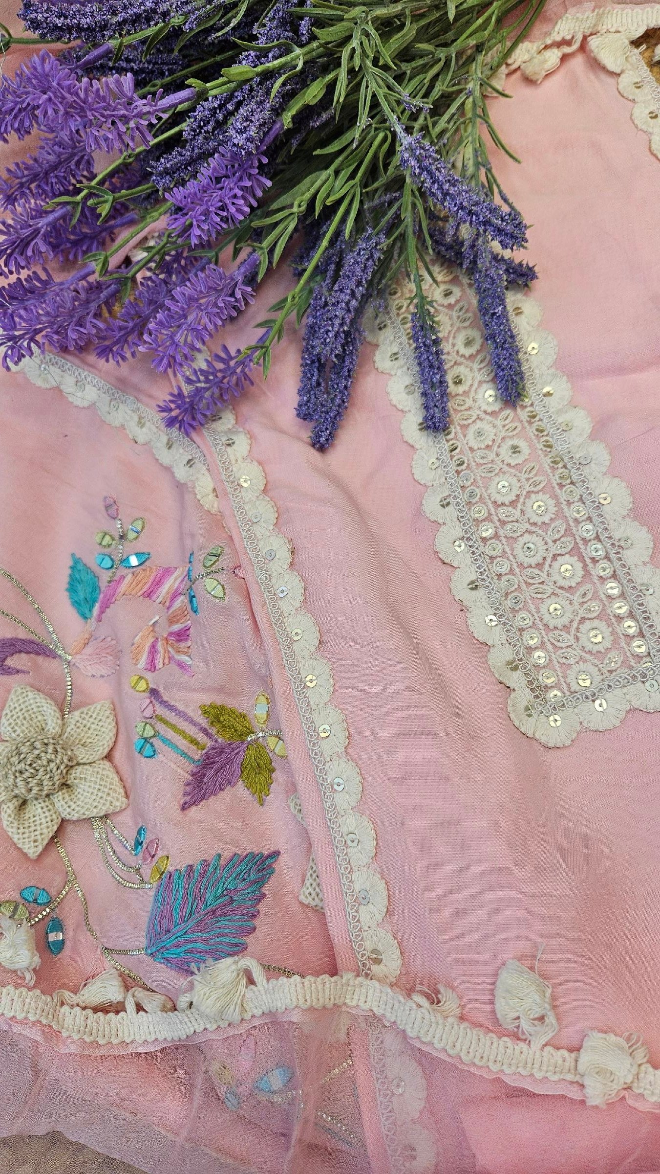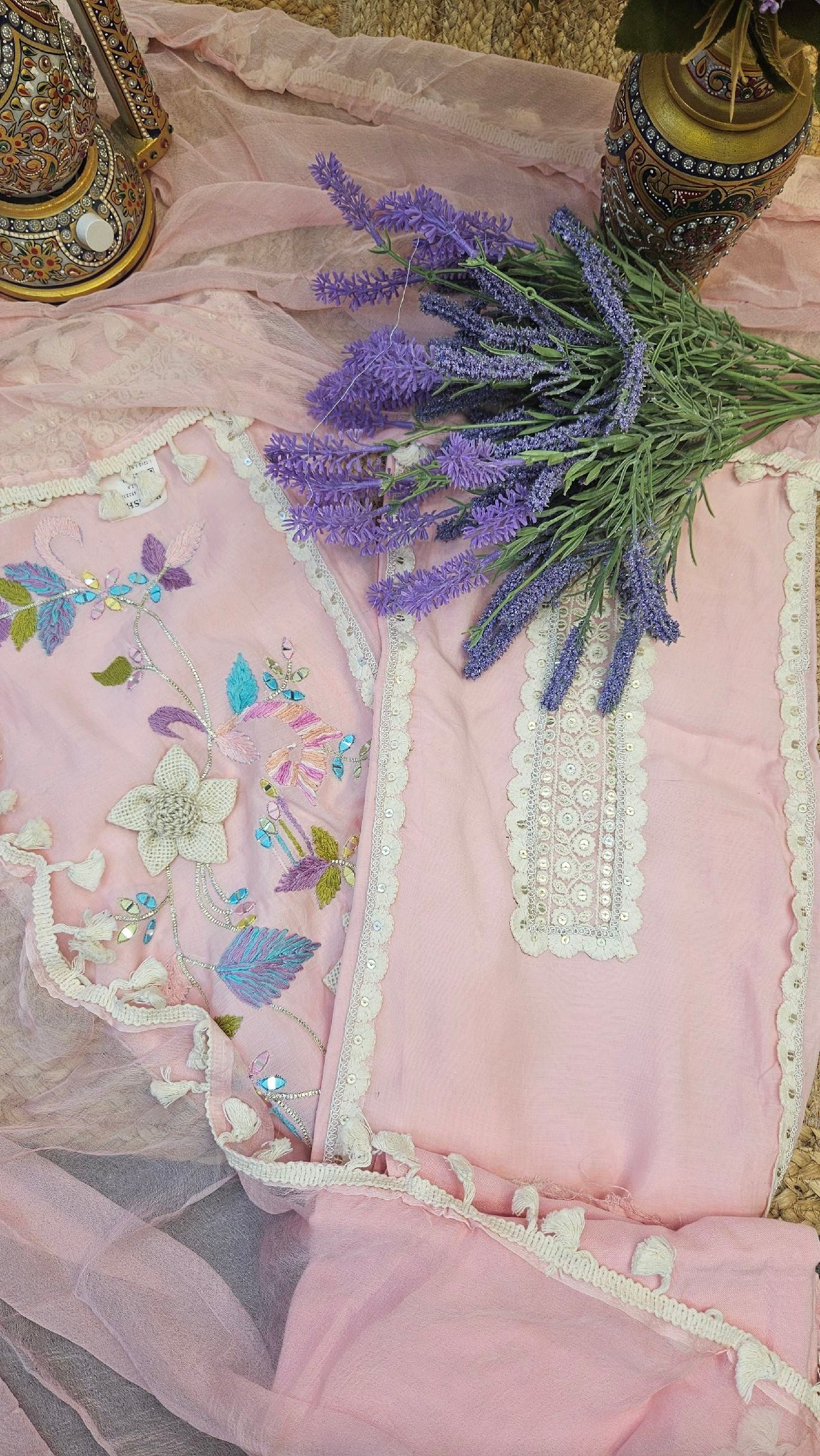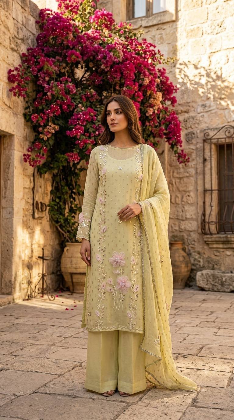 Pure soft muslin fabric beautifully adorned with Parsi embroidery, mirror detailing, and elegant 3D jute flower work on the dress. Paired with a lightweight chiffon dupatta finished with delicate lace work and a comfortable santoon bottom. Designed in light pastel shades for a fresh, soft summer vibe — graceful, classy, and effortlessly elegant. 🌸