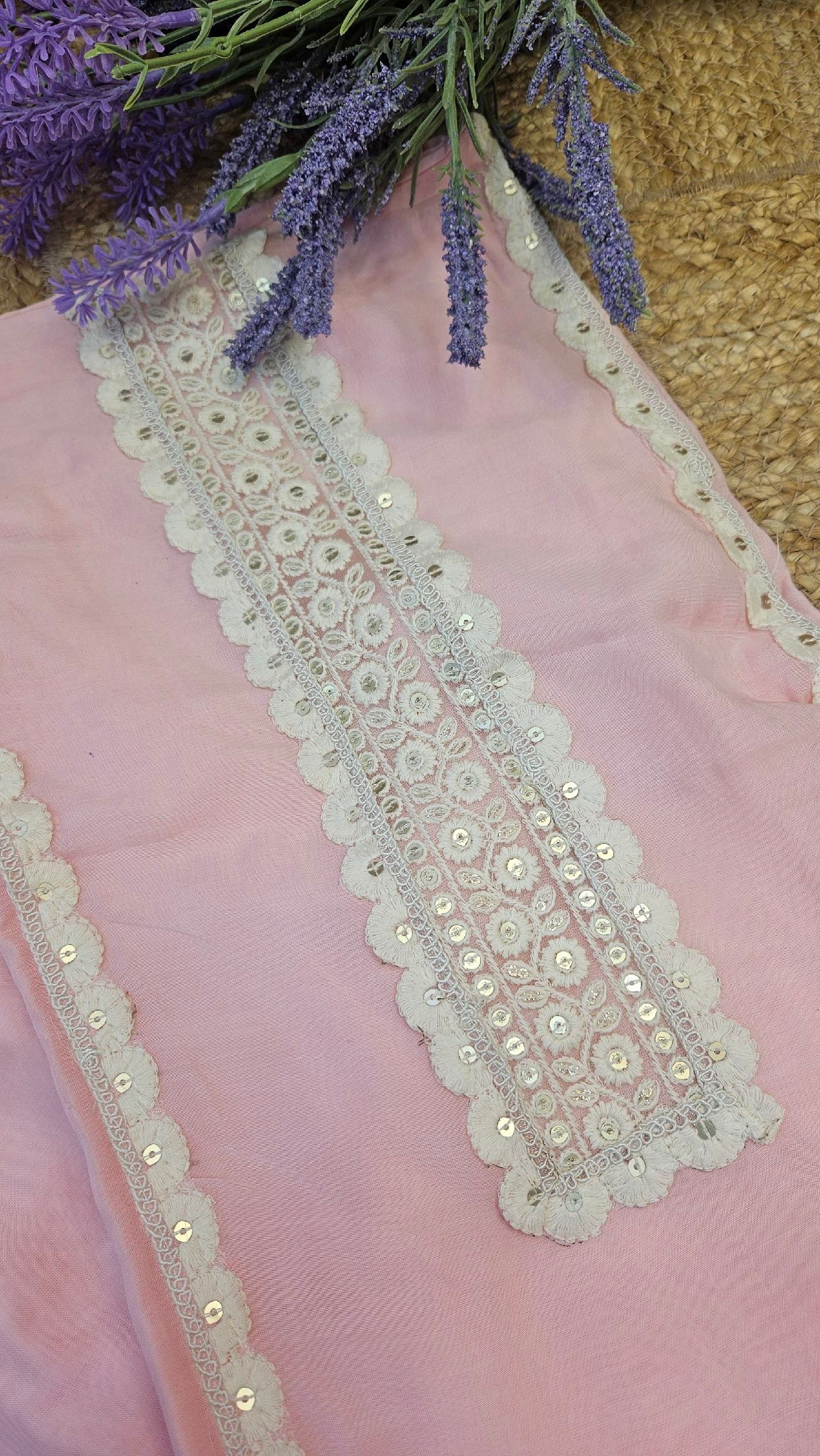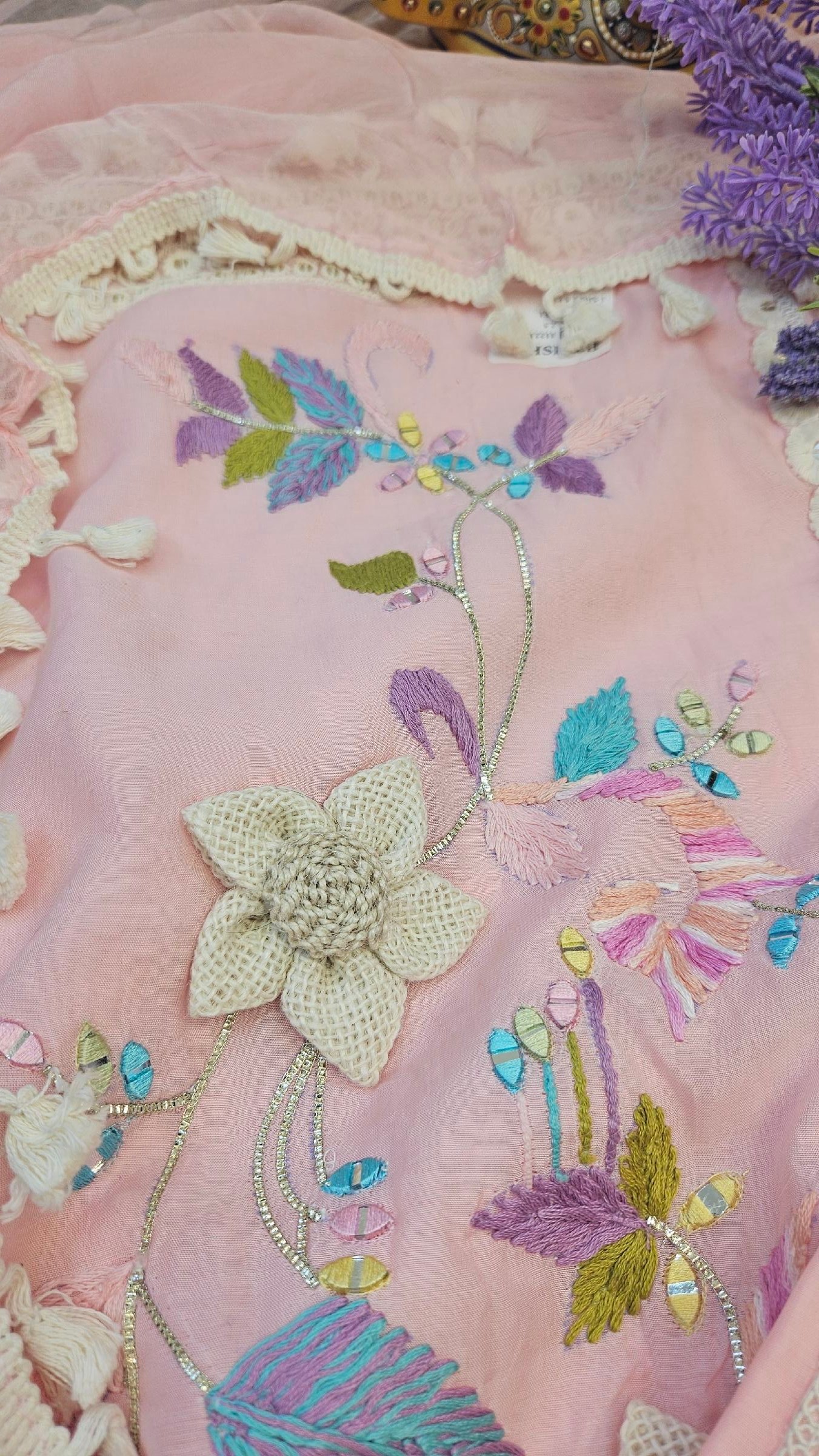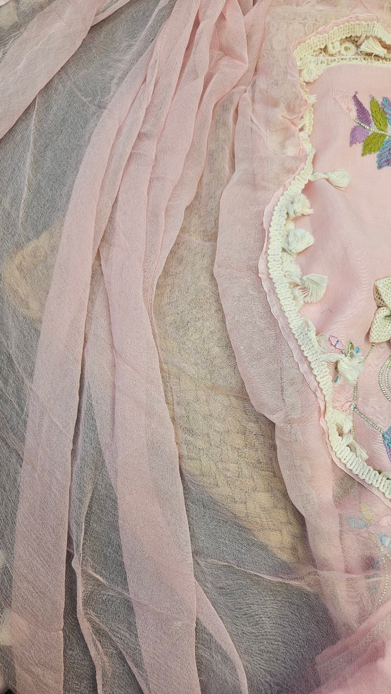 Pure soft muslin fabric beautifully adorned with Parsi embroidery, mirror detailing, and elegant 3D jute flower work on the dress. Paired with a lightweight chiffon dupatta finished with delicate lace work and a comfortable santoon bottom. Designed in light pastel shades for a fresh, soft summer vibe — graceful, classy, and effortlessly elegant. 🌸