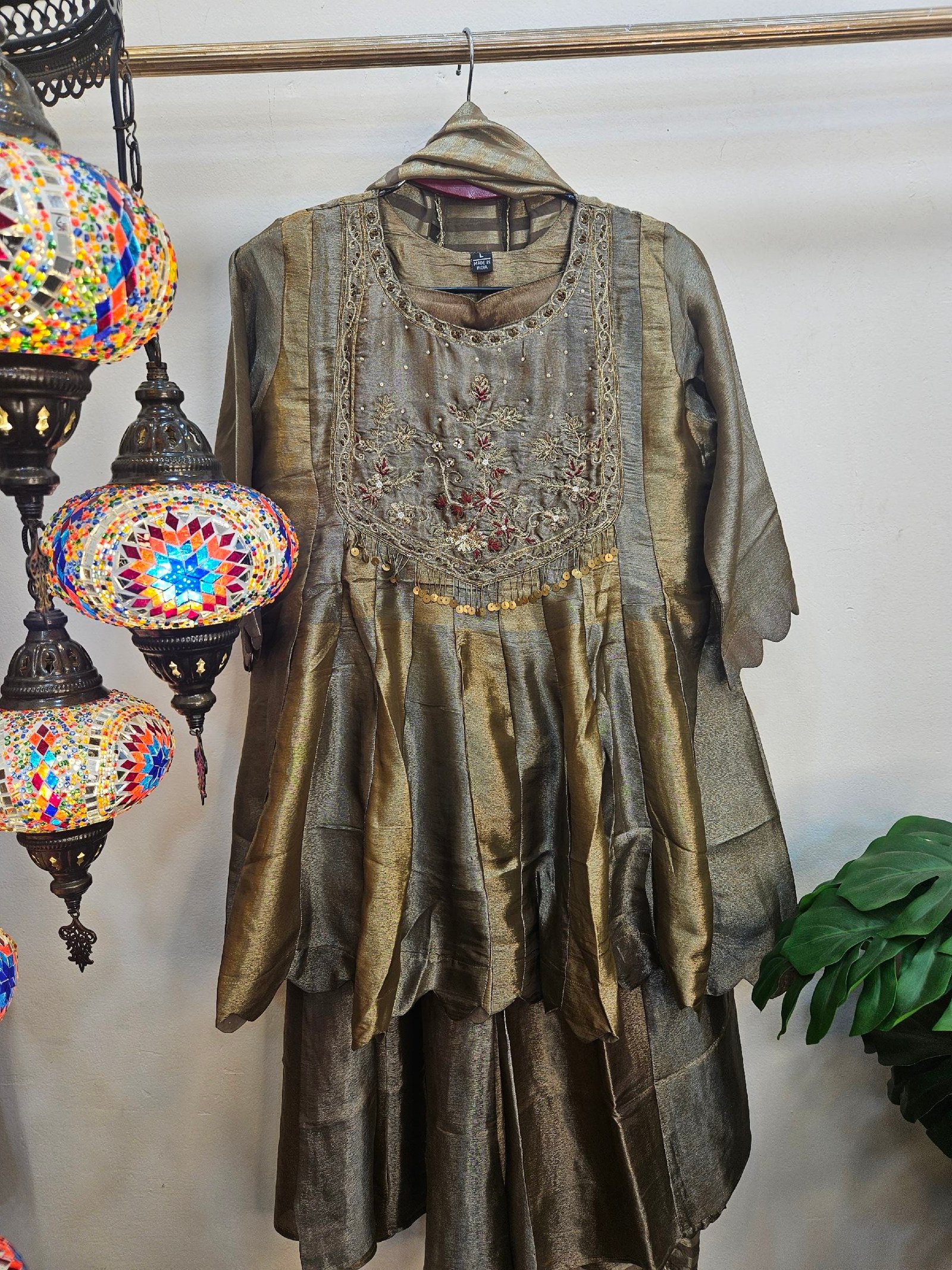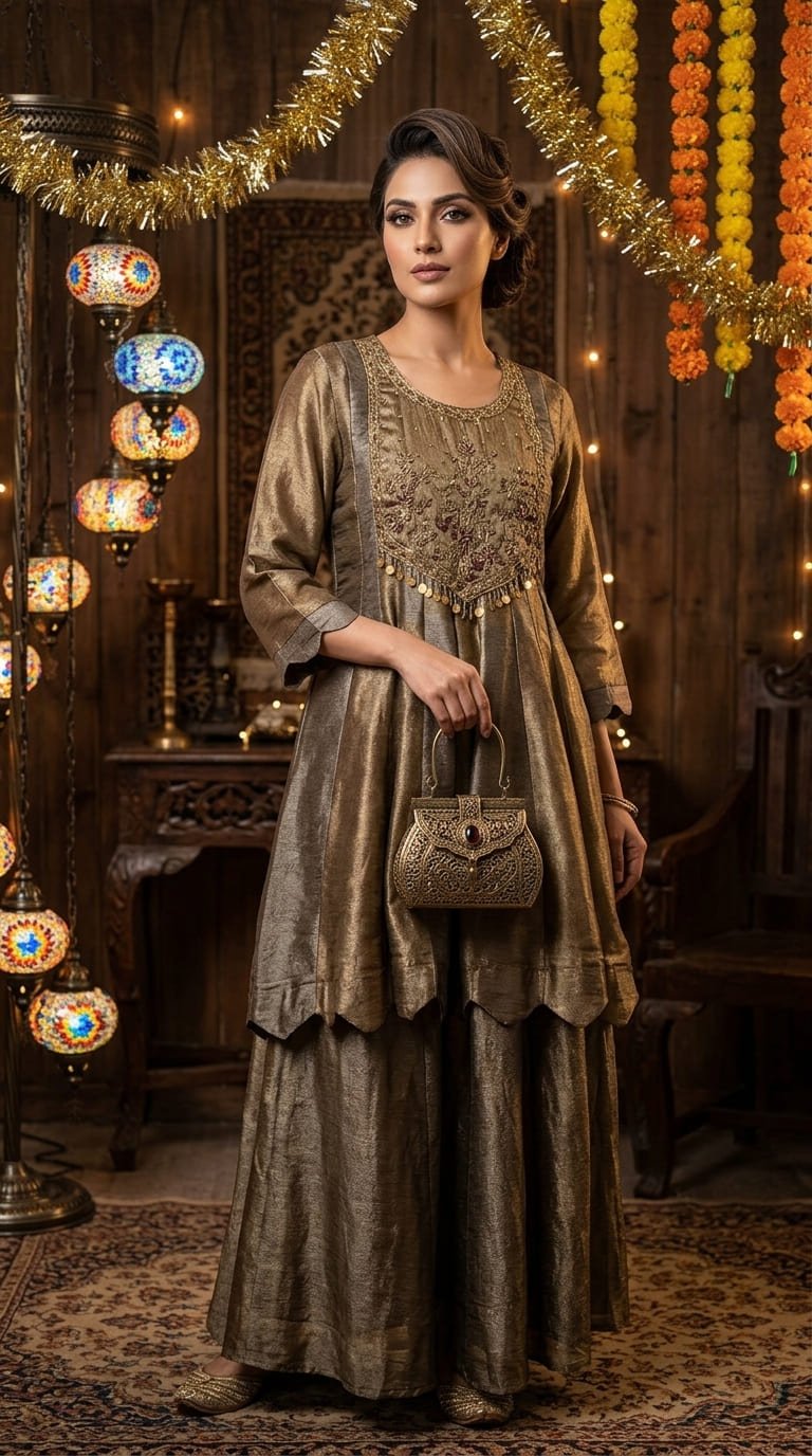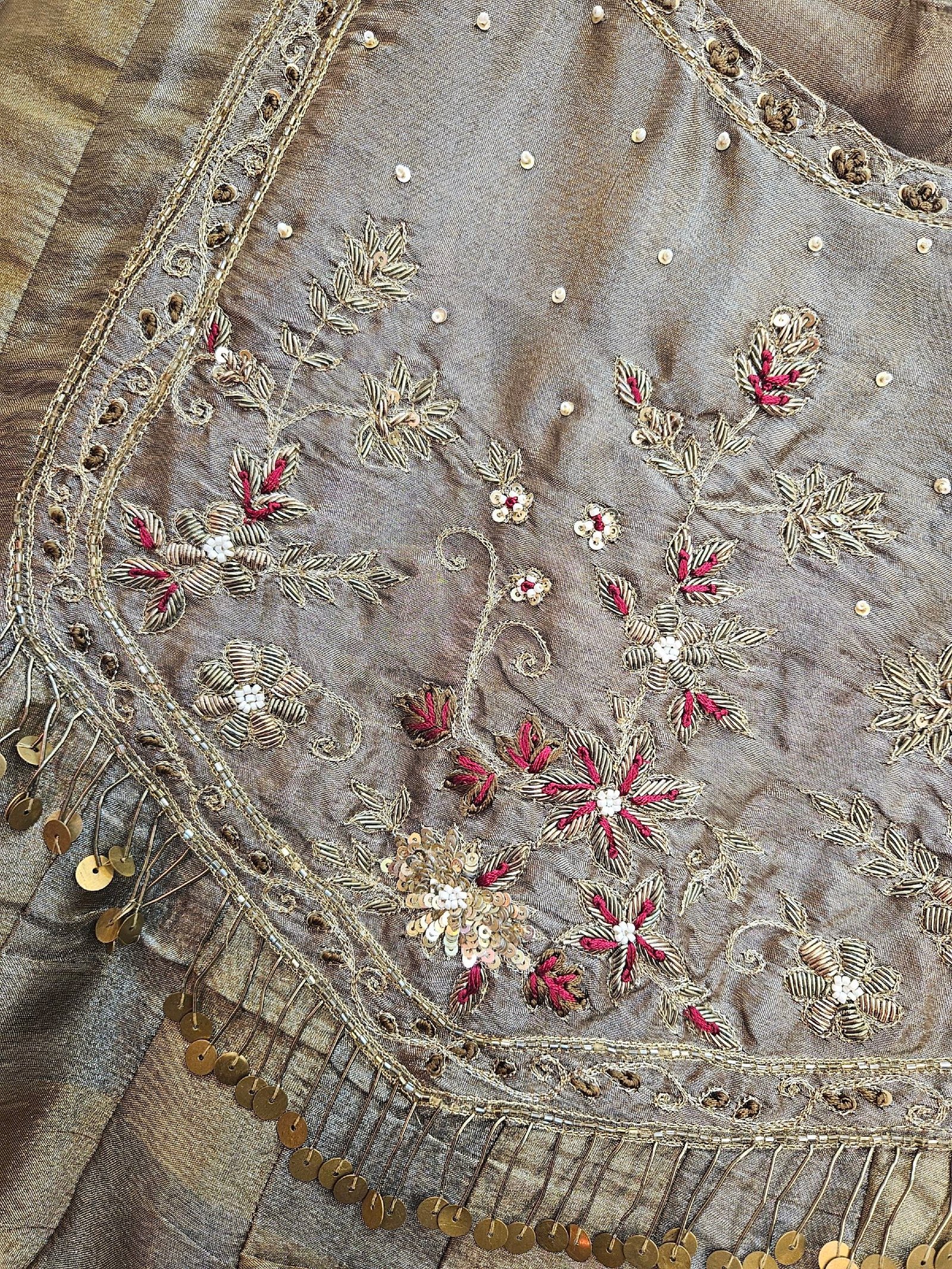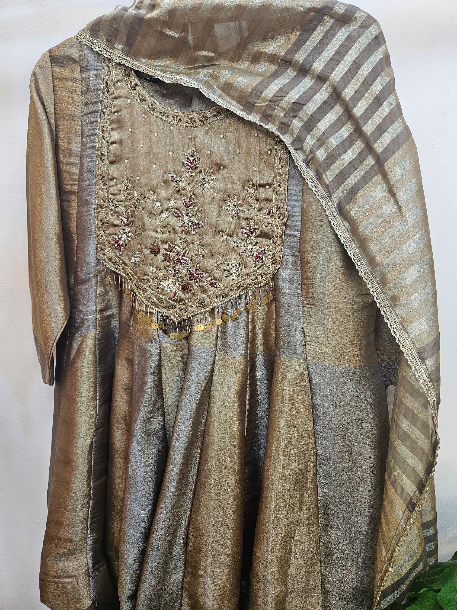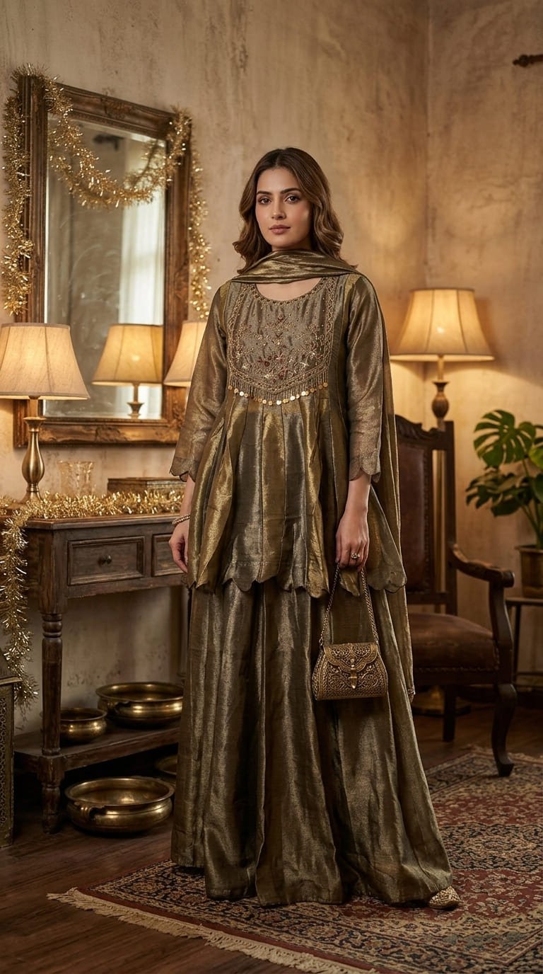 Elegant boutique piece in pure Banarasi Simar tissue silk, designed in a chic peplum-style short frock paired with a stylish divider bottom. The dual-tone ensemble is beautifully enhanced with intricate zardozi work on the neckline and daman, while the striped Simar dupatta adds a contemporary flair. A perfect blend of modern silhouette, luxury, and comfort for a graceful statement look.