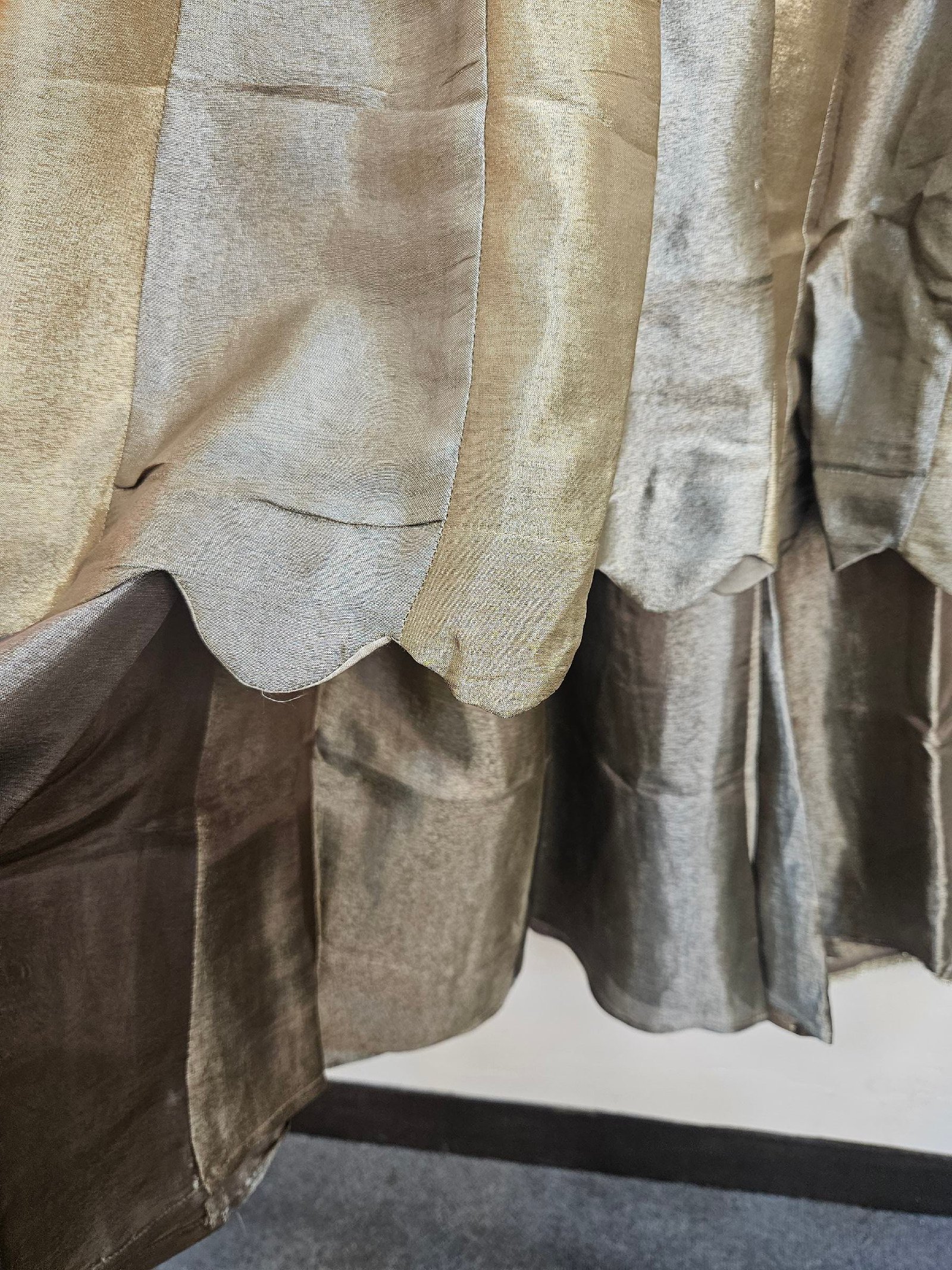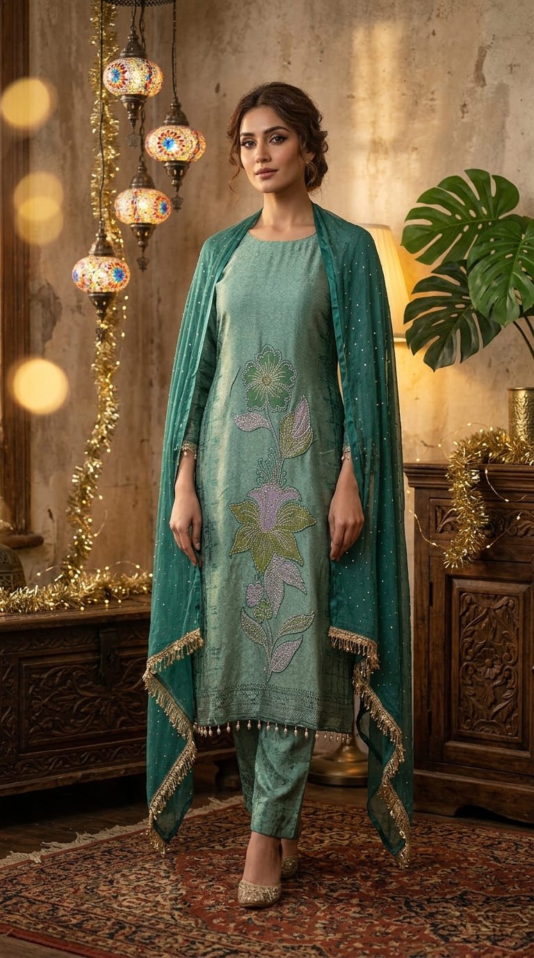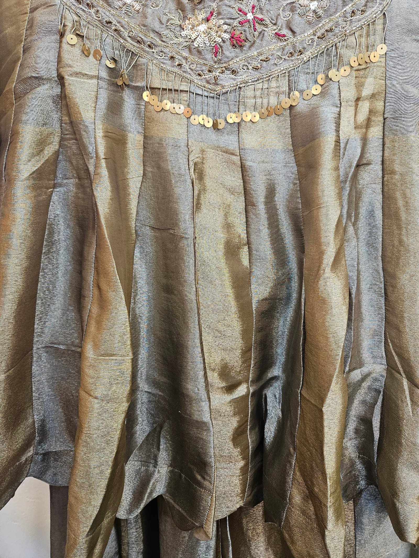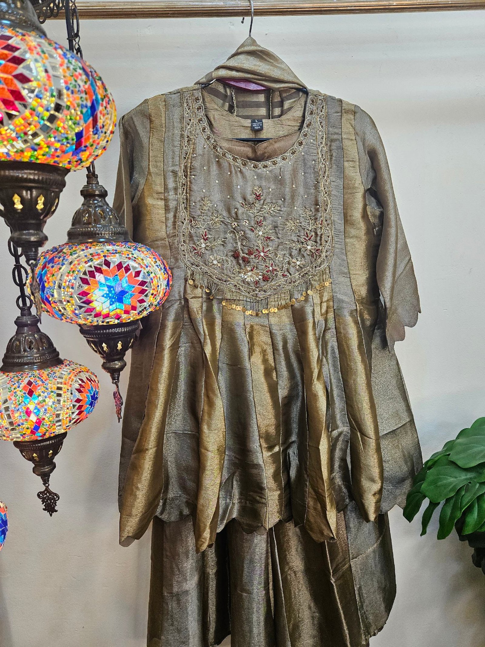 Elegant boutique piece in pure Banarasi Simar tissue silk, designed in a chic peplum-style short frock paired with a stylish divider bottom. The dual-tone ensemble is beautifully enhanced with intricate zardozi work on the neckline and daman, while the striped Simar dupatta adds a contemporary flair. A perfect blend of modern silhouette, luxury, and comfort for a graceful statement look.