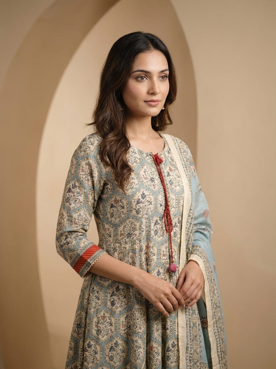 Kalamkari cotton silk floor-touch Anarkali featuring intricate traditional prints with fine detailing and a beautifully finished silhouette that flows gracefully. Designed with a subtly enhanced neckline for an elegant touch and a flattering flare for a regal look. Paired with a sophisticated cotton silk dupatta, complementing the outfit with its soft texture and refined finish. Lightweight, breathable, and comfortable—perfect for summer festivities, adding timeless charm and graceful Eid vibes.
