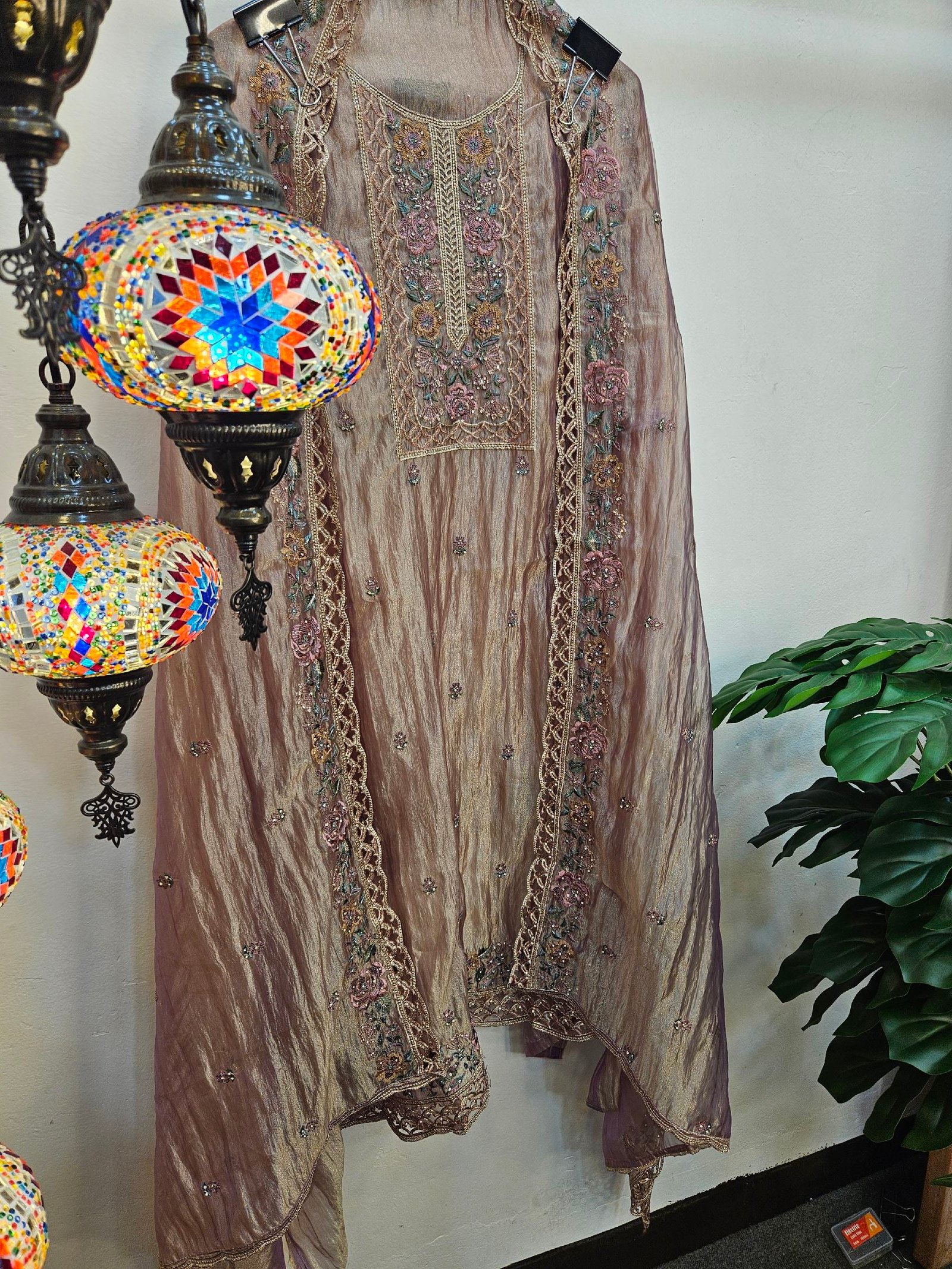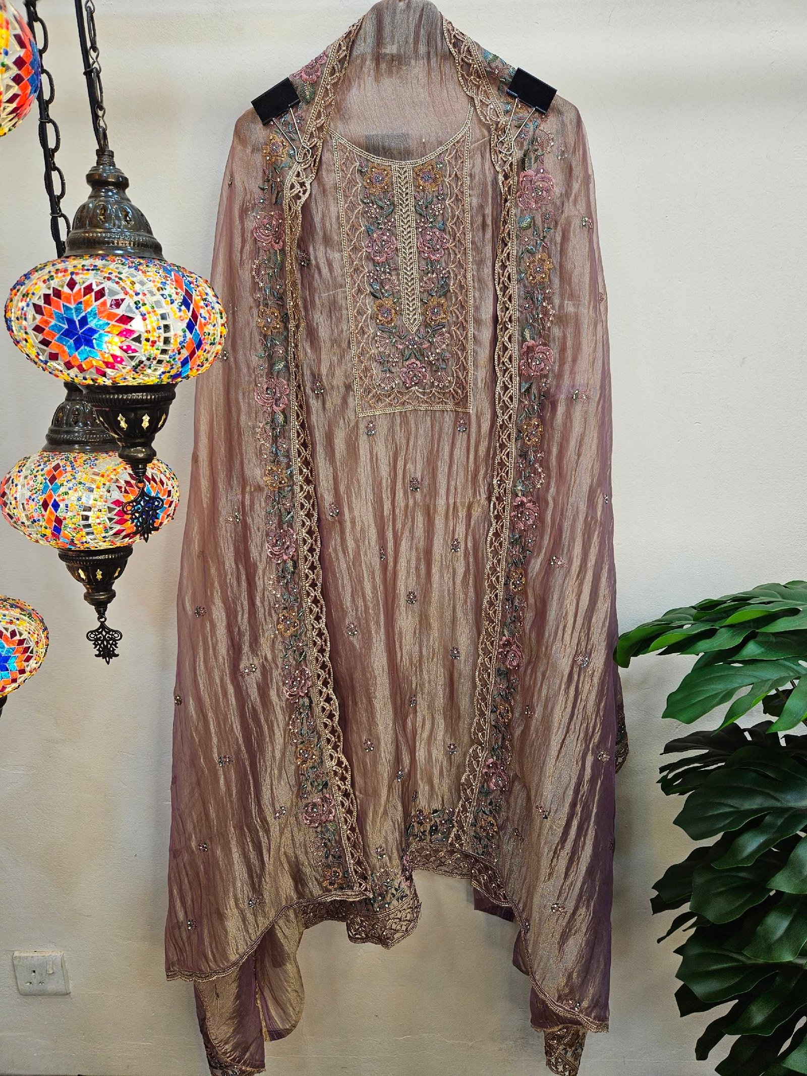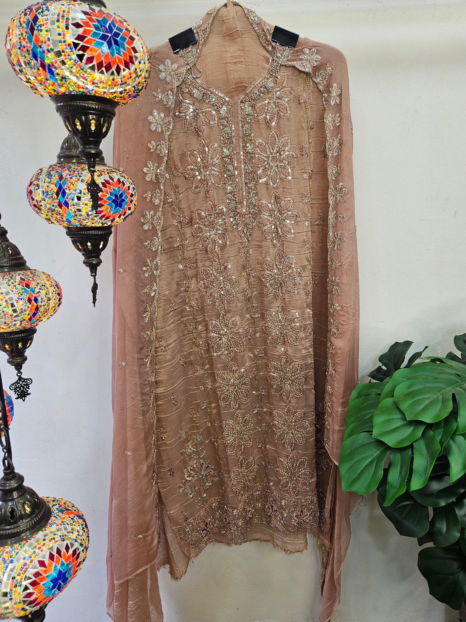 Pure crush simar fabric adorned with intricate zari thread embroidery, creating a rich and graceful look. Paired with a matching crush simar dupatta featuring elegant cutwork borders that enhance its charm. Completed with luxurious Italian silk trousers for a refined and sophisticated finish — a perfect choice for festive gatherings and special occasions.