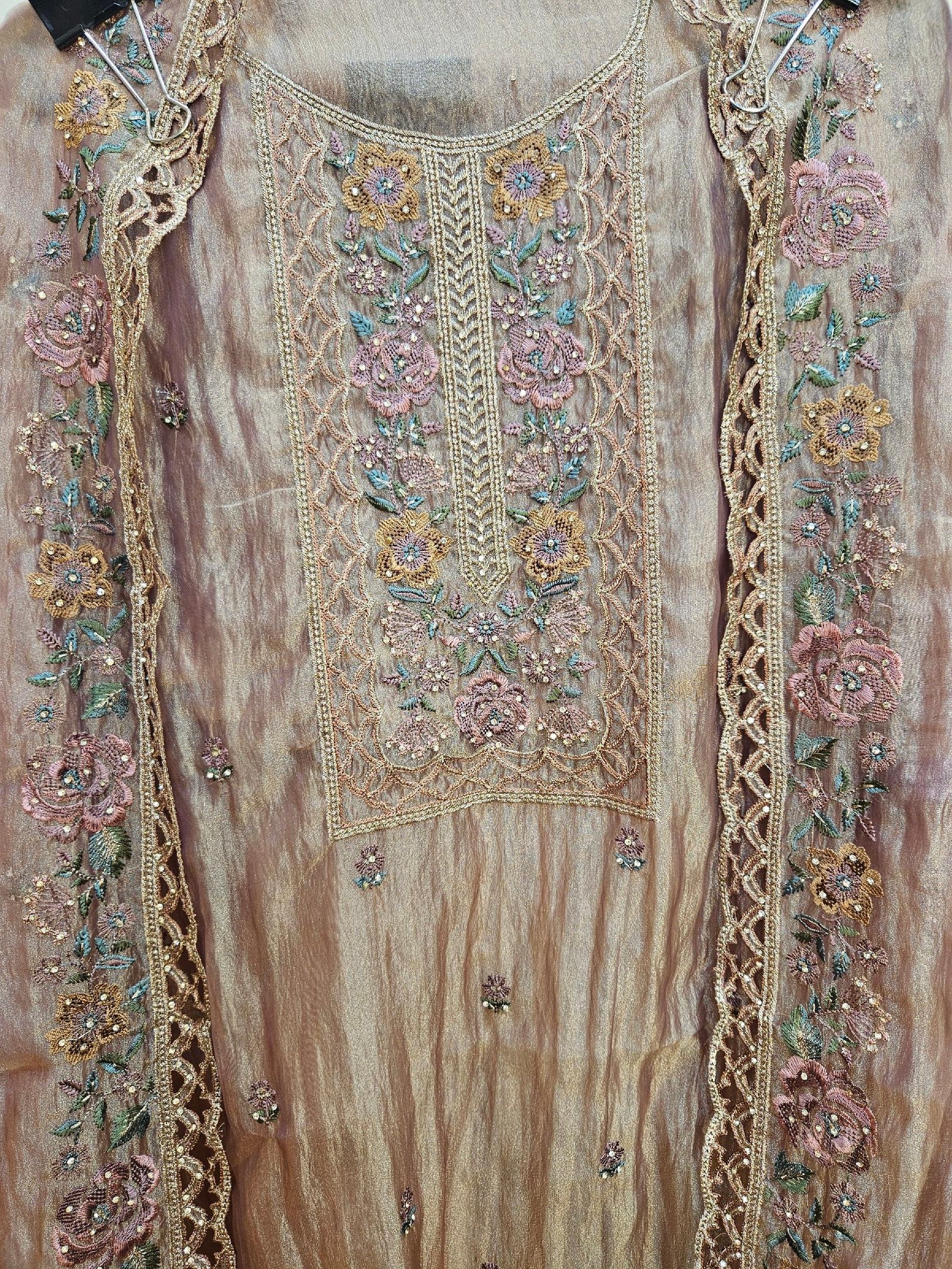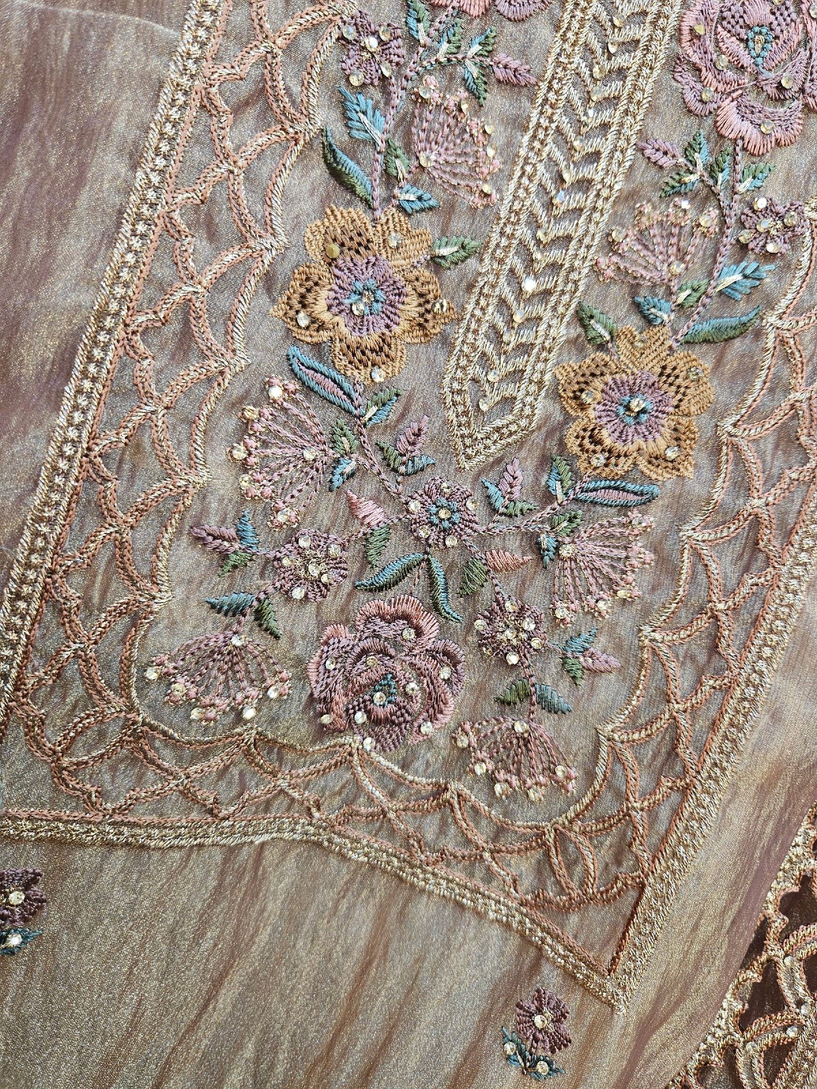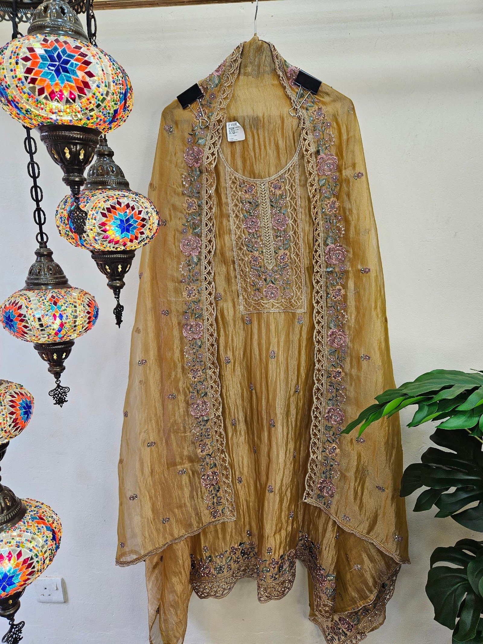 Pure crush simar fabric adorned with intricate zari thread embroidery, creating a rich and graceful look. Paired with a matching crush simar dupatta featuring elegant cutwork borders that enhance its charm. Completed with luxurious Italian silk trousers for a refined and sophisticated finish — a perfect choice for festive gatherings and special occasions.