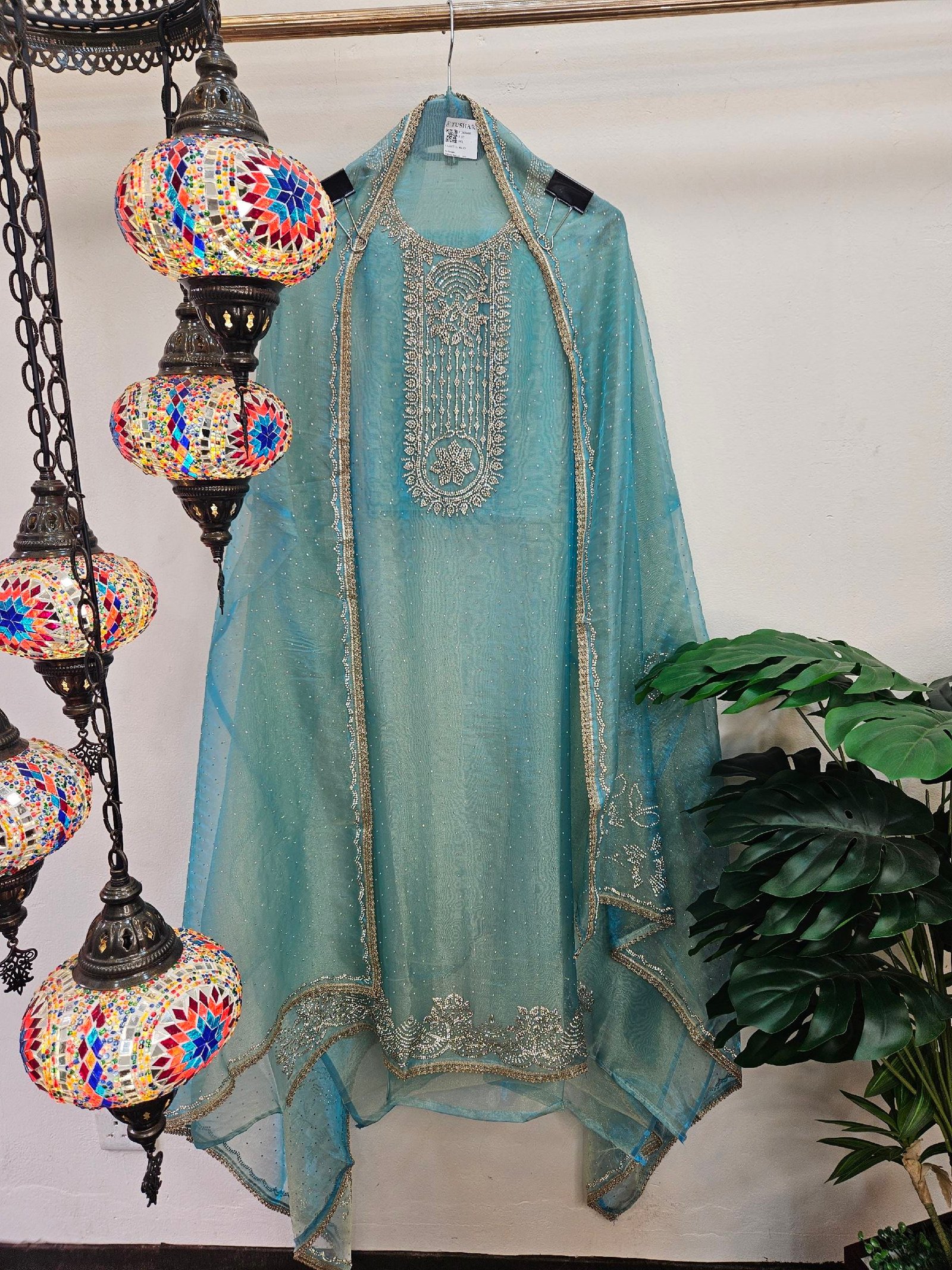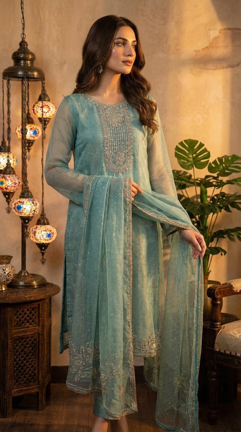 Pure crush tissue simar fabric in a soft pastel shade, beautifully adorned with all-over Swarovski stone work for a subtle yet luxurious sparkle. The matching dupatta is delicately embellished with Swarovski stones, enhancing its graceful charm. Paired with a smooth Italian silk trouser, this elegant ensemble is perfect for festive gatherings and wedding events — soft, sophisticated, and effortlessly glamorous. ✨