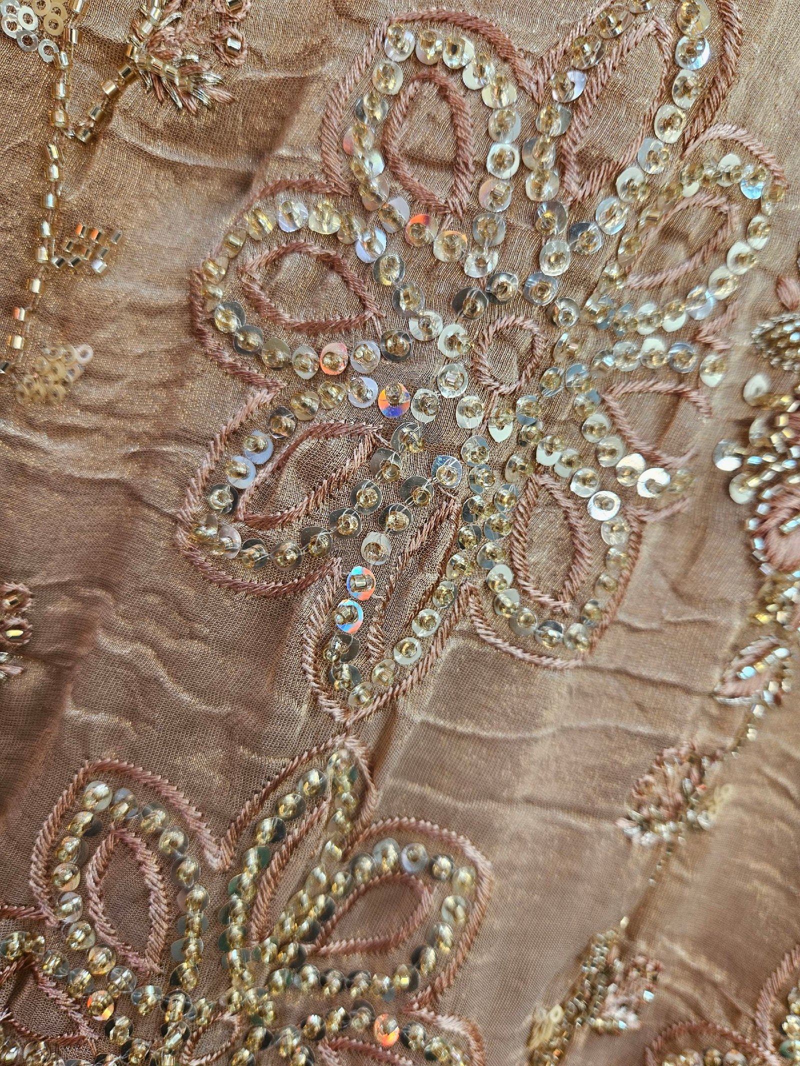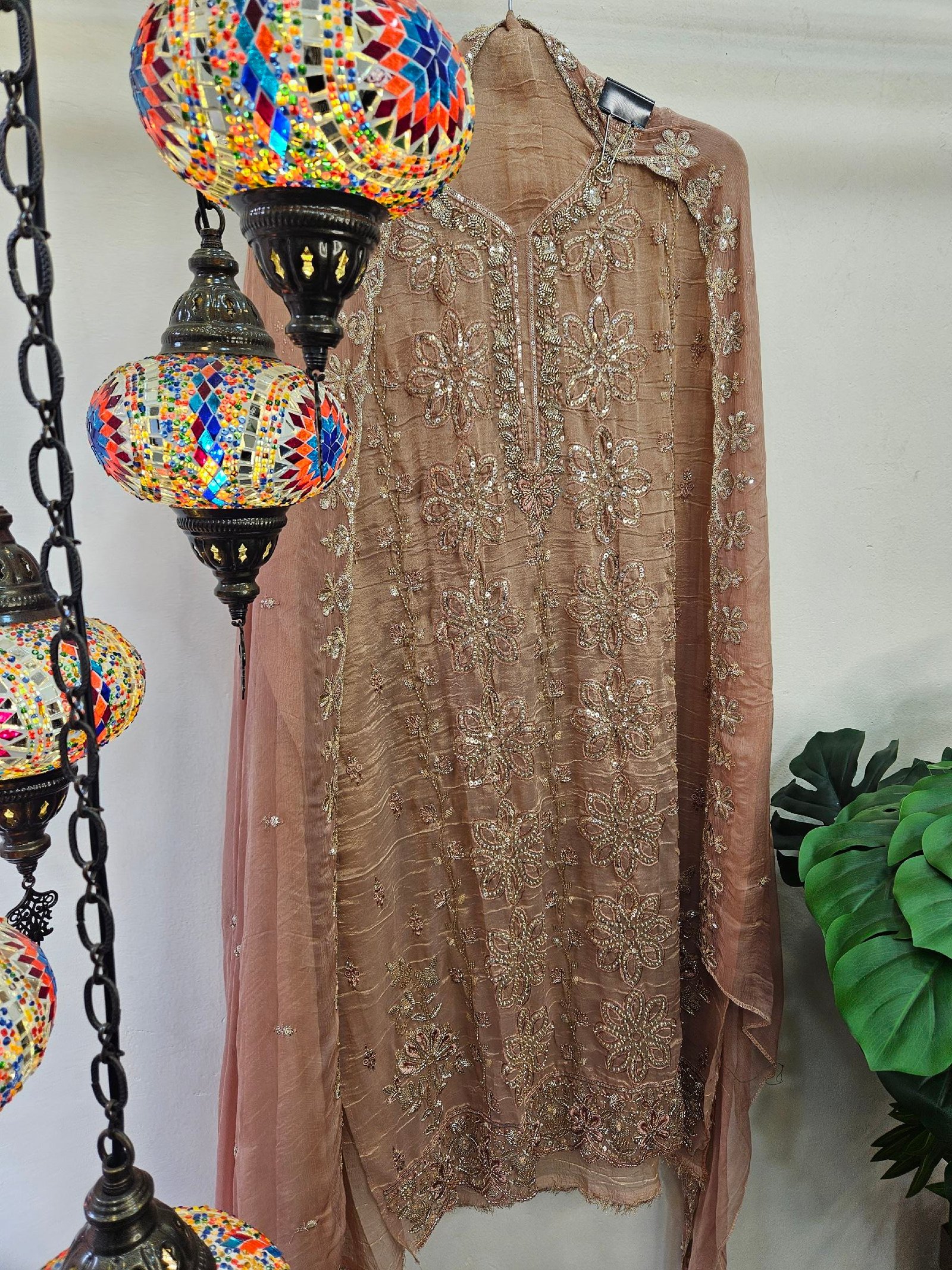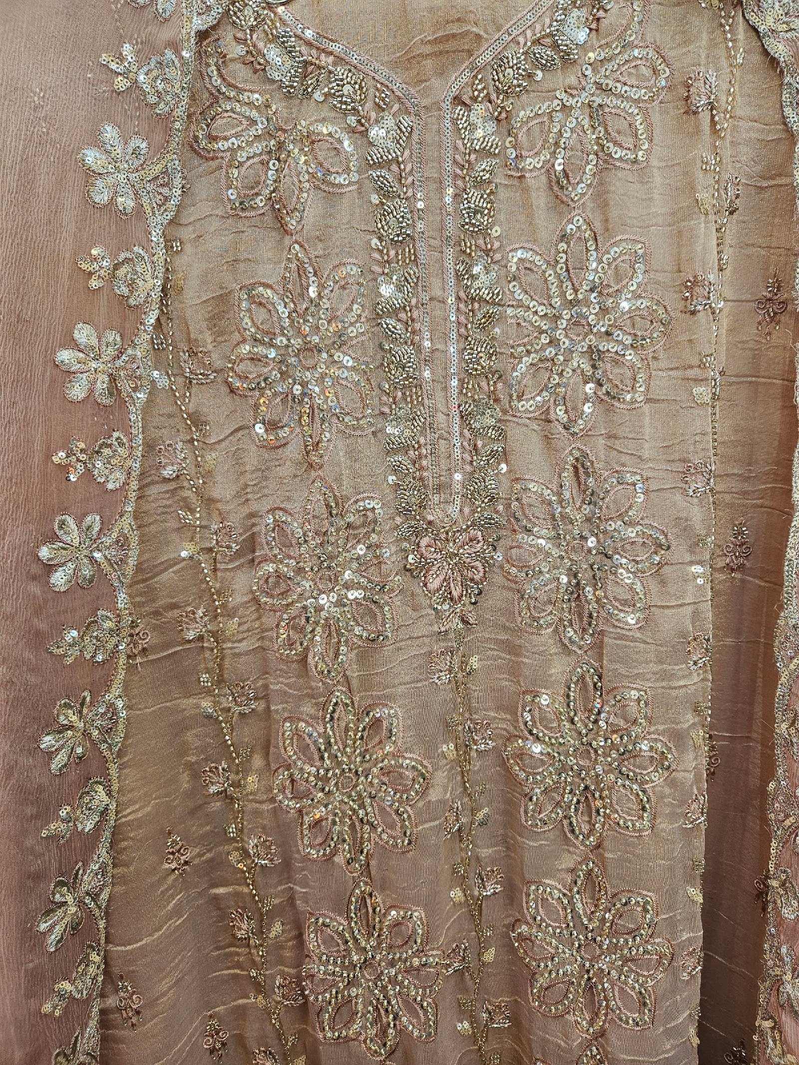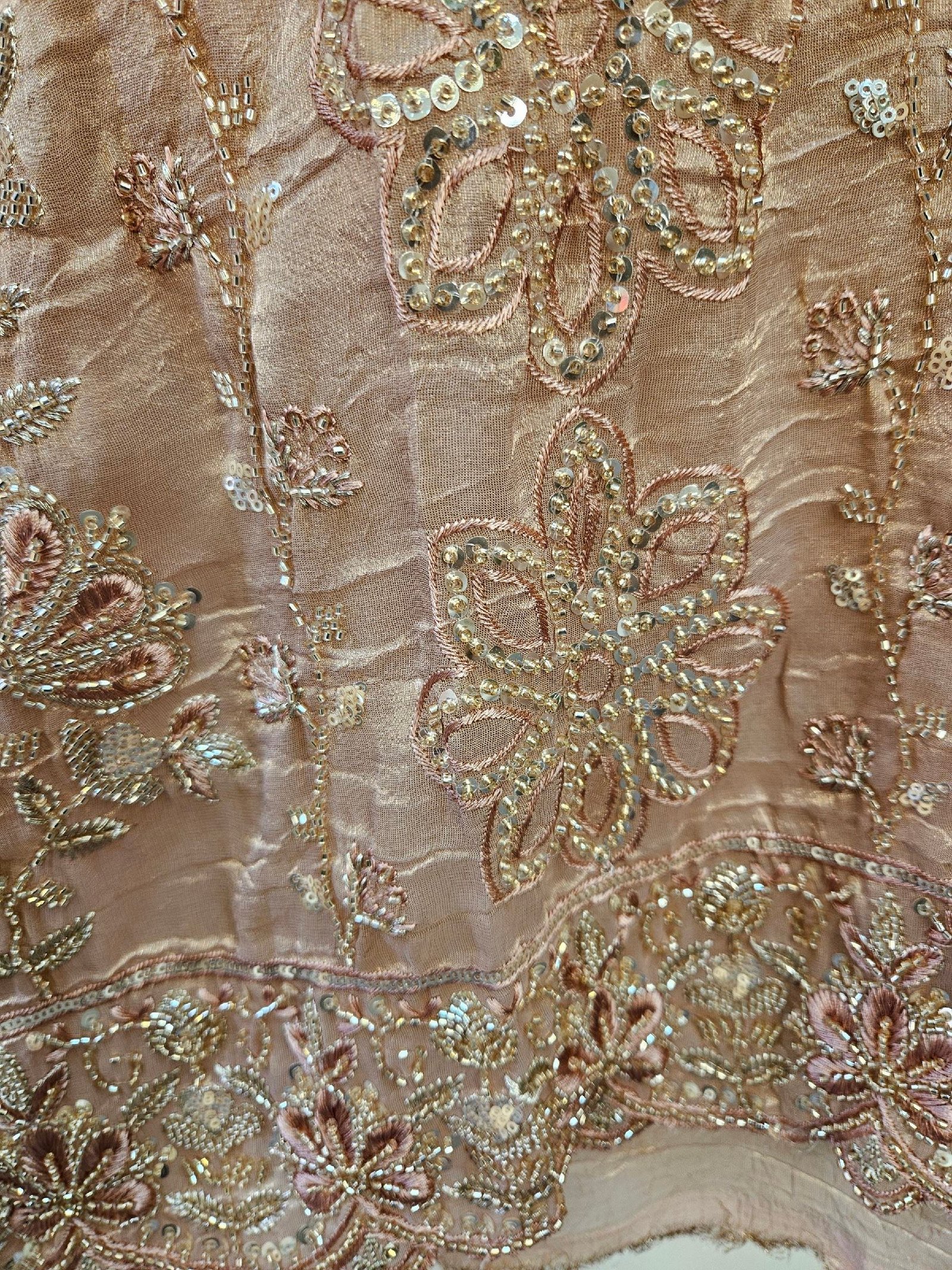Pure crush tissue simar fabric with exquisite all-over handwork, paired with a chiffon dupatta featuring elegant cutwork embroidery. Finished with a luxurious Italian silk bottom in a soft pastel shade—creating a graceful and sophisticated designer ensemble. ✨