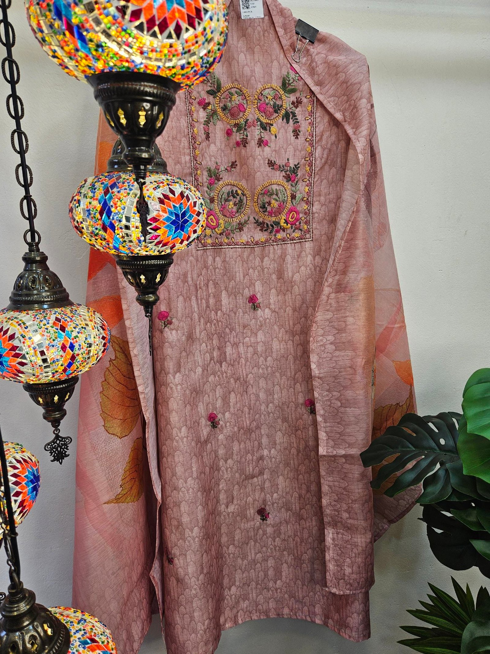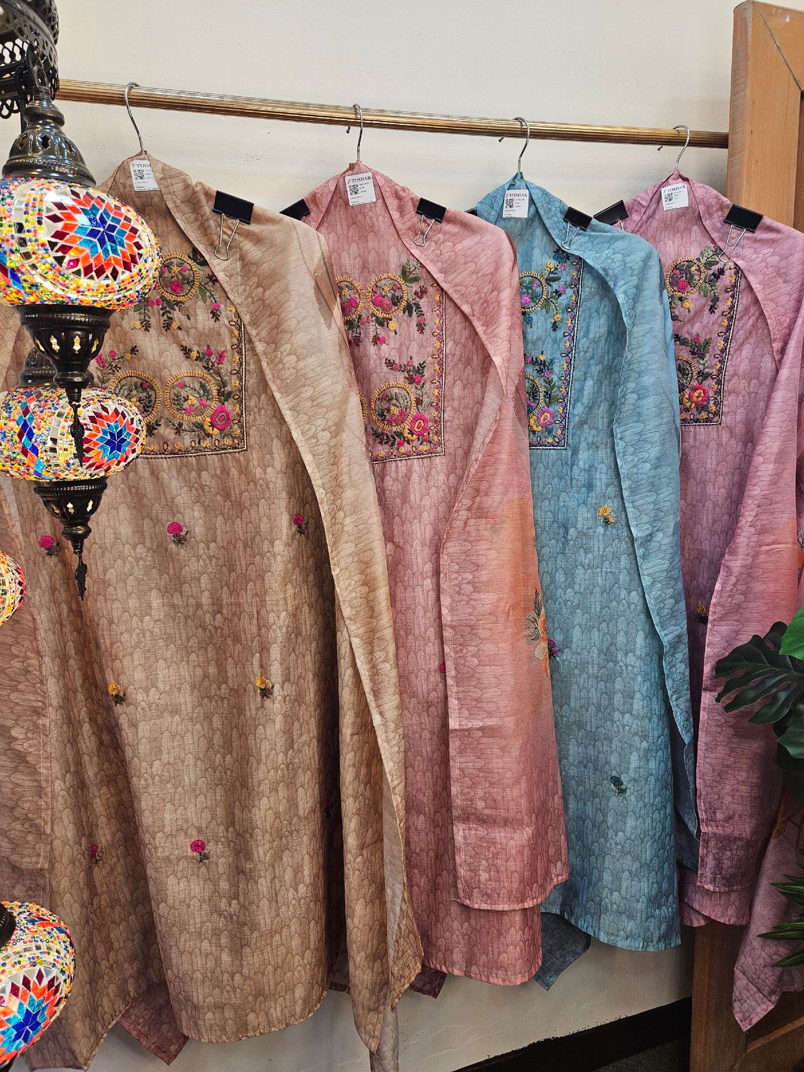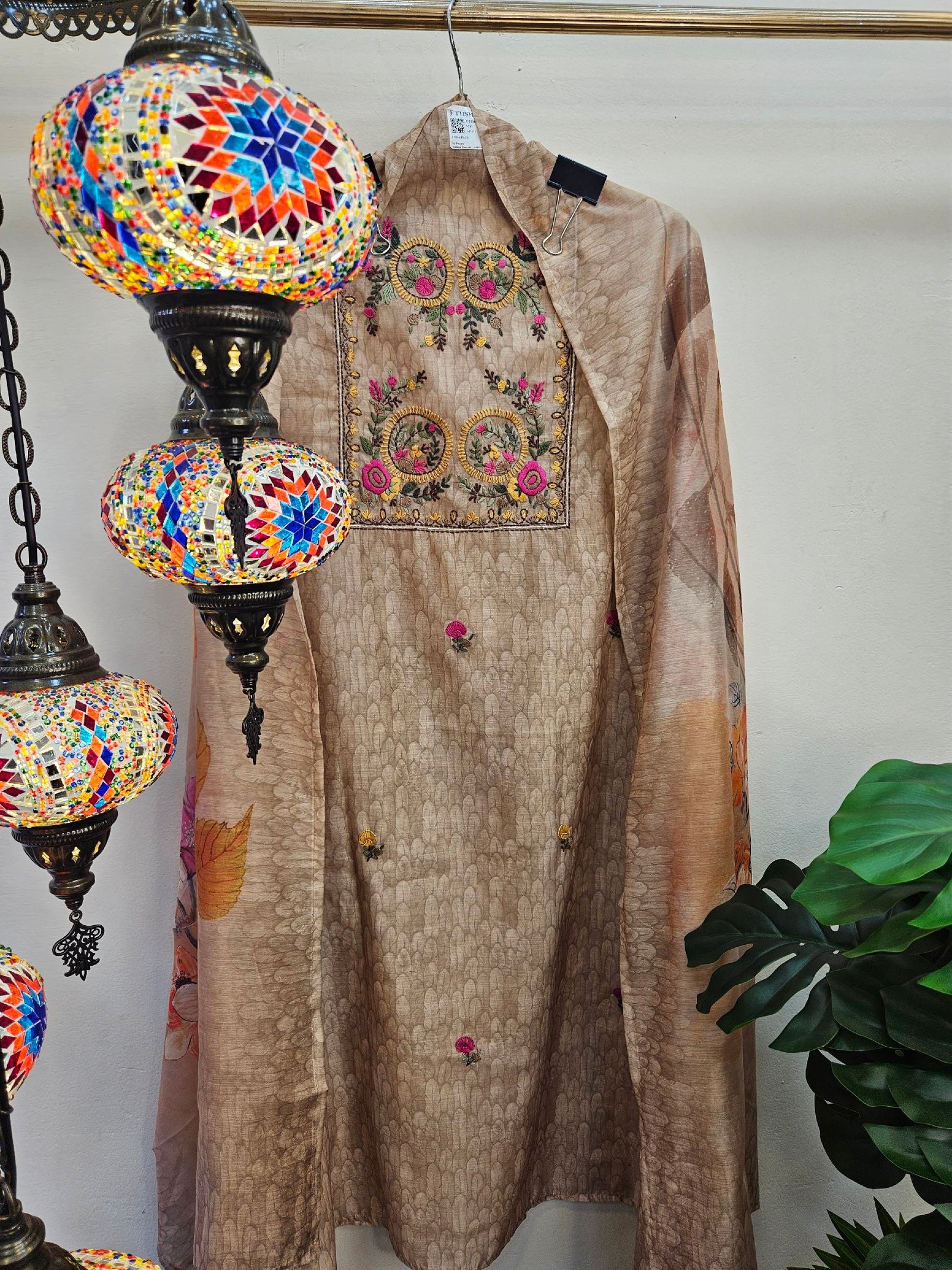 Pure tassar silk fabric with elegant neckline handwork and delicate French knot detailing, paired with a beautifully coordinated tassar digital printed dupatta. Comes with a comfortable santoon bottom — a graceful and sophisticated choice for festive and semi-formal wear. ✨