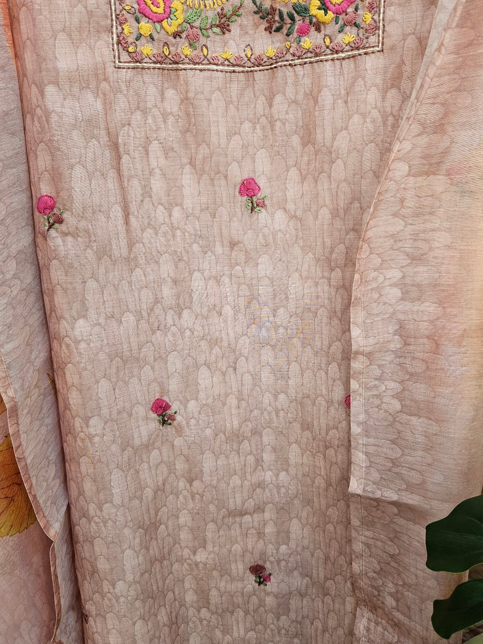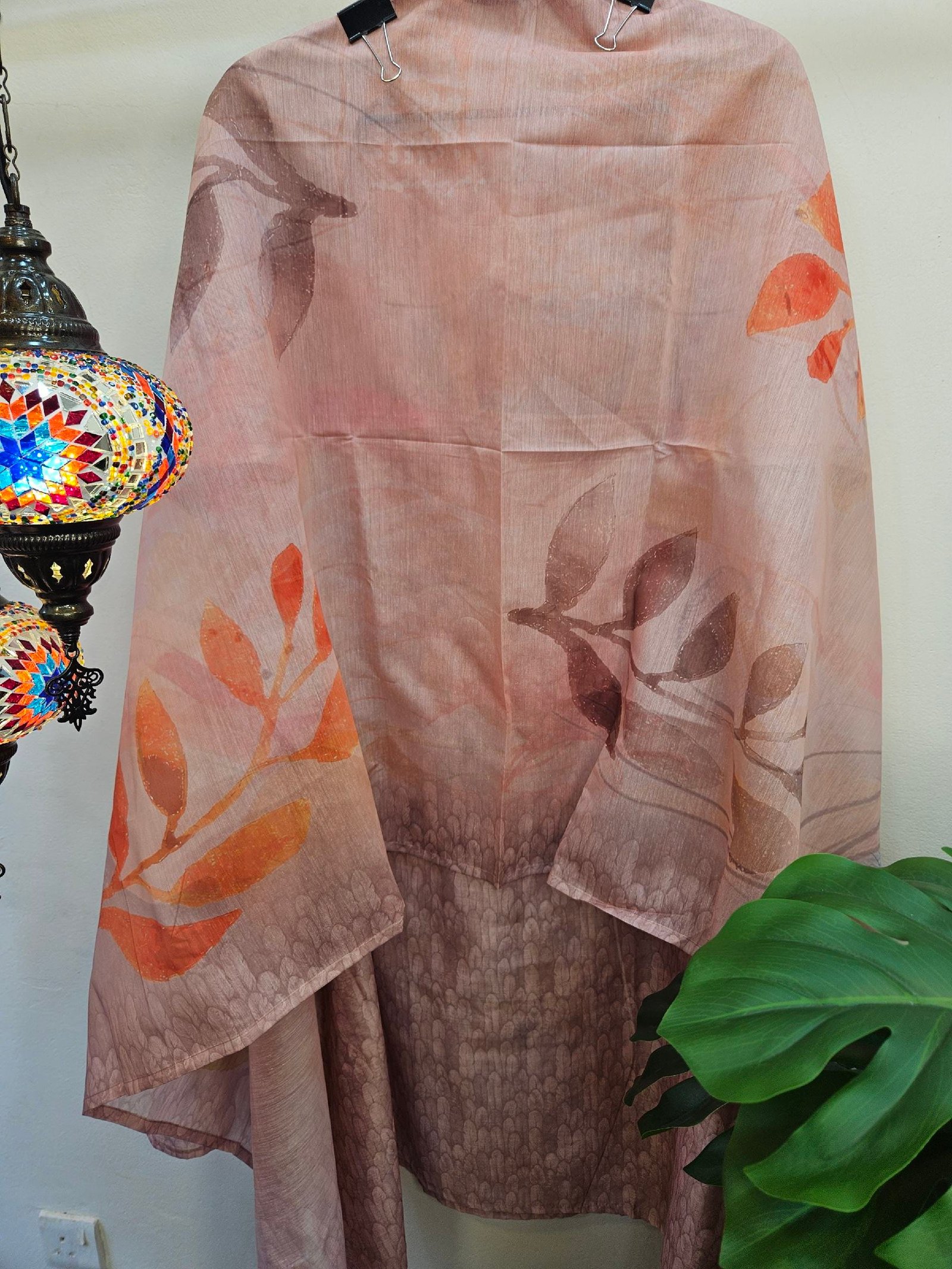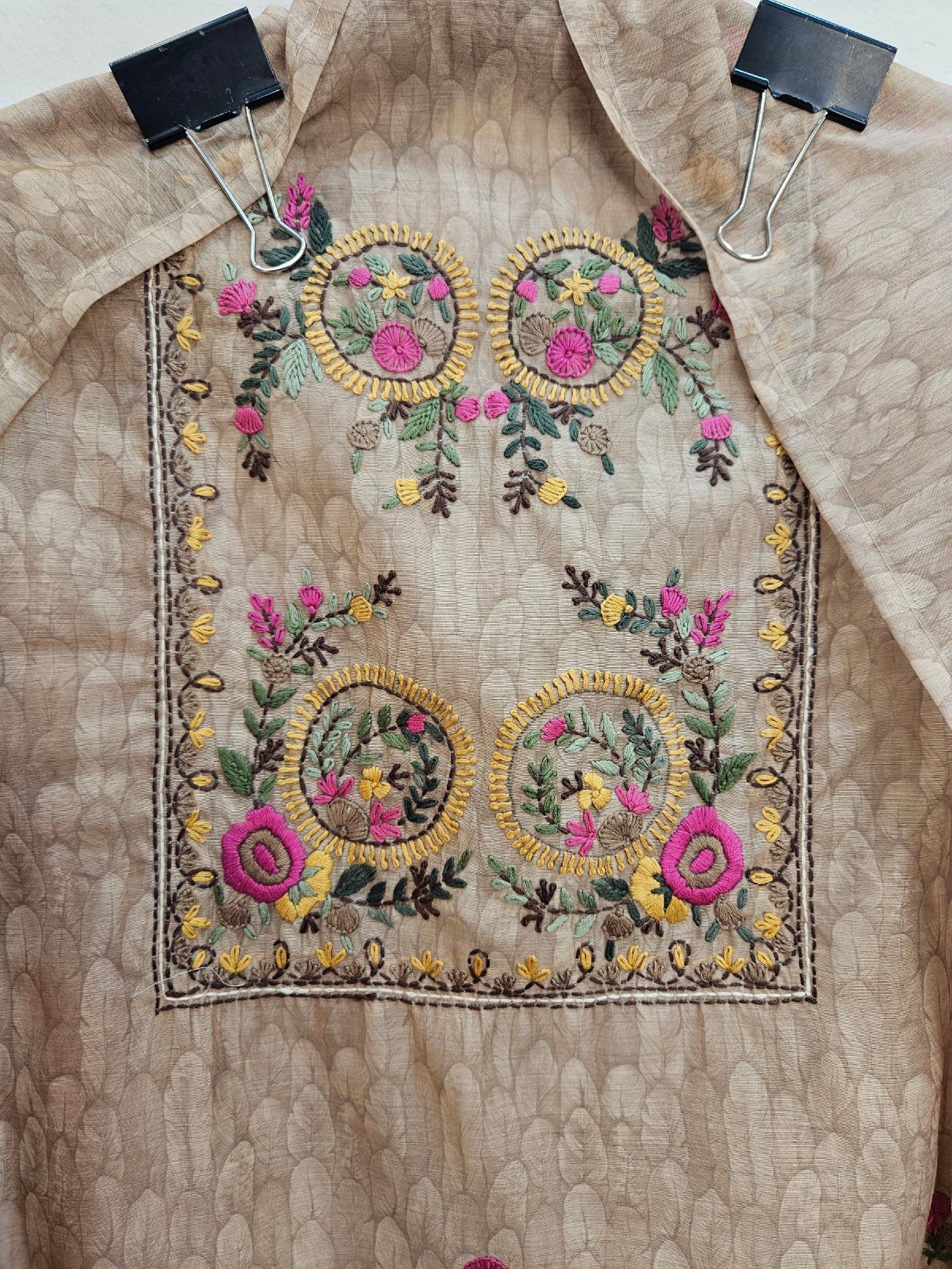 Pure tassar silk fabric with elegant neckline handwork and delicate French knot detailing, paired with a beautifully coordinated tassar digital printed dupatta. Comes with a comfortable santoon bottom — a graceful and sophisticated choice for festive and semi-formal wear. ✨
