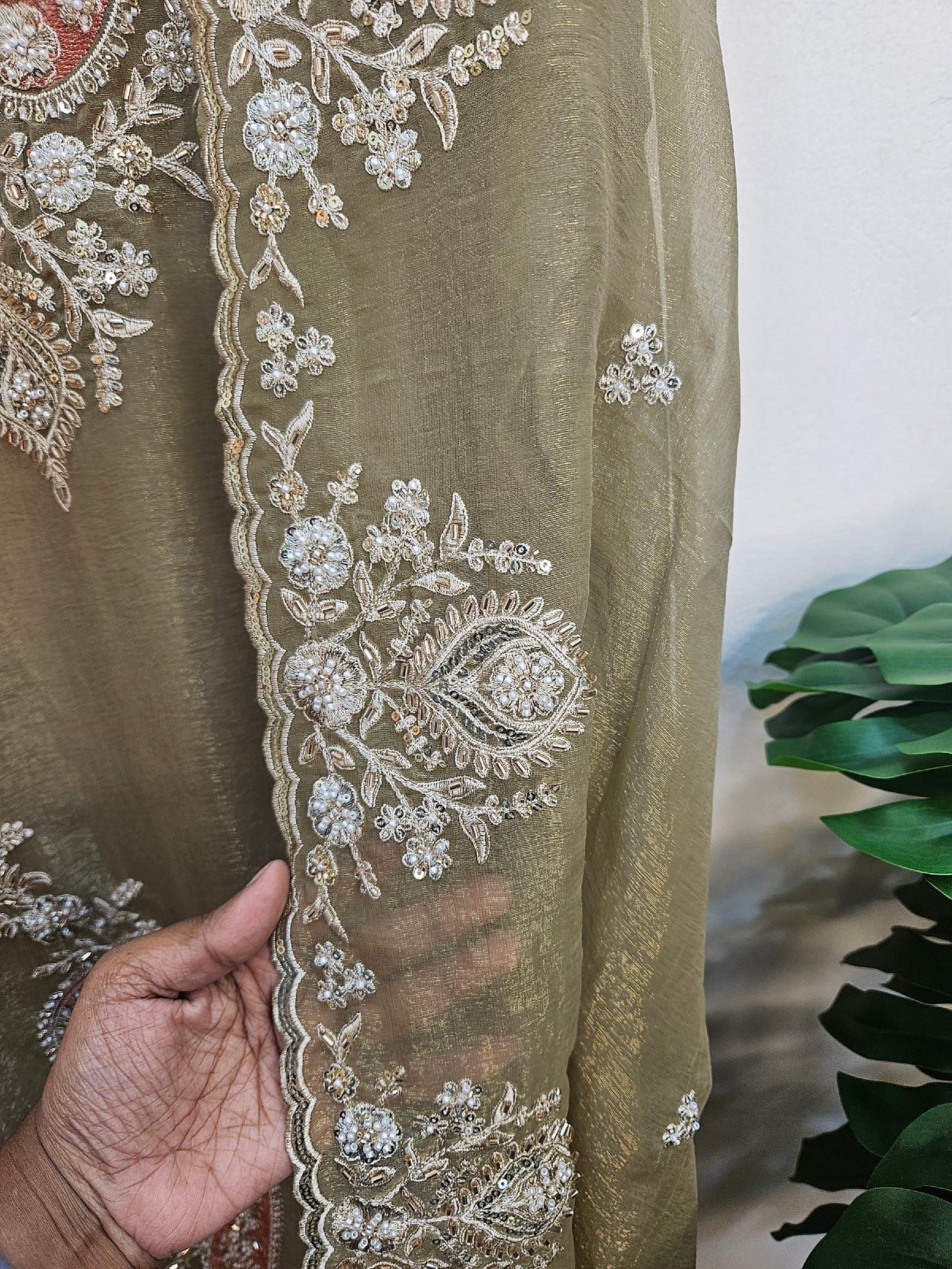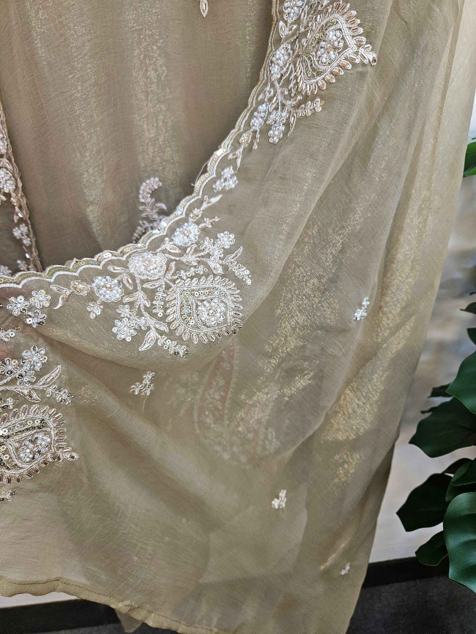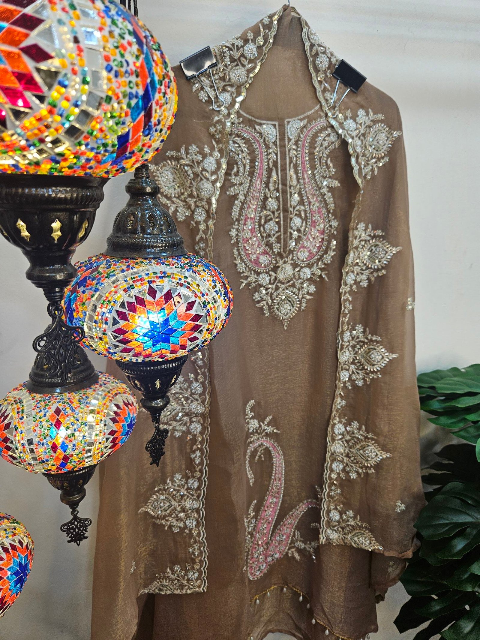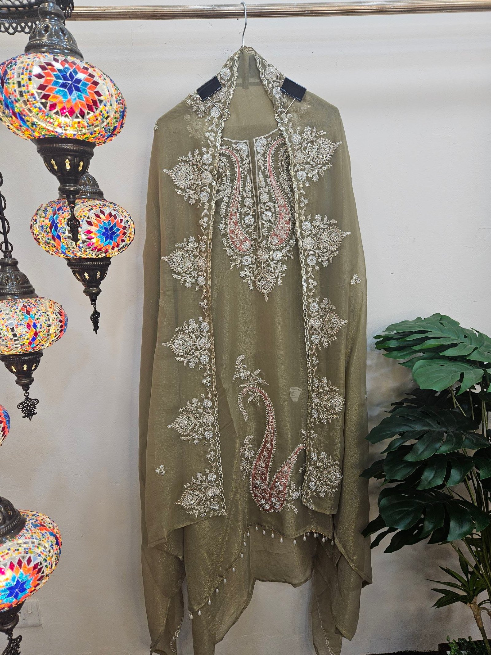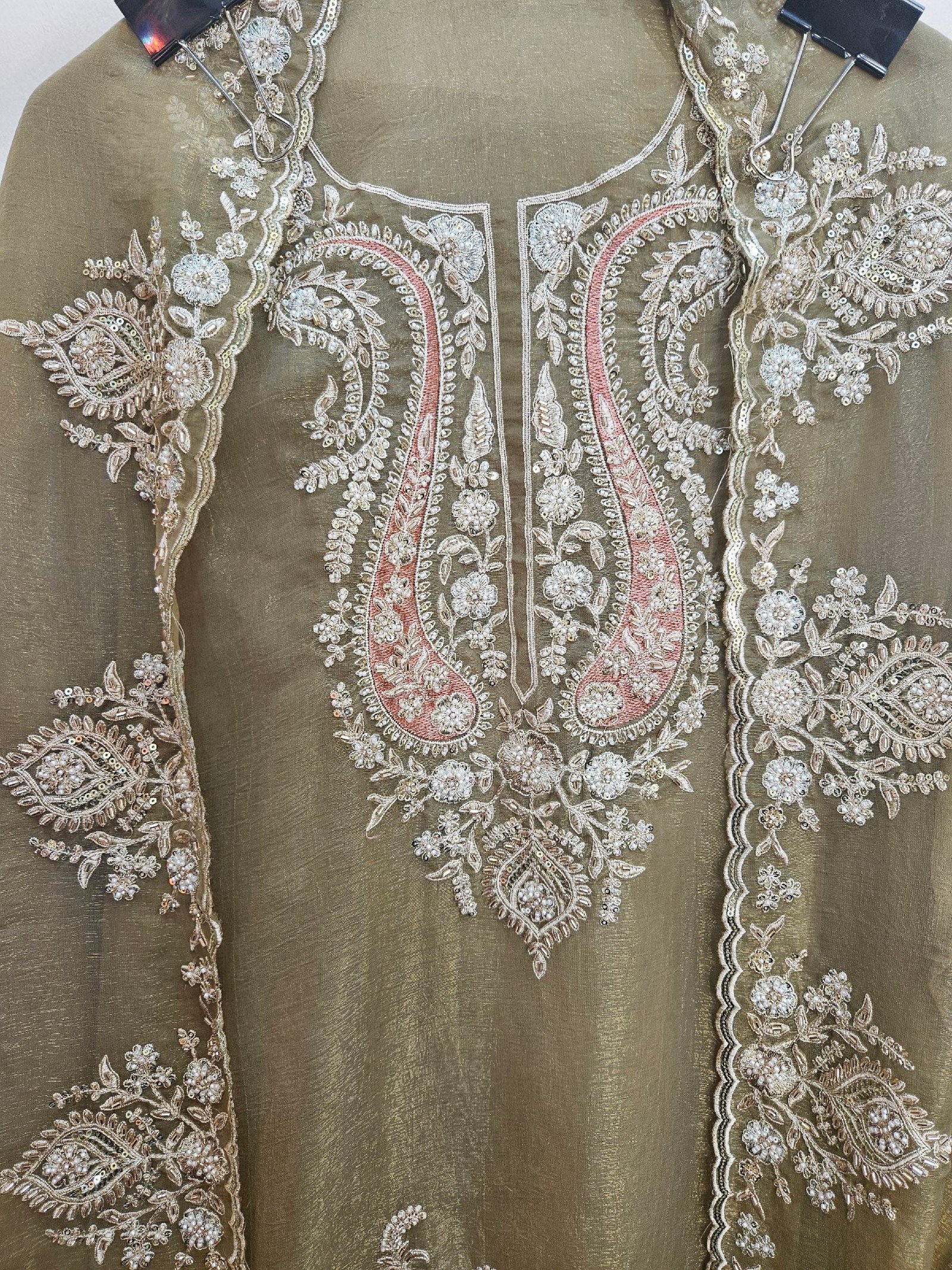 Pure glass simar fabric beautifully adorned with intricate handwork. The daman features heavy embellishment enhanced with elegant pearl lacing, while the glass simar dupatta is detailed with delicate handwork and a finely crafted cutwork border. Designed in a sober metallic shade, this festive ensemble is enriched with exquisite cutdana, pearl, and dabka work — a perfect blend of grace and glamour. ✨