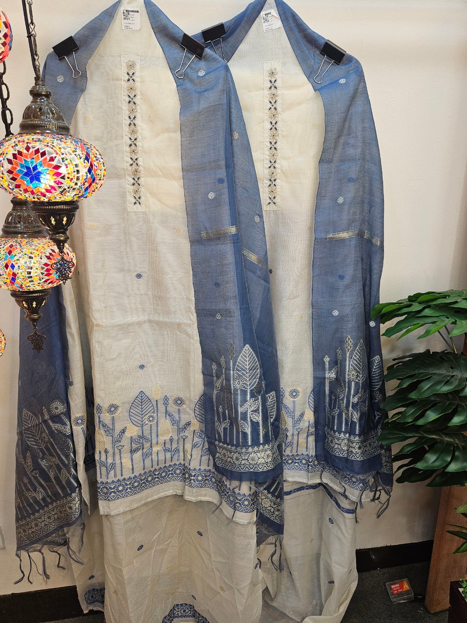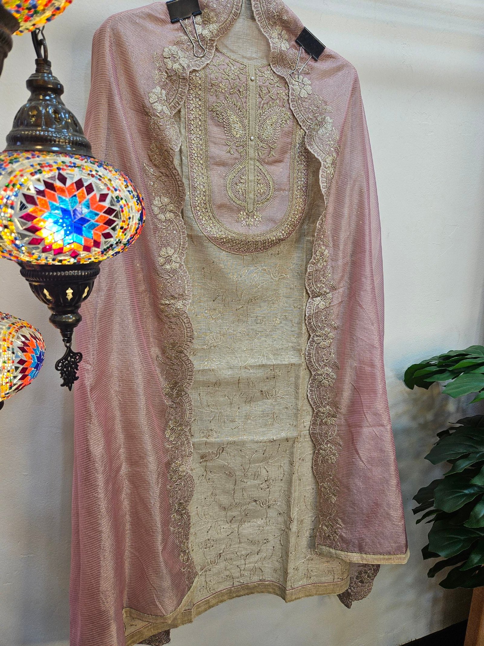 Pure Khaddi silk fabric featuring elegant zari thread and matte sequin work on the neckline, with delicate thread work spread beautifully all over the body. Paired with a graceful stripe shimmer fabric dupatta finished with a cutwork embroidery border, and complemented by a comfortable santoon bottom — a sophisticated and timeless ensemble. ✨