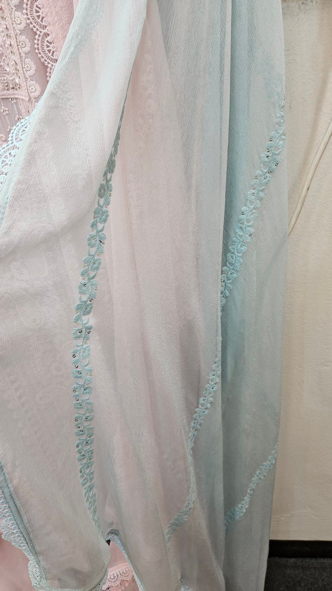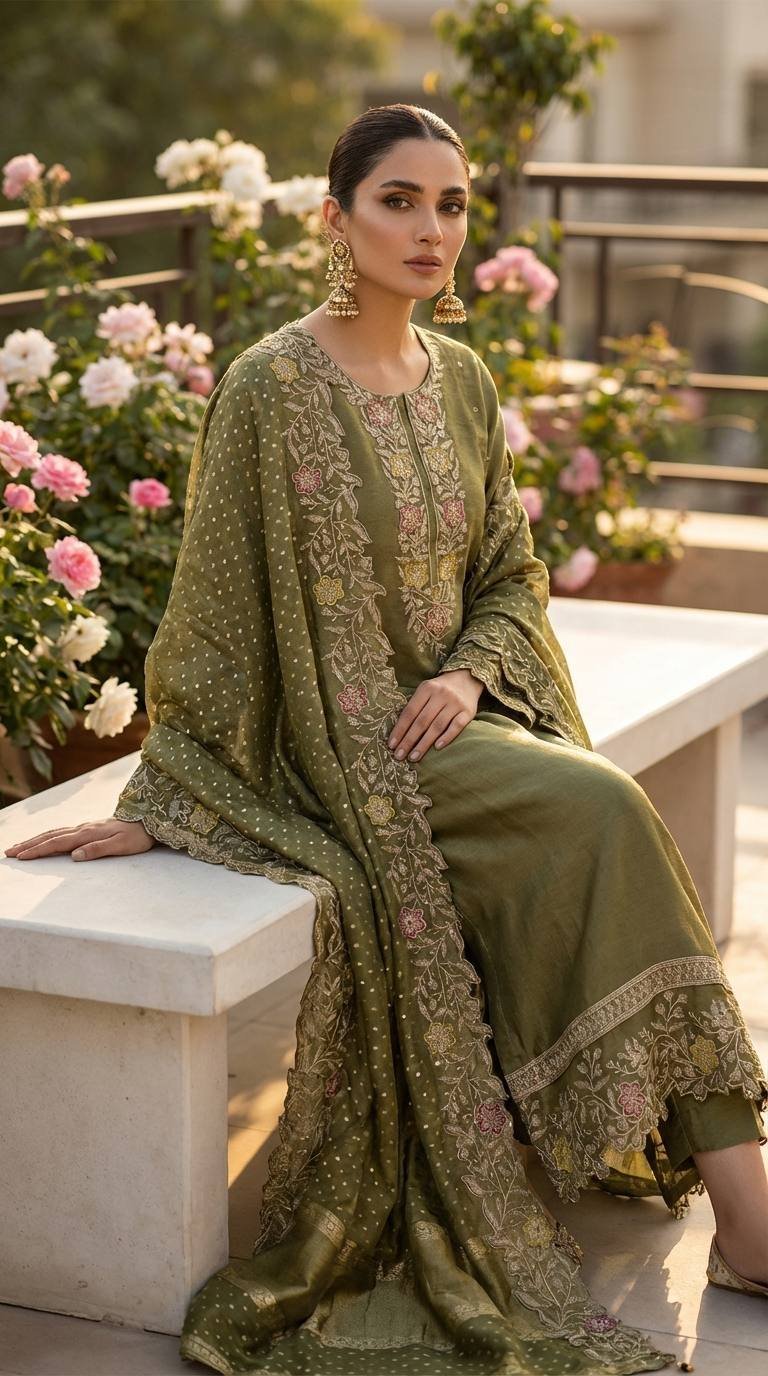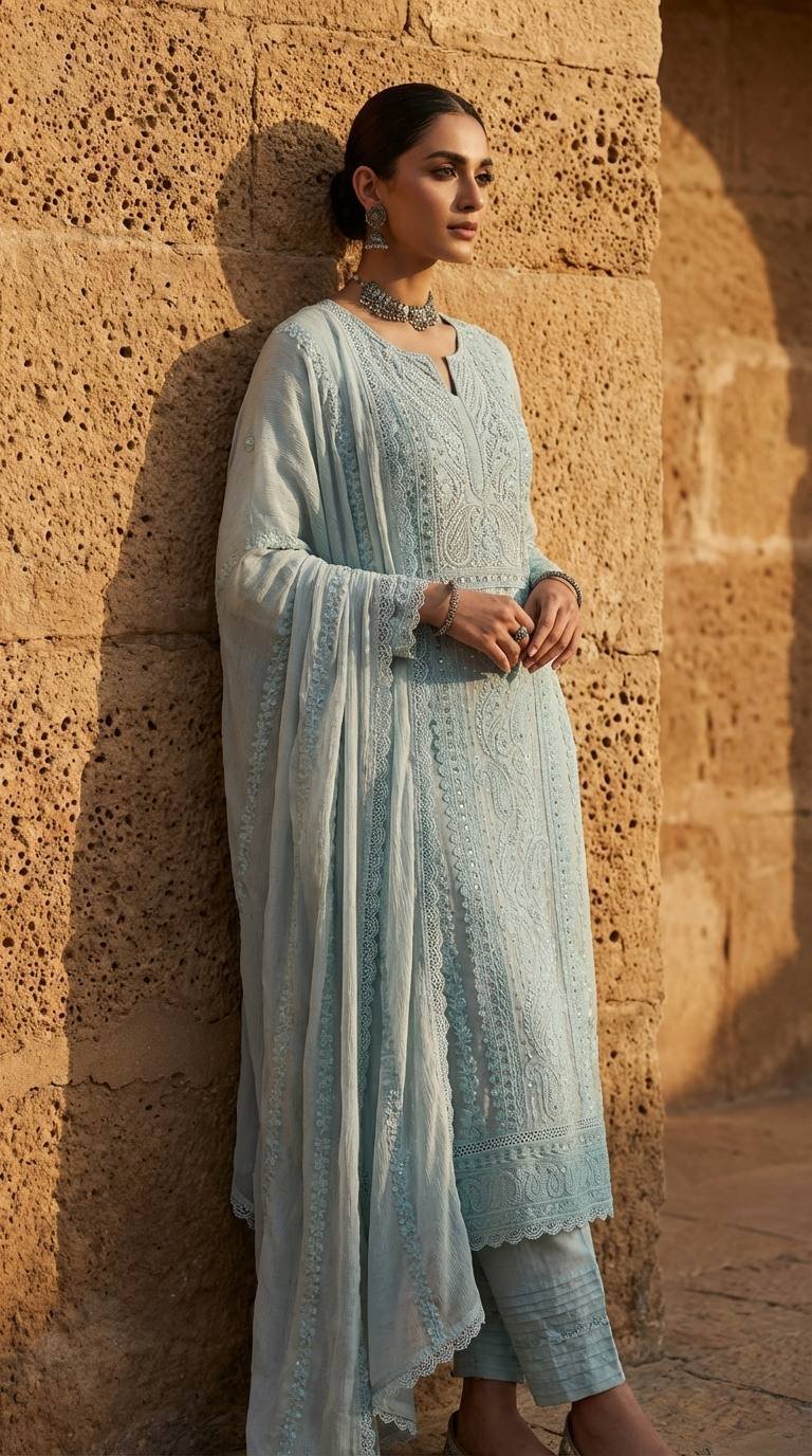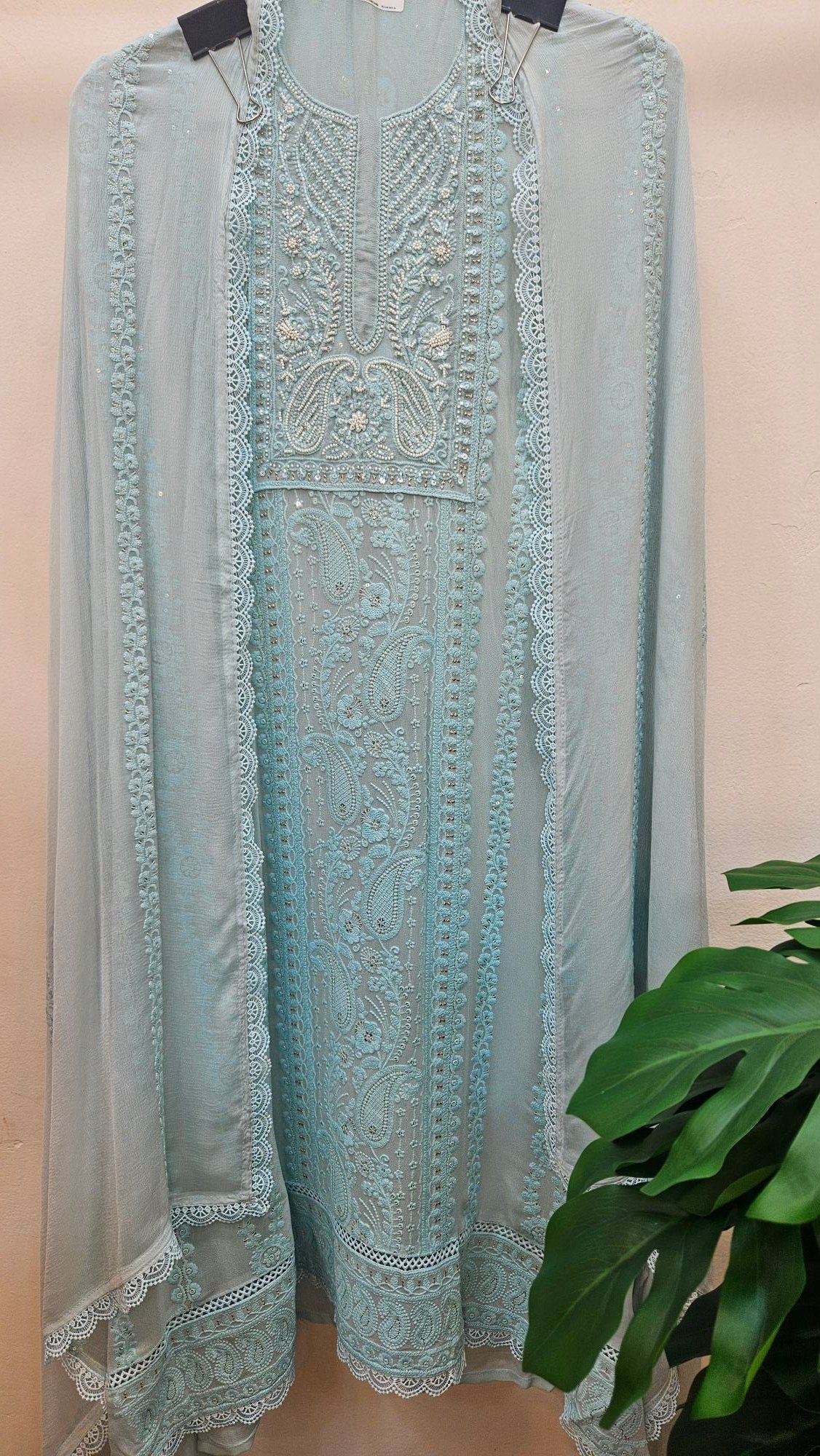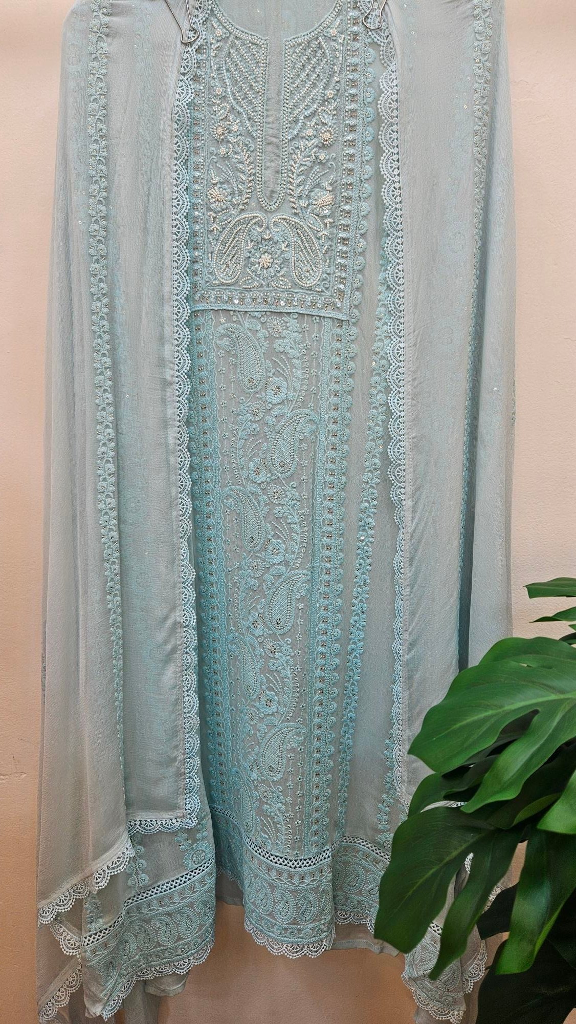 Pure Lucknowi embroidery enhanced with delicate hand pearl work all over, paired with a pure dupatta featuring elegant four-side borders and intricate butti detailing. Completed with a comfortable santoon bottom, this ensemble reflects a sober yet truly elegant collection—perfect for refined summer sophistication. ✨