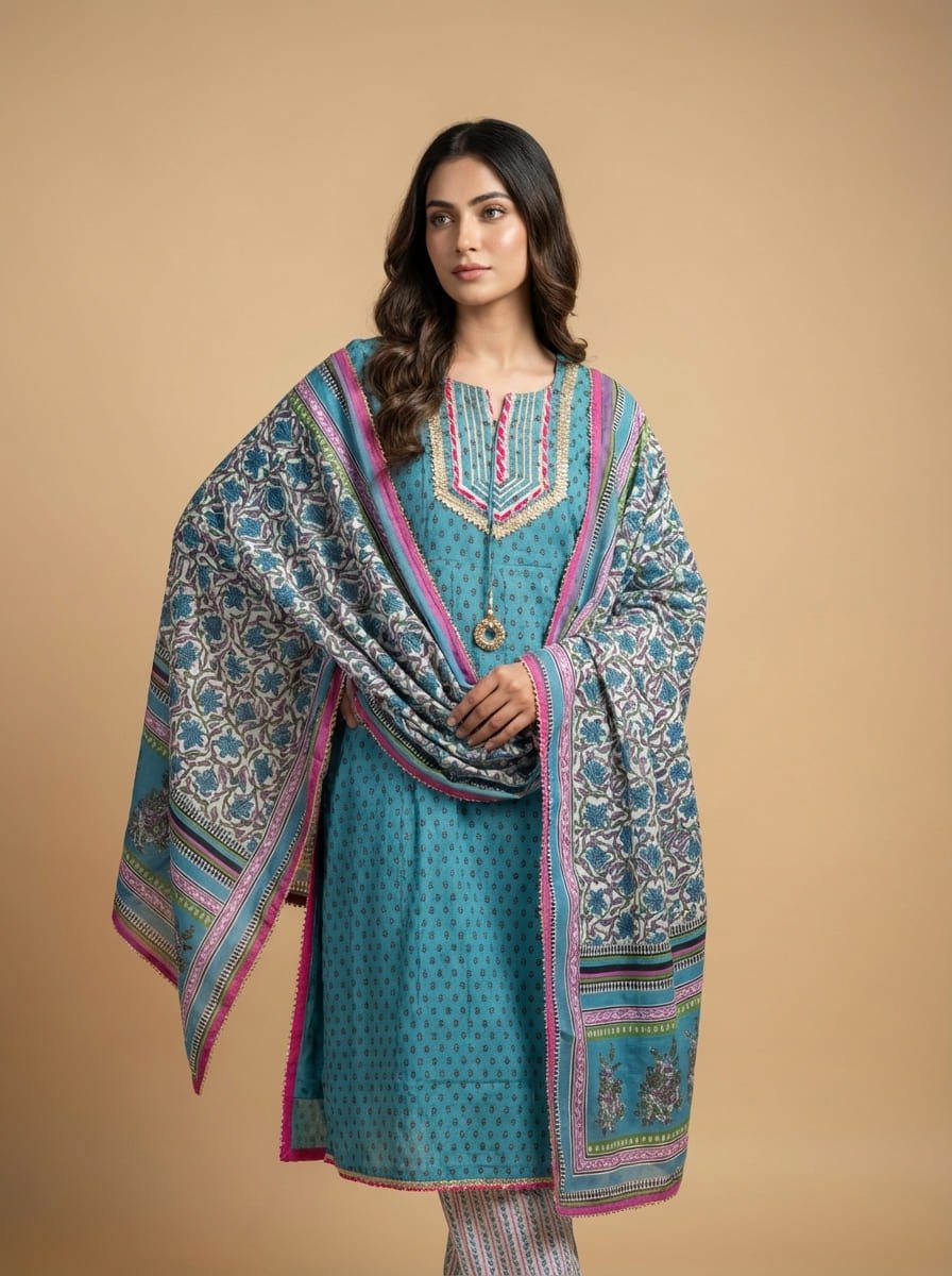 Soft and breathable mal mal cotton Anarkali adorned with elegant Jaipuri prints, paired with a beautifully detailed embroidered dupatta in pure mal mal cotton. Styled with a comfortable pant-style salwar featuring subtle prints, this ensemble is designed for effortless grace. A perfect blend of tradition and comfort, making it an ideal choice for Eid and summer wear with a sophisticated, airy feel.