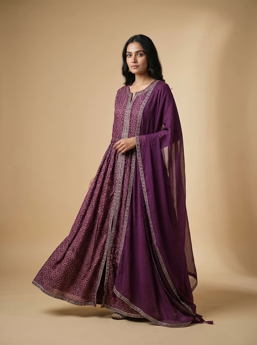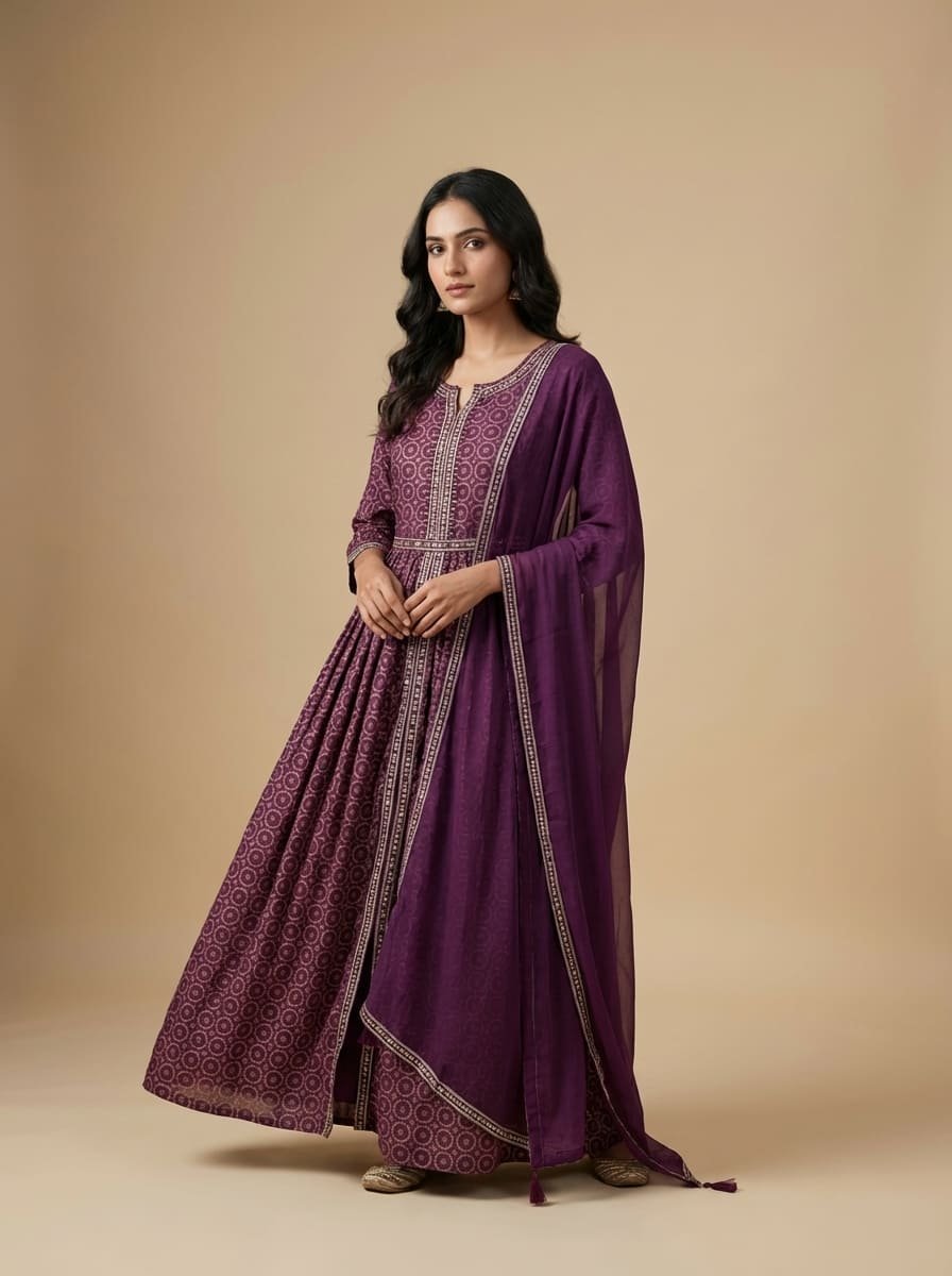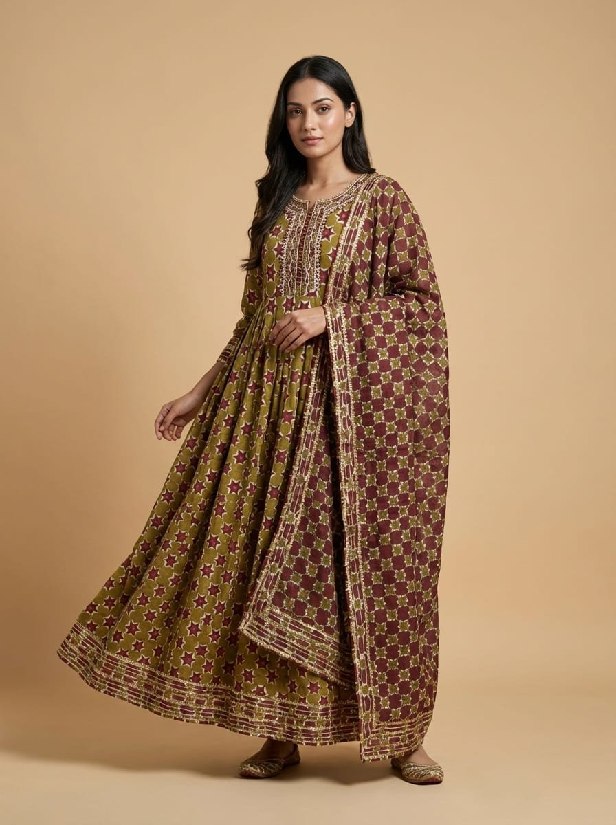 Mal mal cotton silk floor-length gown featuring a Jaipuri printed base with an intricately embroidered neckline. Paired with a soft chiffon dupatta adorned with subtle matte sequin work all over. Lightweight, breathable, and elegantly sophisticated—perfect for summer occasions