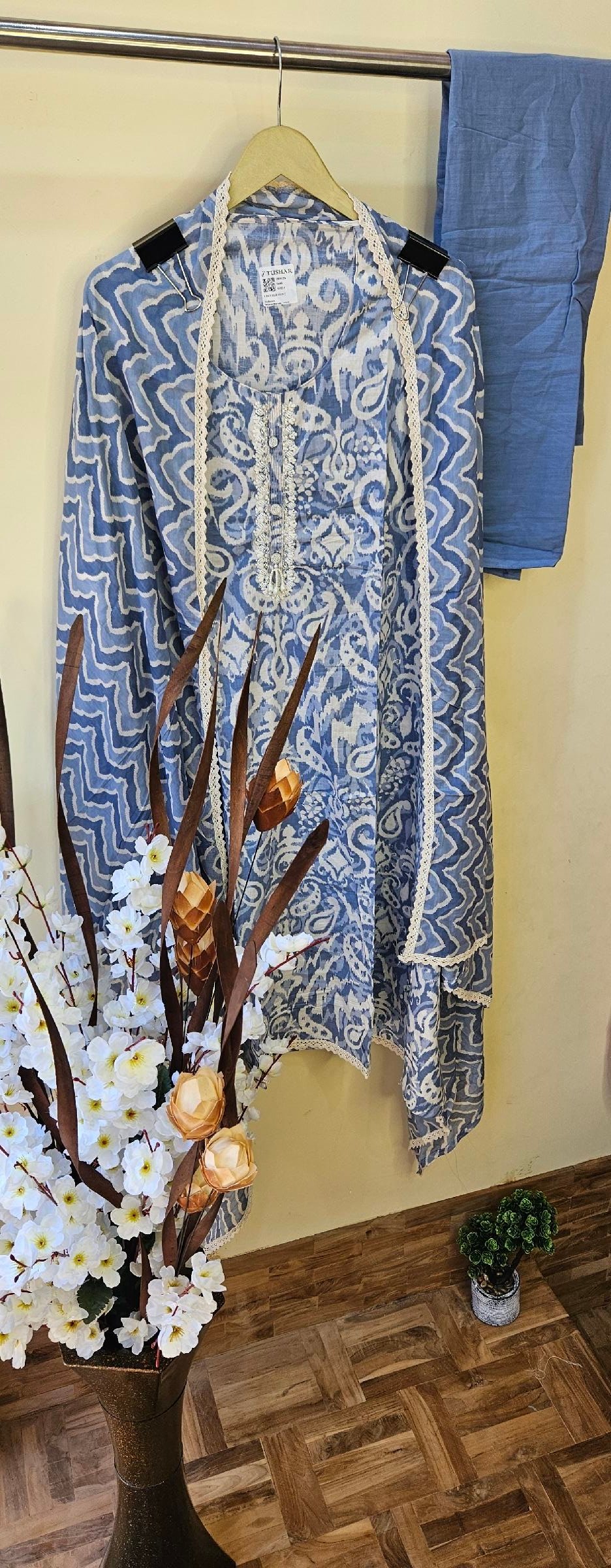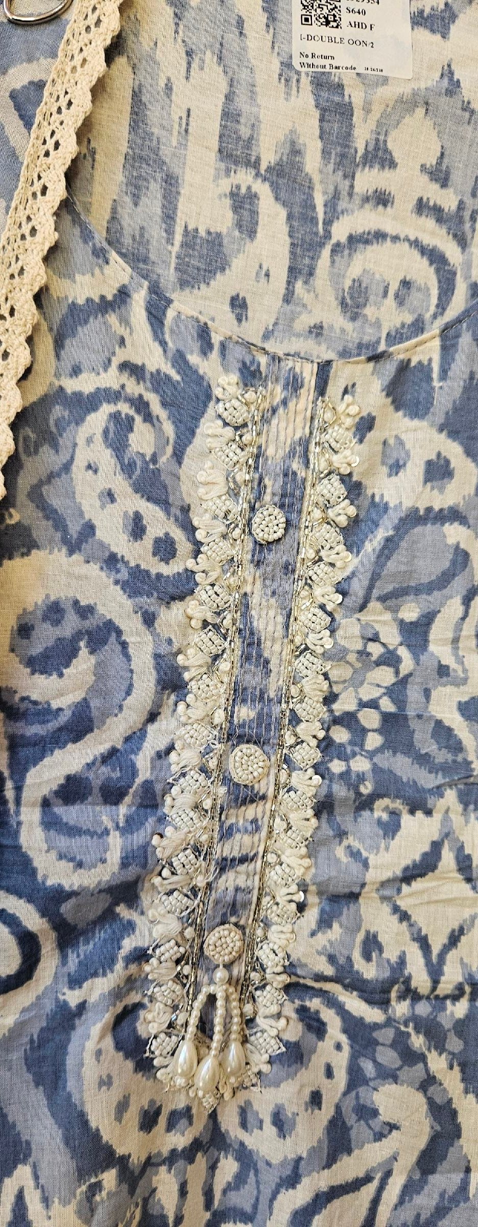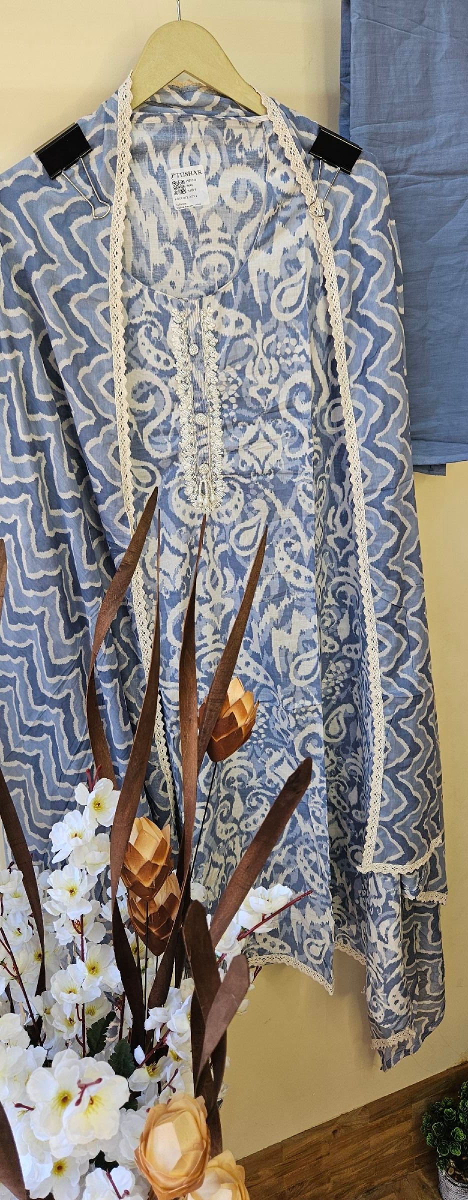 Pure mal mal cotton fabric with elegant neckline handwork, paired with a soft and breathable santoon bottom. Comes with a lightweight mal mal cotton dupatta for a graceful flow.