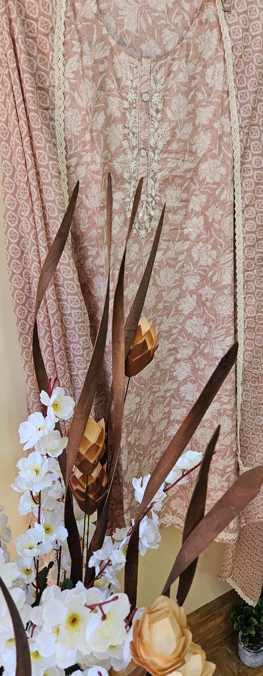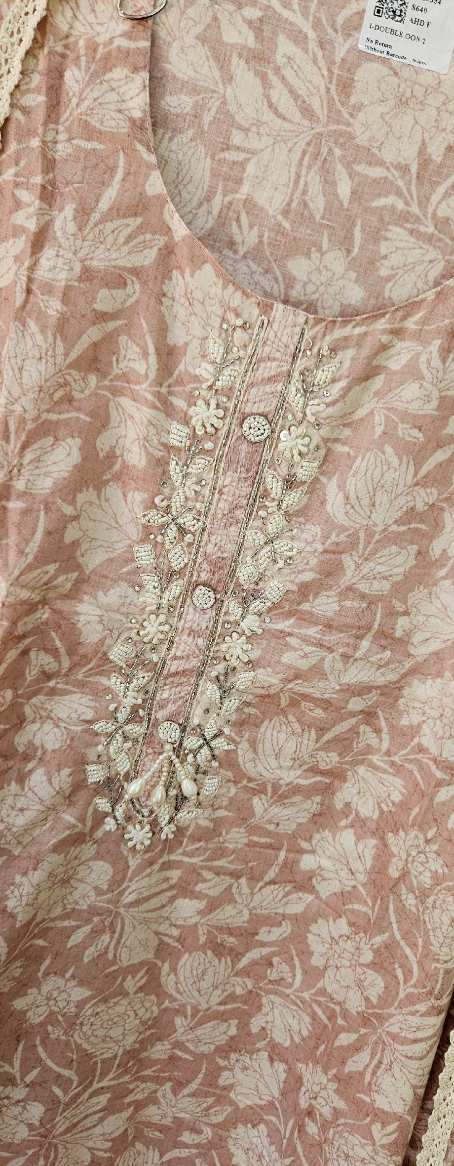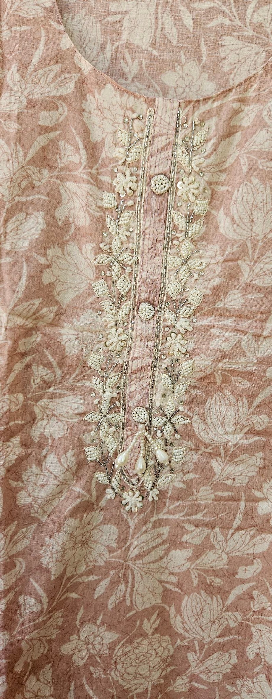 Pure mal mal cotton fabric with elegant neckline handwork, paired with a soft and breathable santoon bottom. Comes with a lightweight mal mal cotton dupatta for a graceful flow.