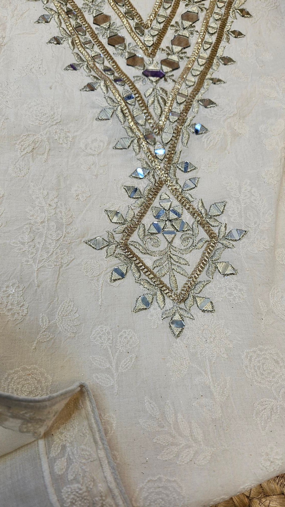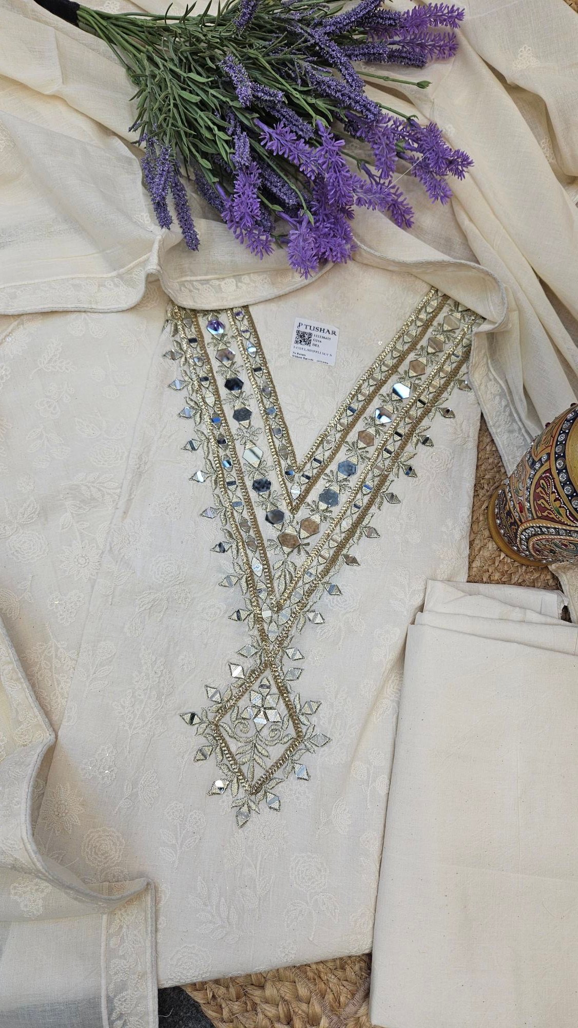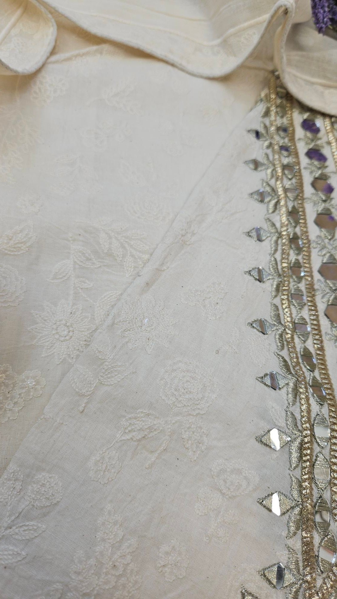 Elegant white ensemble crafted from pure mal mal self-embroidered fabric, beautifully highlighted with intricate handwork and delicate mirror detailing on the neckline.
