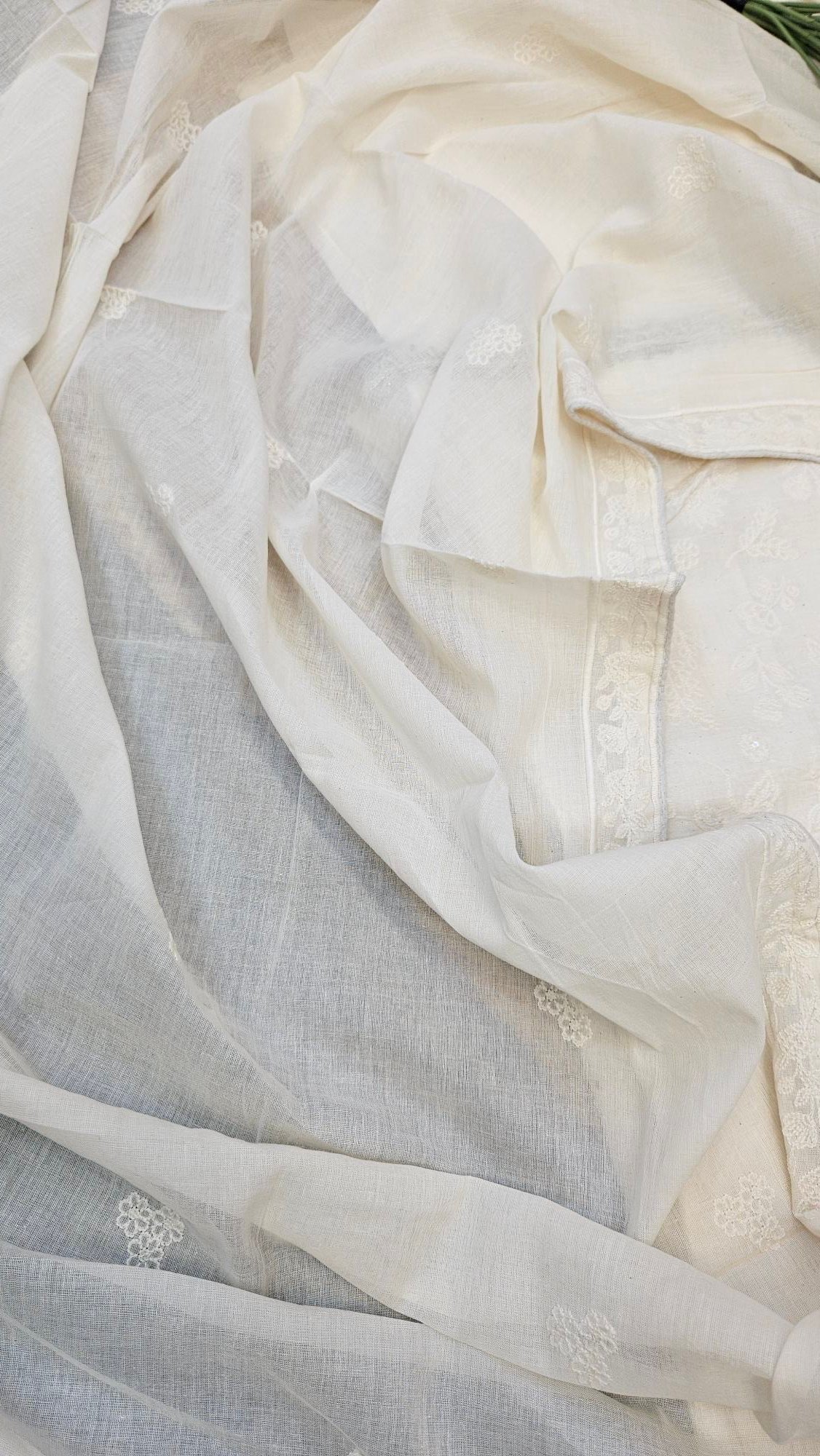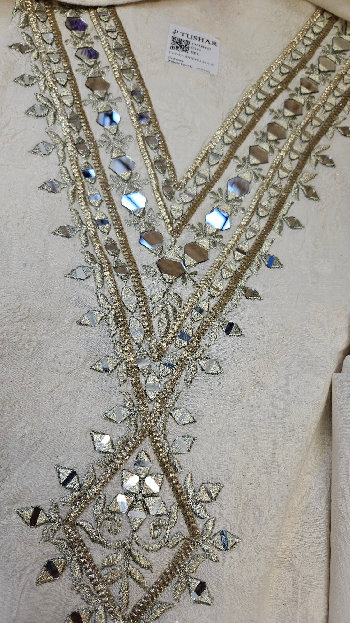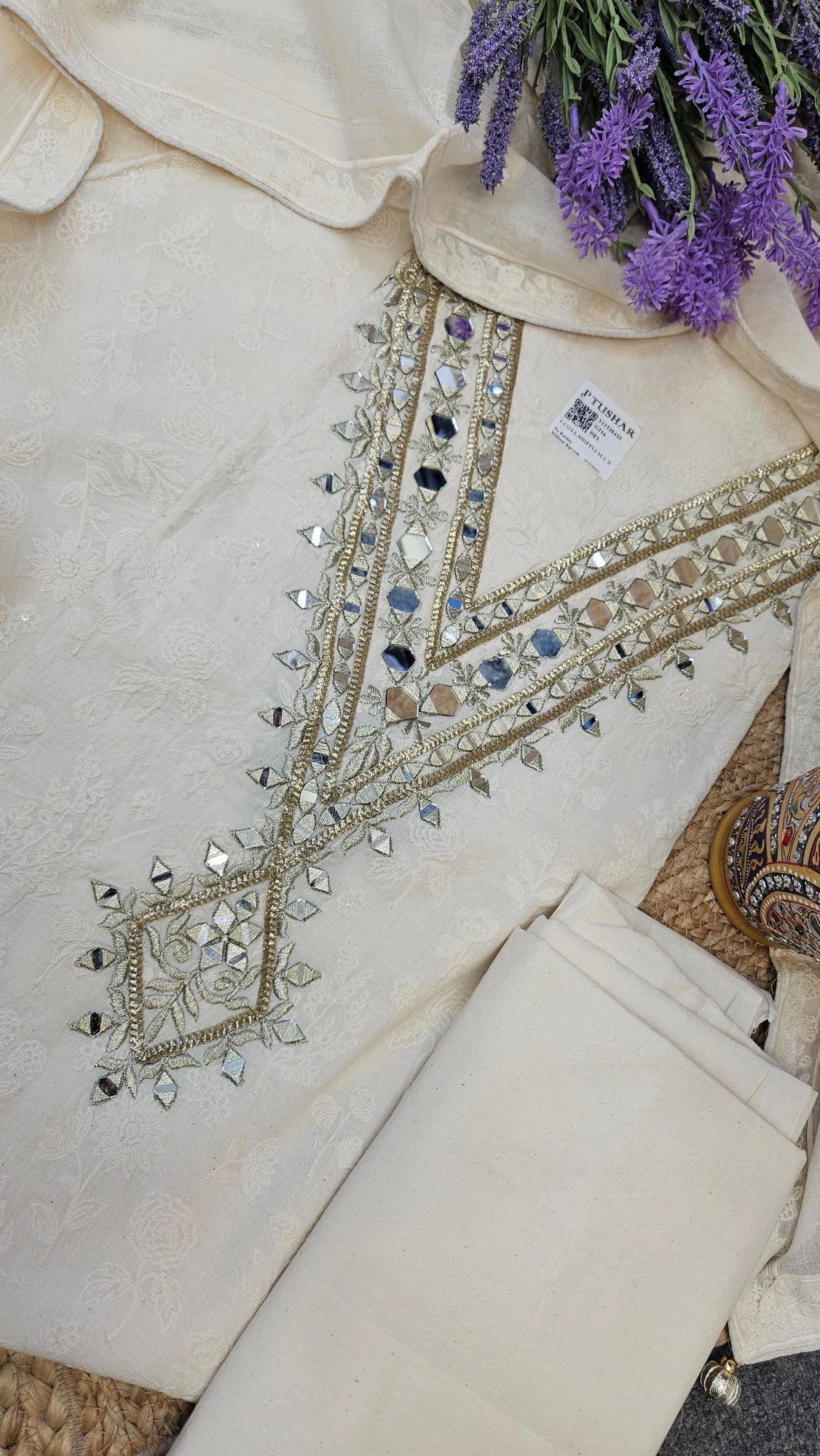 Elegant white ensemble crafted from pure mal mal self-embroidered fabric, beautifully highlighted with intricate handwork and delicate mirror detailing on the neckline.