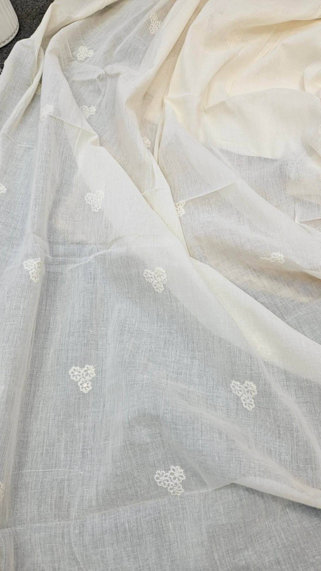 Paired with a white dupatta featuring four-side embroidery and subtle butti work, along with a soft mal mal cotton bottom.