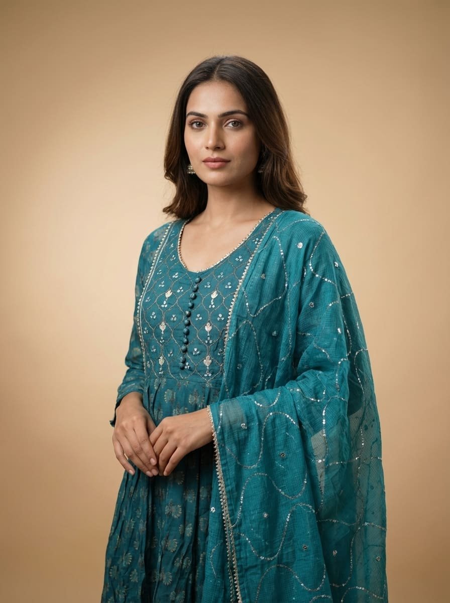 Mal mal cotton silk floor-length gown featuring a Jaipuri printed base with an intricately embroidered neckline. Paired with a soft Kotta dupatta adorned with subtle matte sequin work all over. Lightweight, breathable, and elegantly sophisticated—perfect for summer occasions.