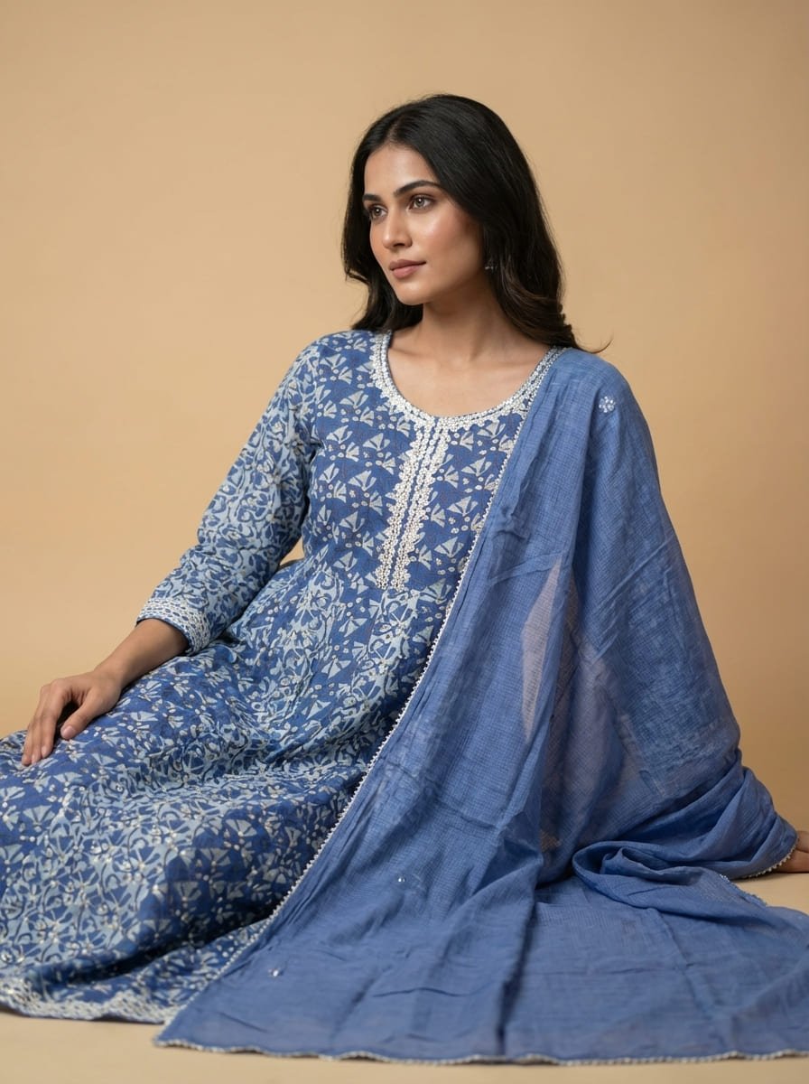 Mal mal cotton silk floor-length gown featuring a Jaipuri printed base with an intricately embroidered neckline. Paired with a soft Kotta dupatta adorned with subtle matte sequin work all over. Lightweight, breathable, and elegantly sophisticated—perfect for summer occasions.