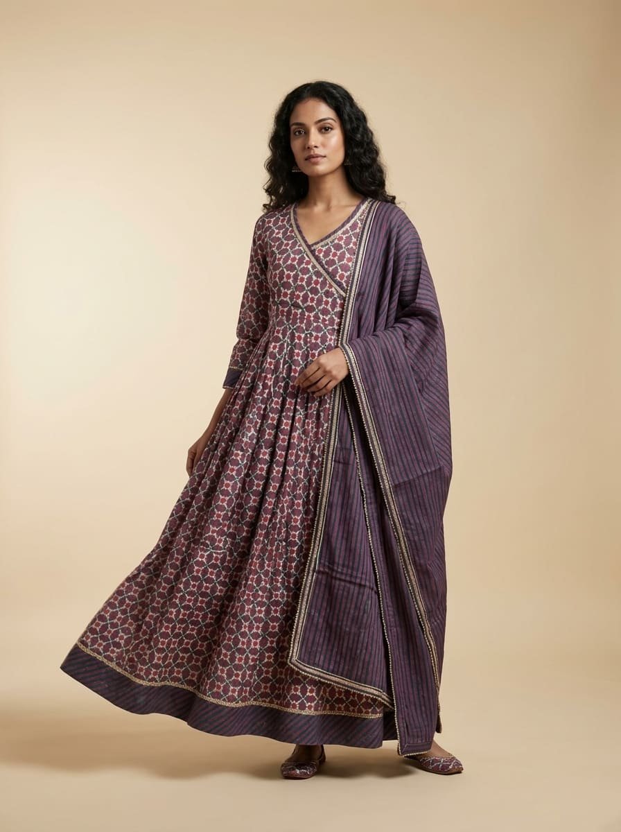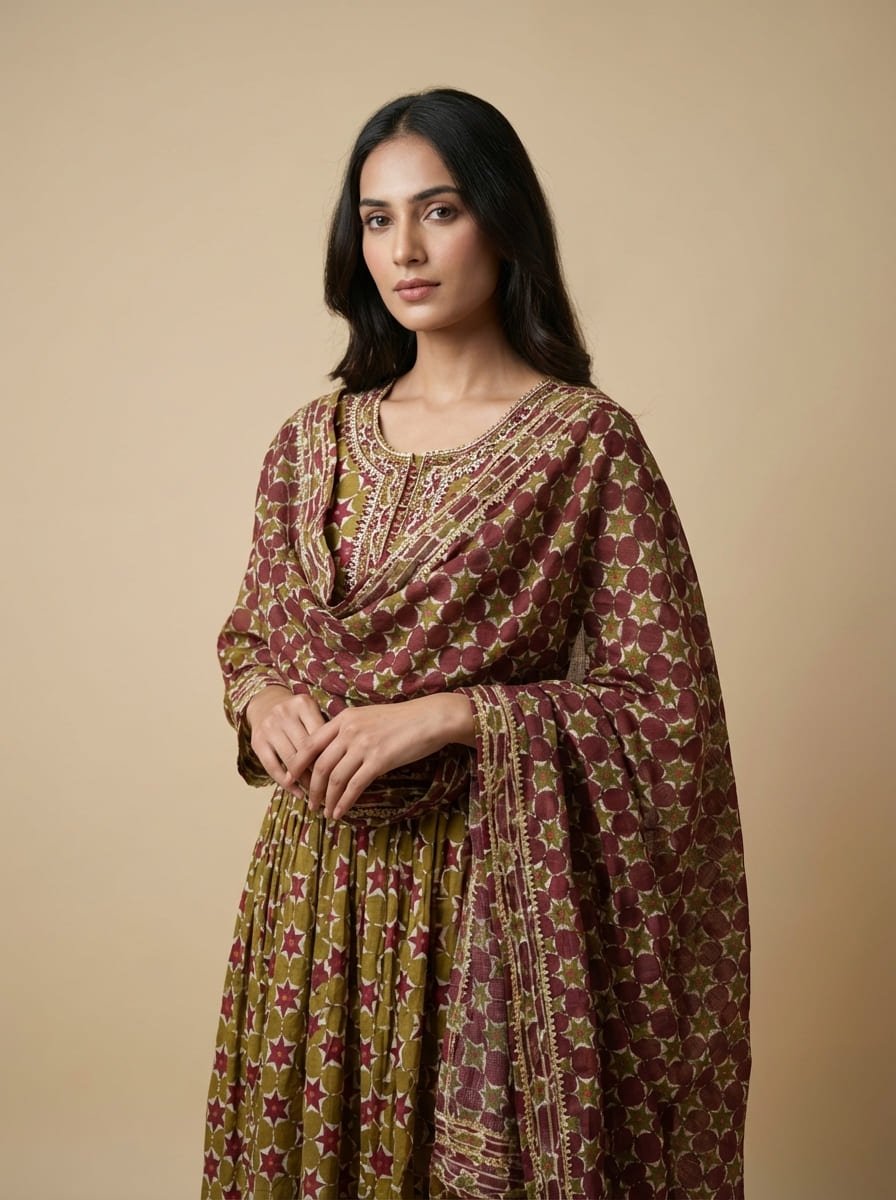 Mal mal cotton silk floor-length gown featuring a Jaipuri printed base with an intricately embroidered neckline. Paired with a soft Kotta dupatta adorned with subtle matte sequin work all over. Lightweight, breathable, and elegantly sophisticated—perfect for summer occasions.