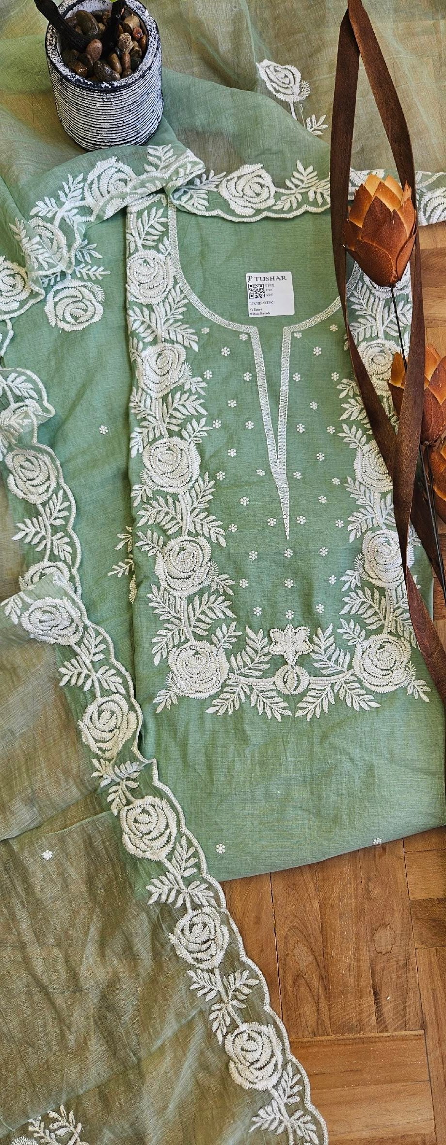 Pure mul chanderi fabric adorned with intricate Lucknowi embroidery, paired with a pearl handwork dupatta in matching mul chanderi. Comes with a soft cotton trouser, creating a graceful and elegant summer vibe — light, breathable, and effortlessly sophisticated.