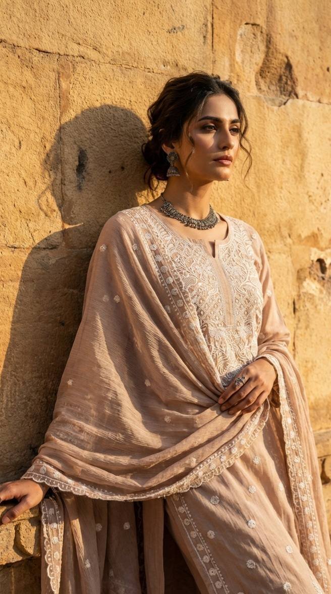 Pure mul chanderi fabric adorned with intricate Lucknowi embroidery, paired with a pearl handwork dupatta in matching mul chanderi. Comes with a soft cotton trouser, creating a graceful and elegant summer vibe — light, breathable, and effortlessly sophisticated.