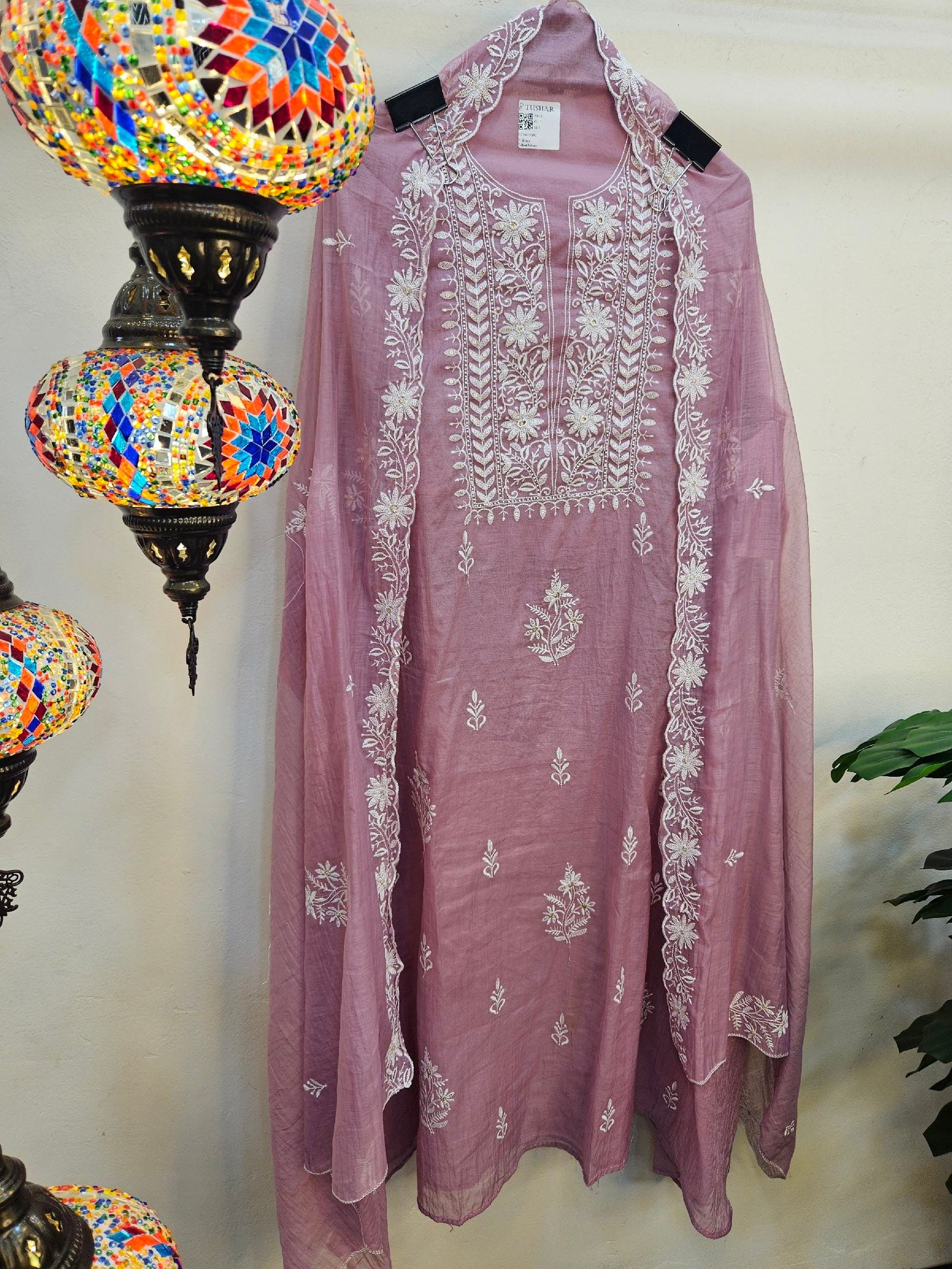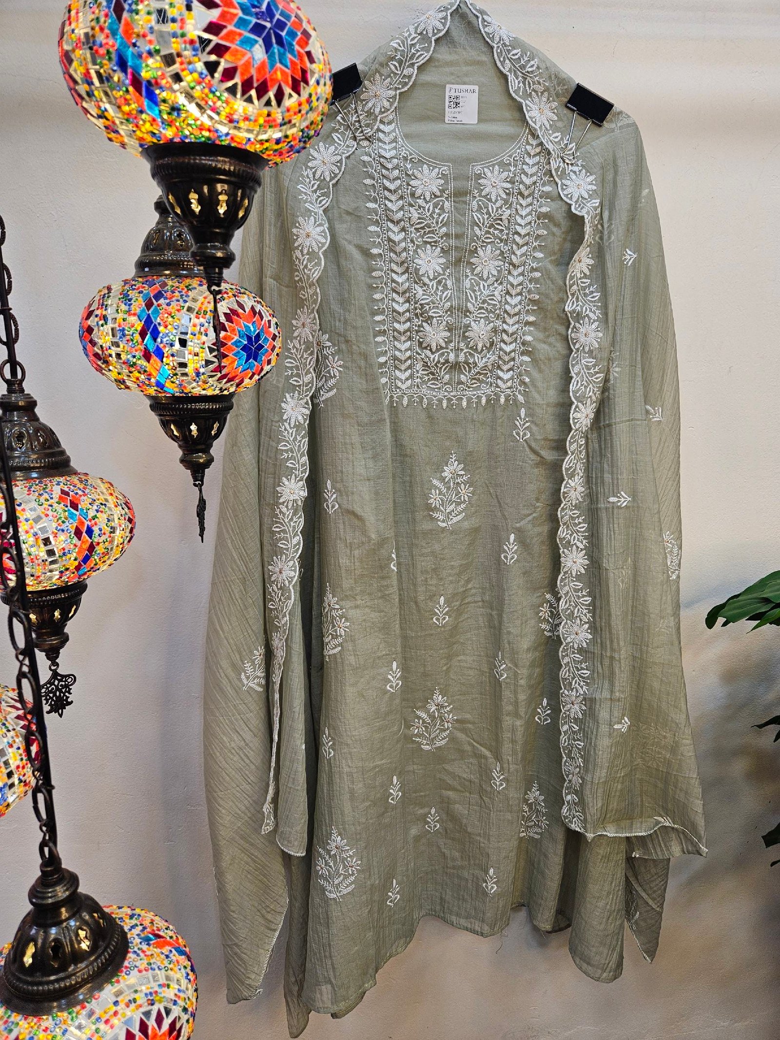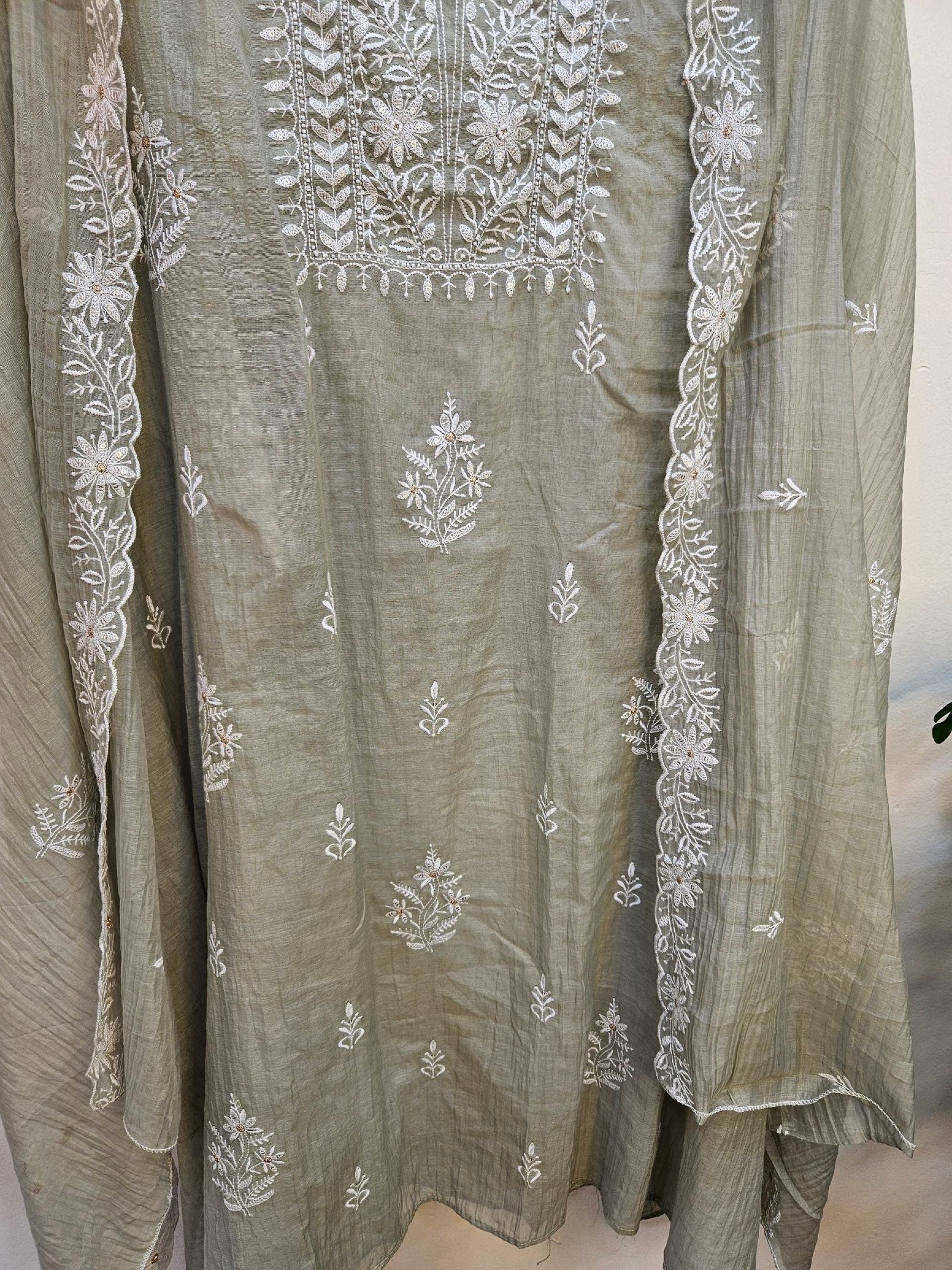 Pure mul chanderi fabric adorned with intricate Lucknowi embroidery, paired with a pearl handwork dupatta in matching mul chanderi. Comes with a soft cotton trouser, creating a graceful and elegant summer vibe — light, breathable, and effortlessly sophisticated.