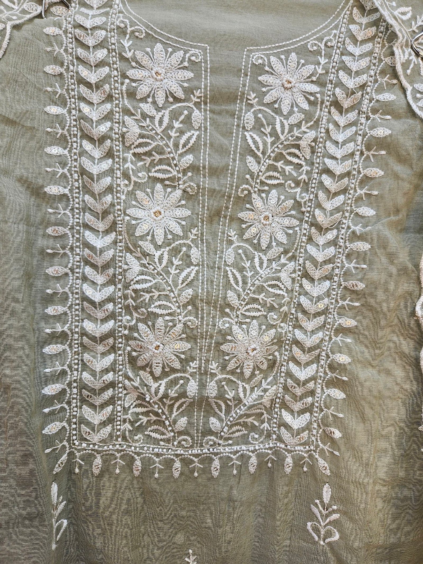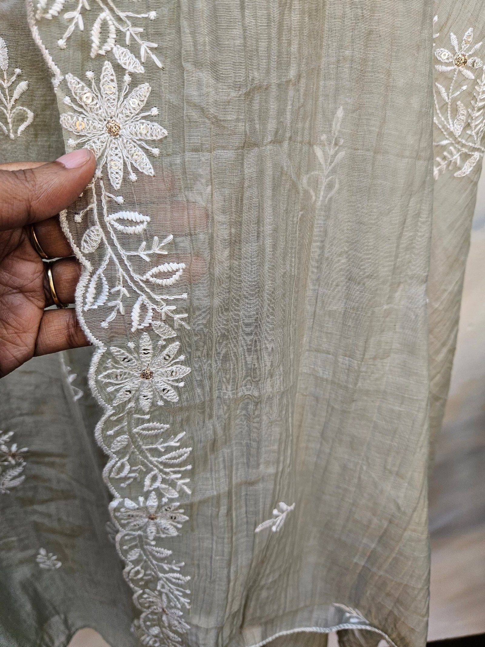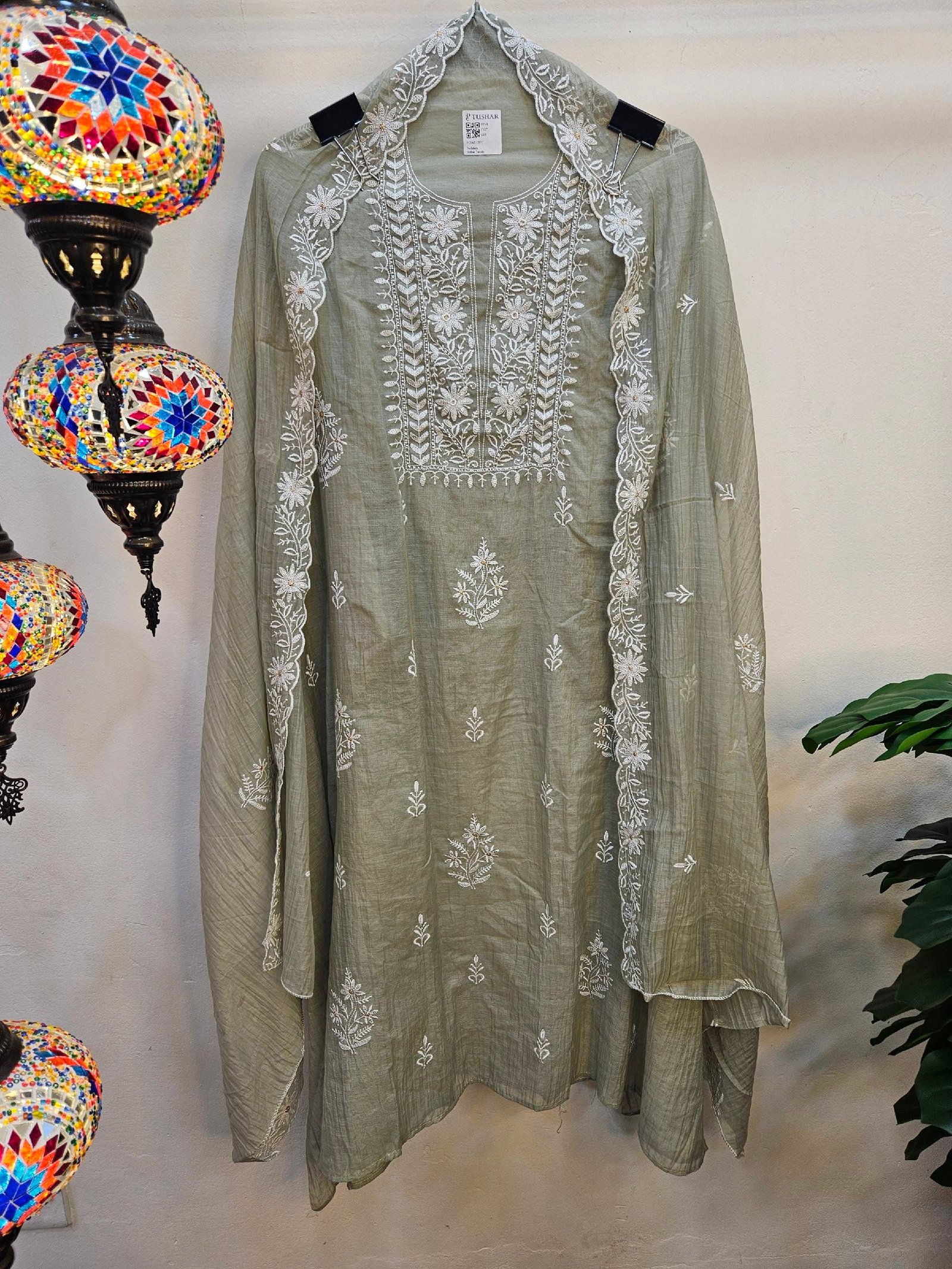 Pure mul chanderi fabric adorned with intricate Lucknowi embroidery, paired with a pearl handwork dupatta in matching mul chanderi. Comes with a soft cotton trouser, creating a graceful and elegant summer vibe — light, breathable, and effortlessly sophisticated.