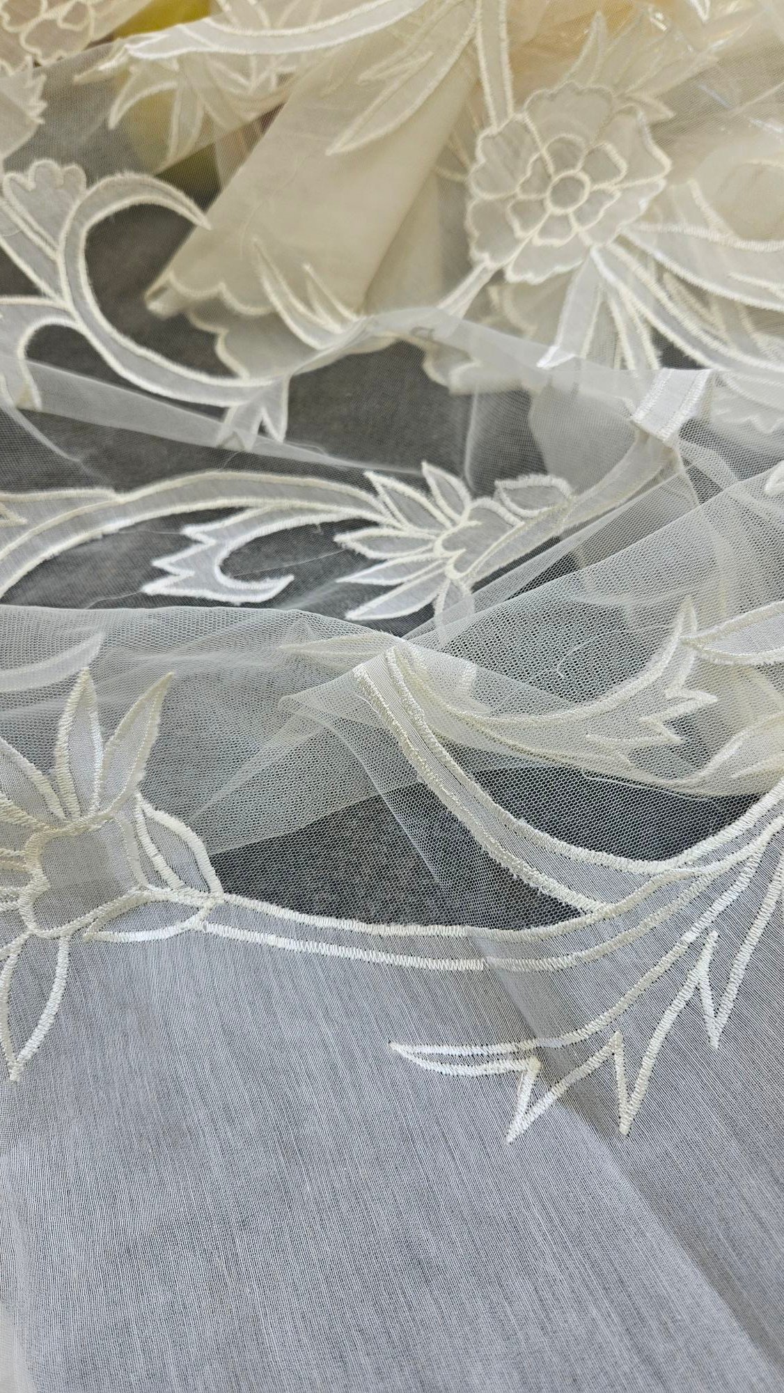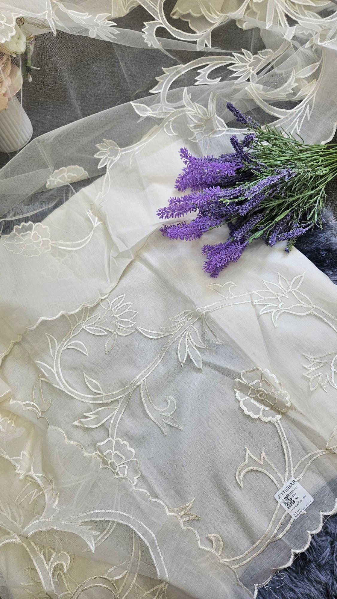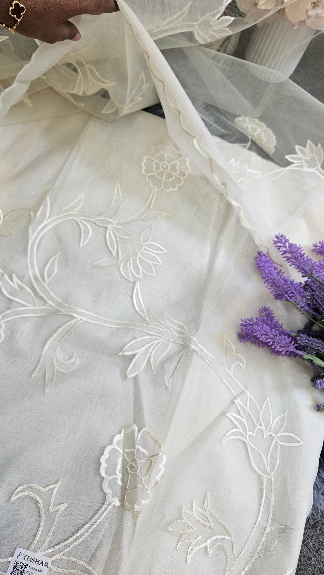 Soft, breathable mul Chanderi in an elegant ivory hue, highlighted with delicate appliqué work. The subtle sheen and handcrafted detailing create a timeless, graceful look—perfect for refined boutique wear and understated festive elegance.
