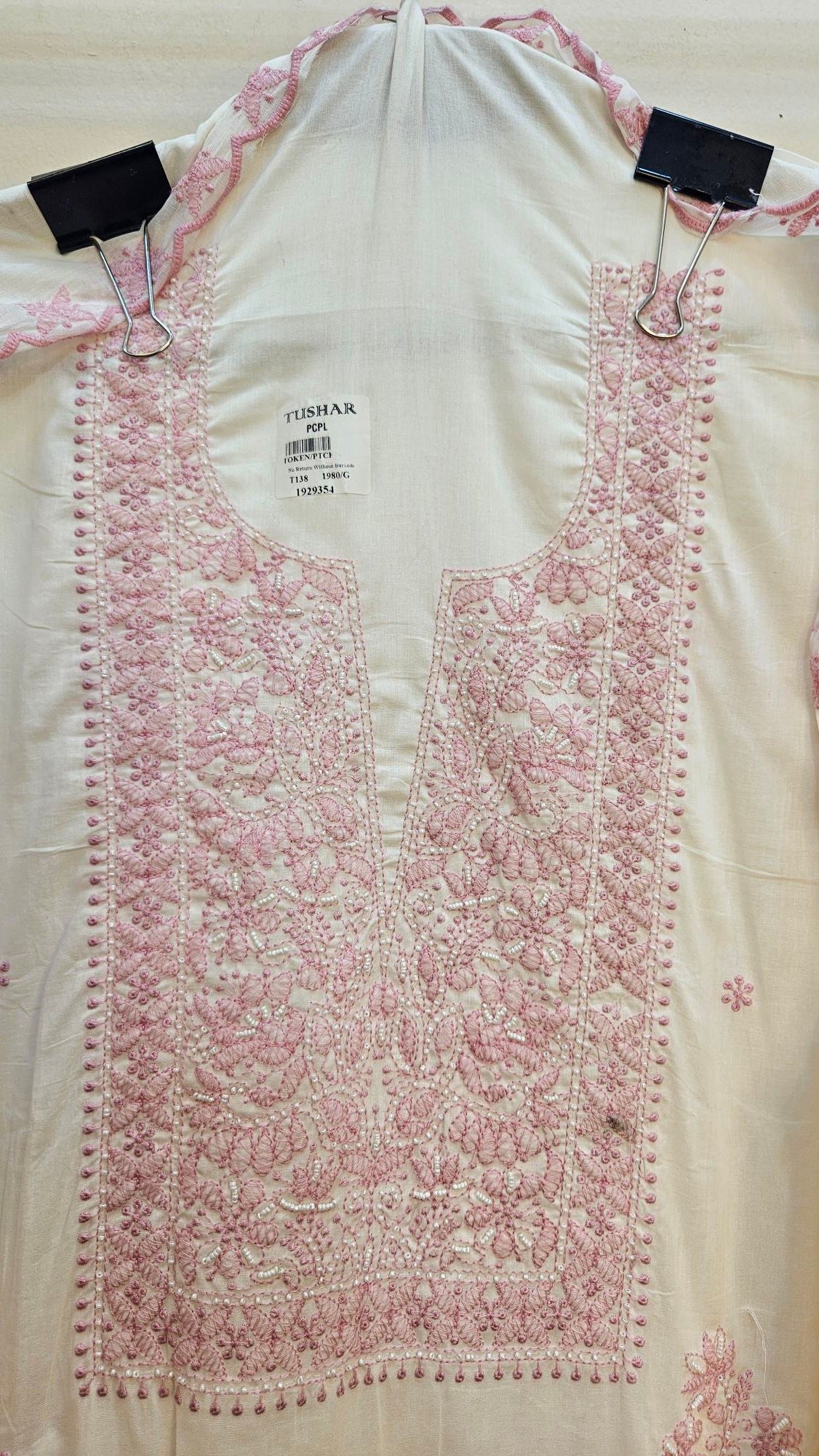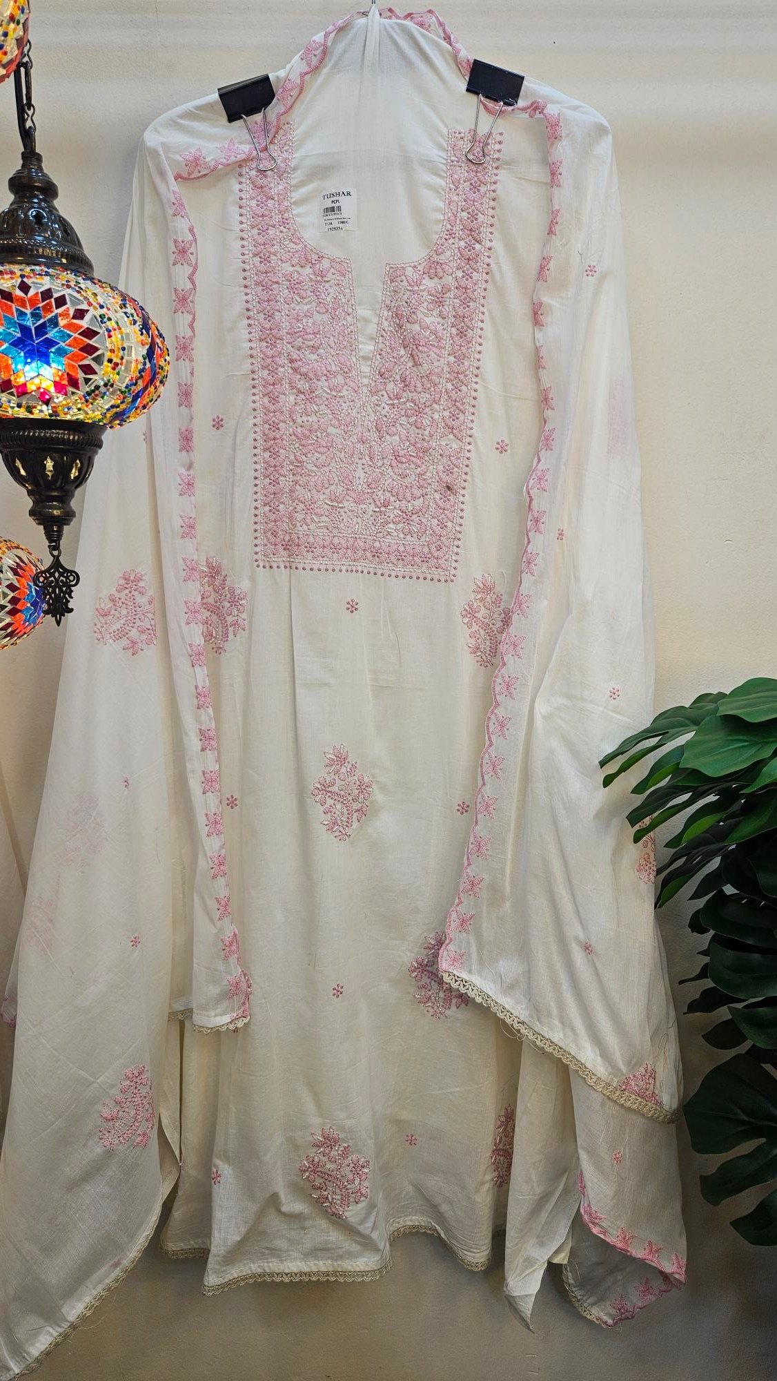 Pure mul mul cotton beautifully adorned with authentic Lucknowi embroidery and intricate real handwork. Paired with a matching dupatta featuring elegant four-side Lucknowi border detailing and a comfortable cotton bottom.