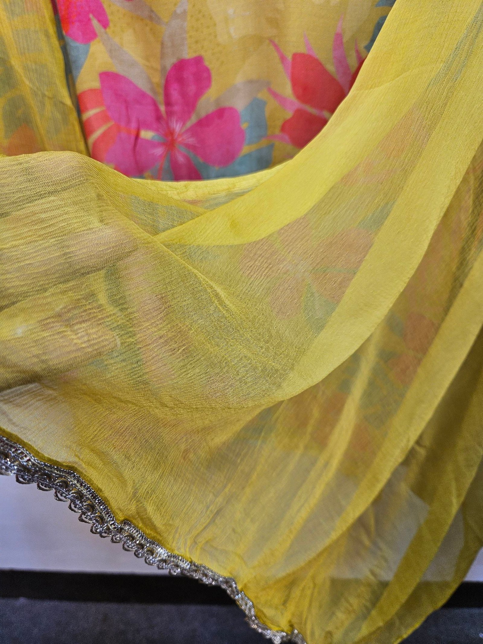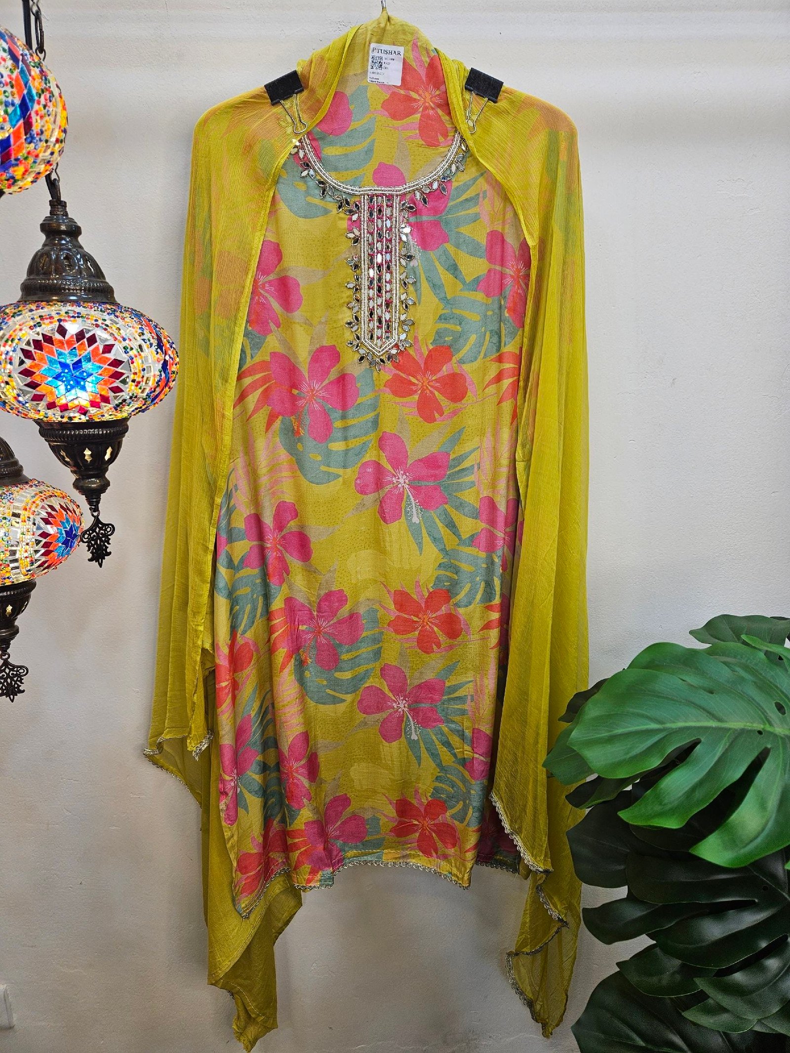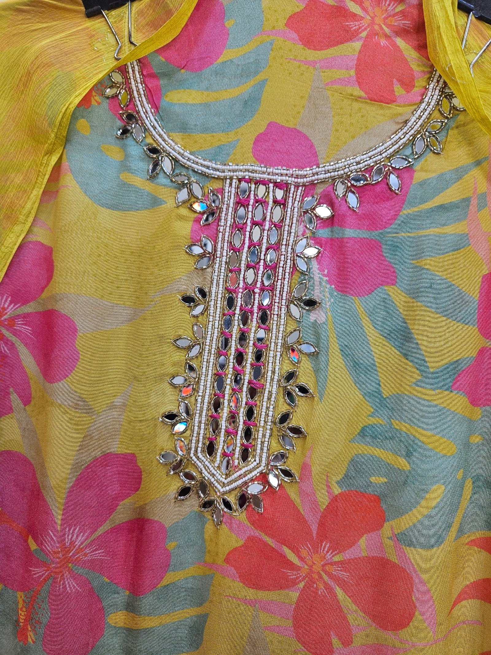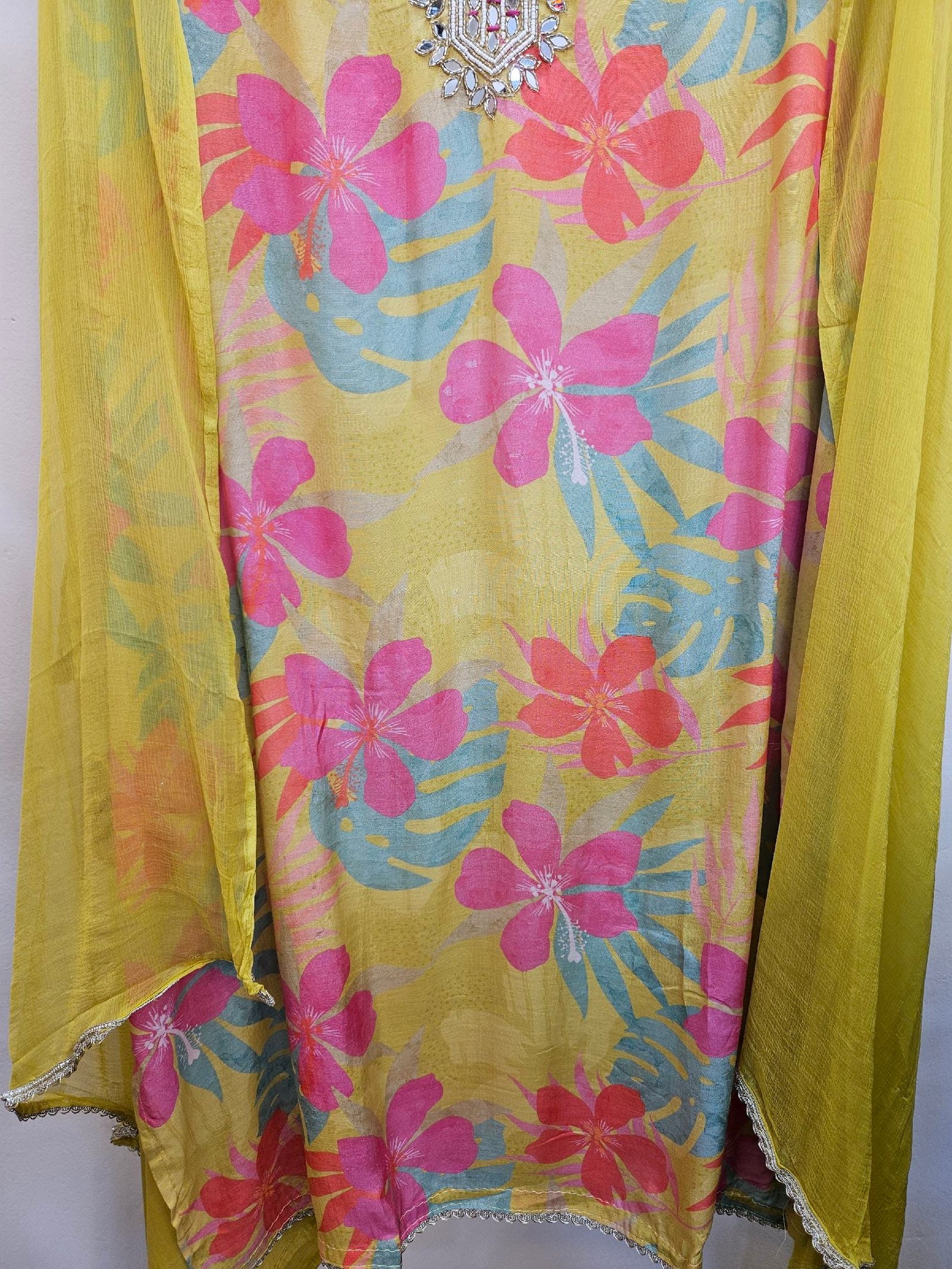 Pure mul mul silk fabric featuring exquisite neckline handwork, enhanced with fully floral vibrant prints and rich, lively colours for a fresh and elegant look. Paired with a graceful chiffon dupatta finished with delicate side lace detailing. Completed with a comfortable santoon bottom, making it a perfect choice for stylish and effortless wear. 🌸✨