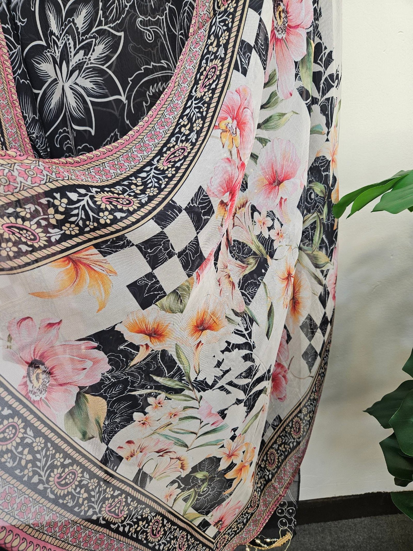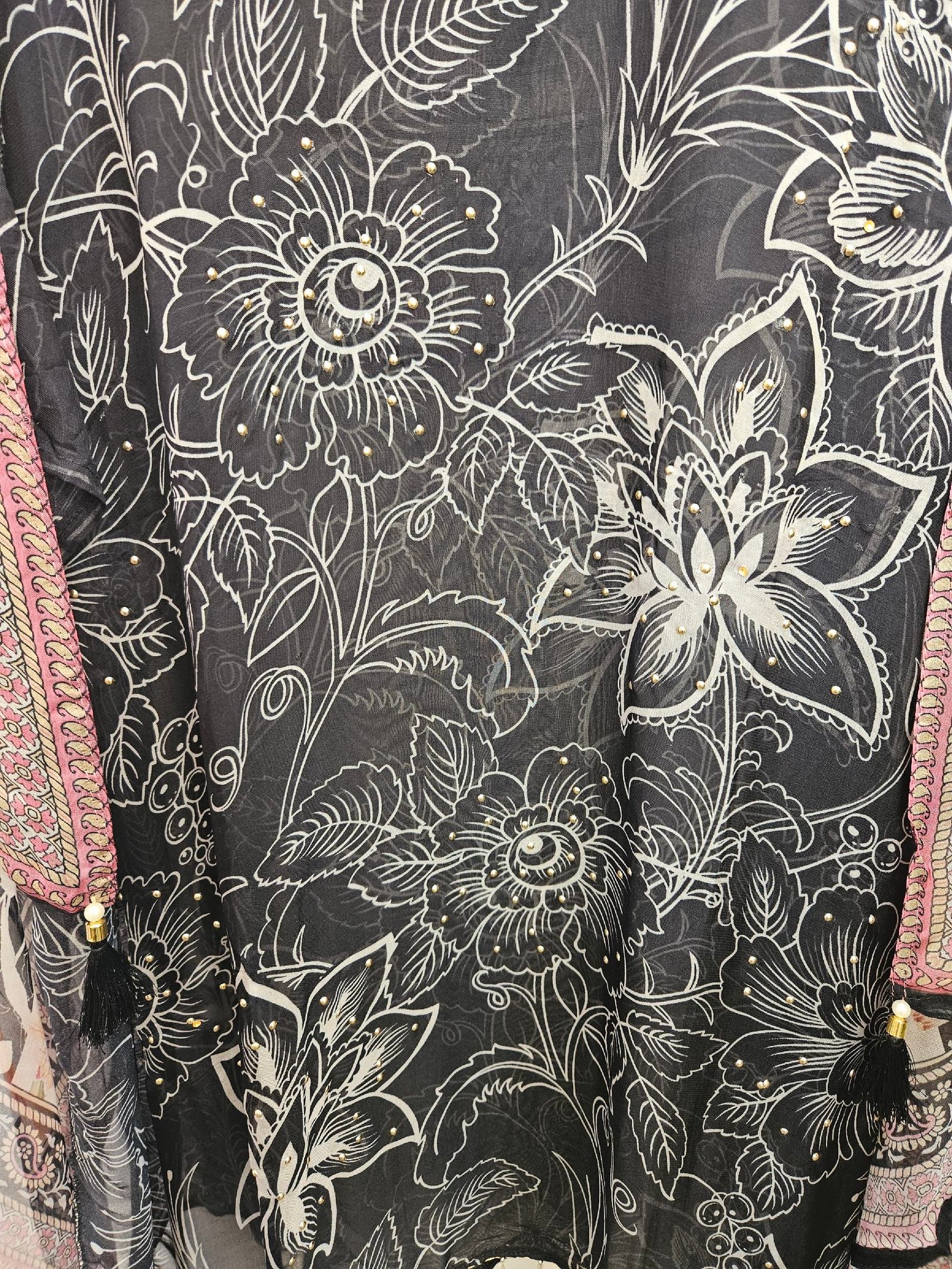 Pure muslin fabric adorned with elegant neckline handwork, paired with a beautifully crafted digital printed muslin dupatta that enhances its charm. Comes with a comfortable santoon bottom — a perfect blend of grace and comfort for any occasion