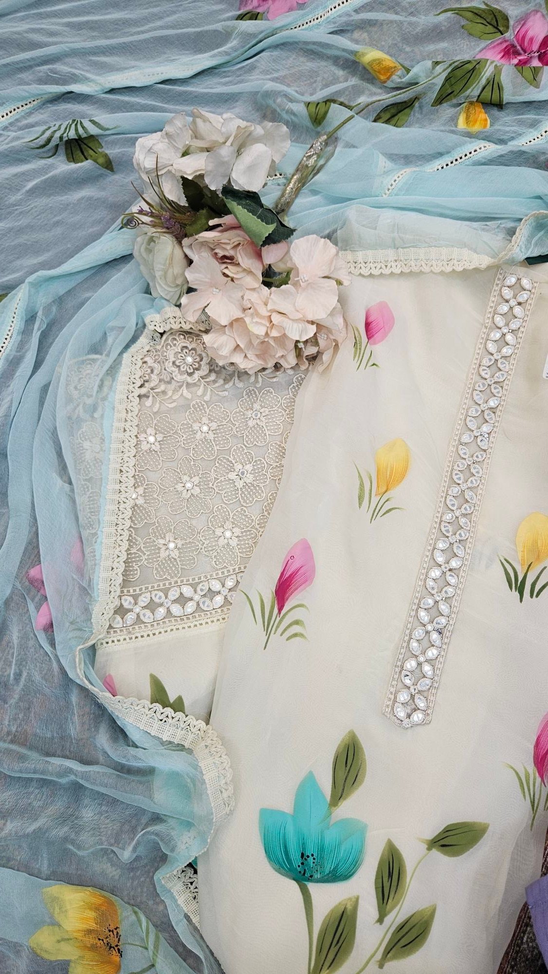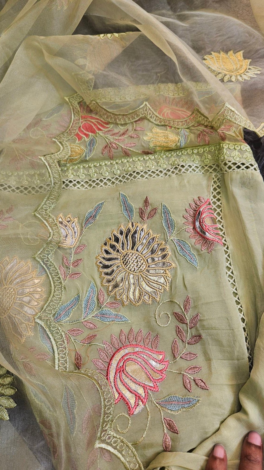 Pure muslin fabric gracefully embellished with intricate Parsi embroidery and refined leather scalping work. Paired with a luxurious soft tissue dupatta featuring delicate cutwork embroidery, and complemented by a smooth santoon bottom—an ensemble that reflects timeless sophistication and understated luxury.