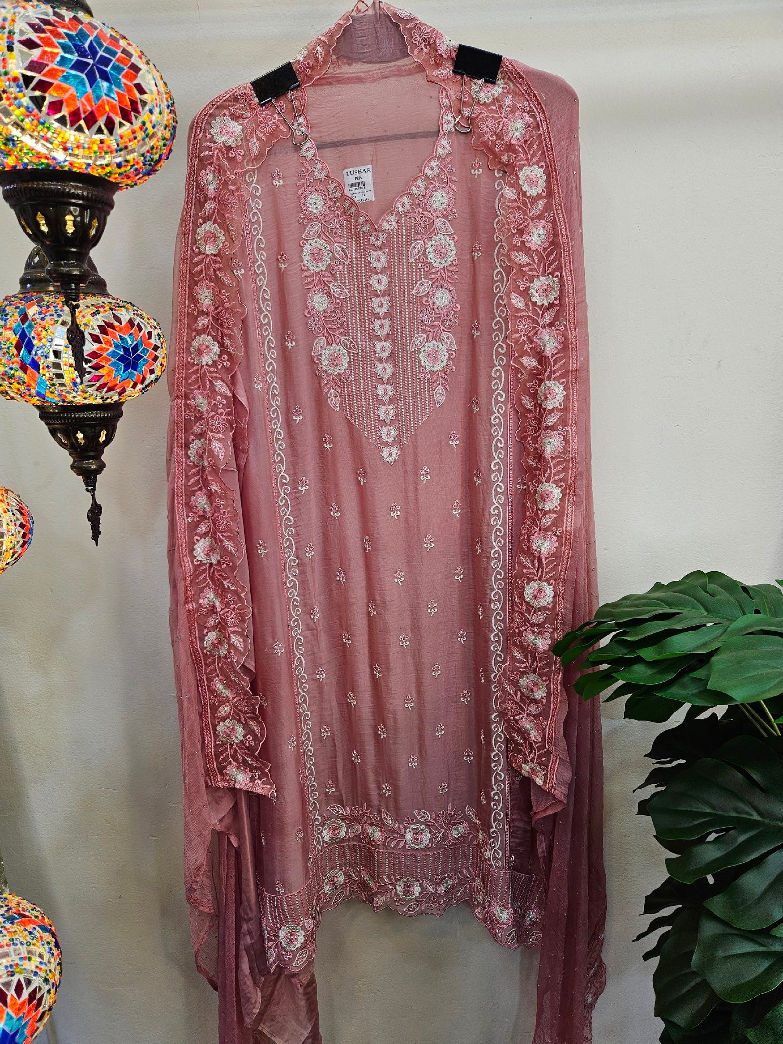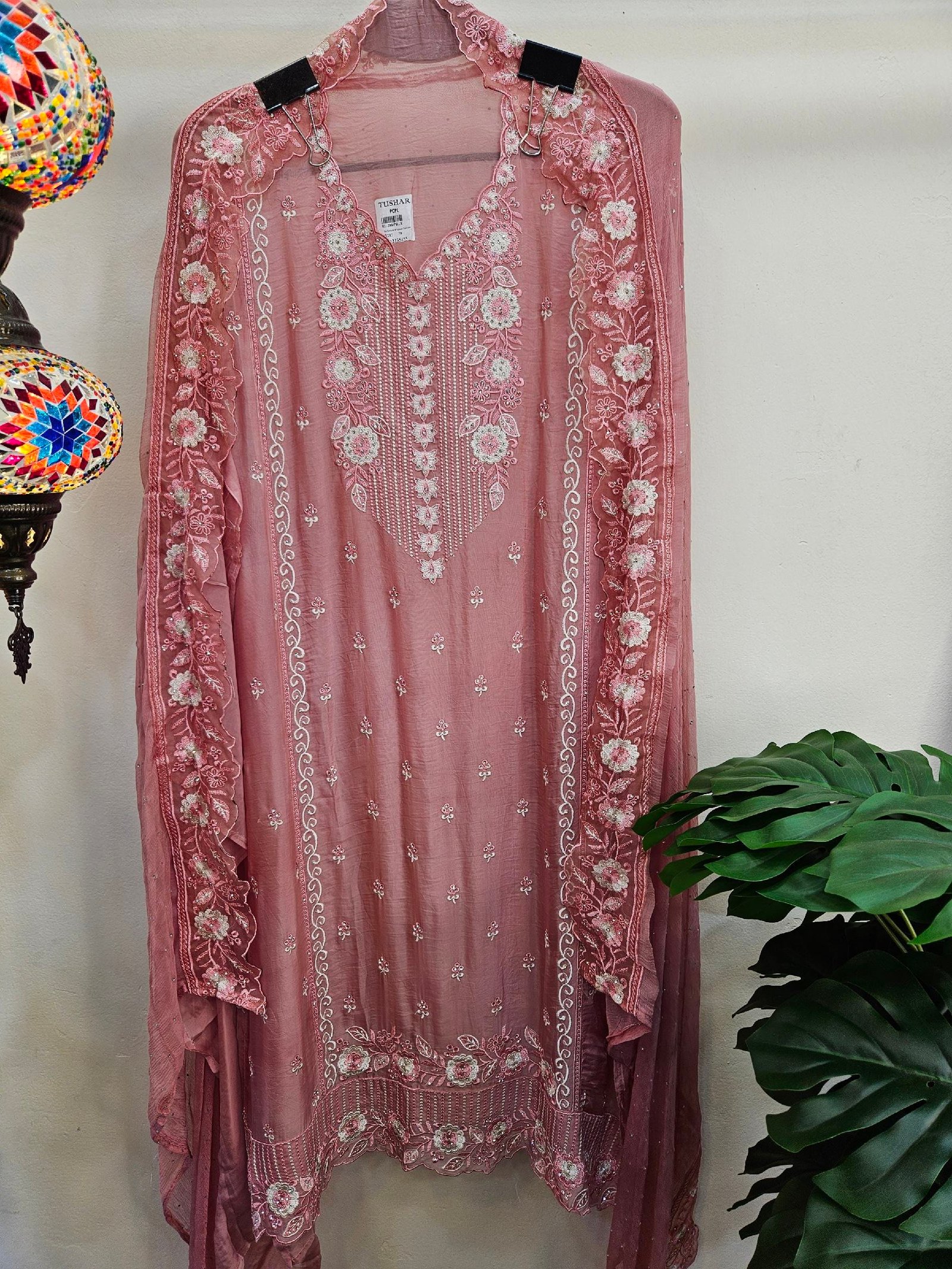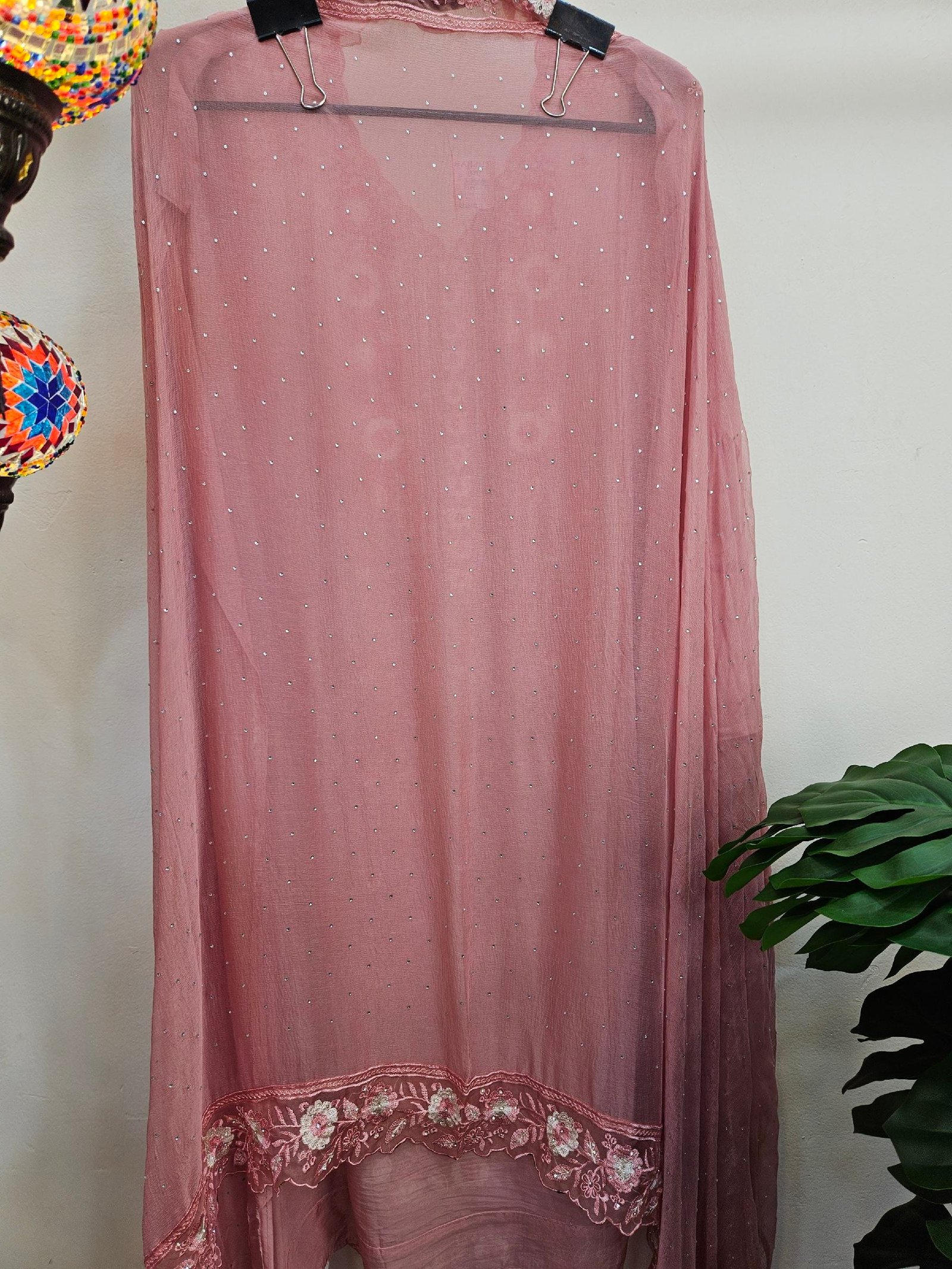 Paired with a pure chiffon dupatta featuring cutwork border and delicate stone sprinkle all over, along with a comfortable santoon bottom.