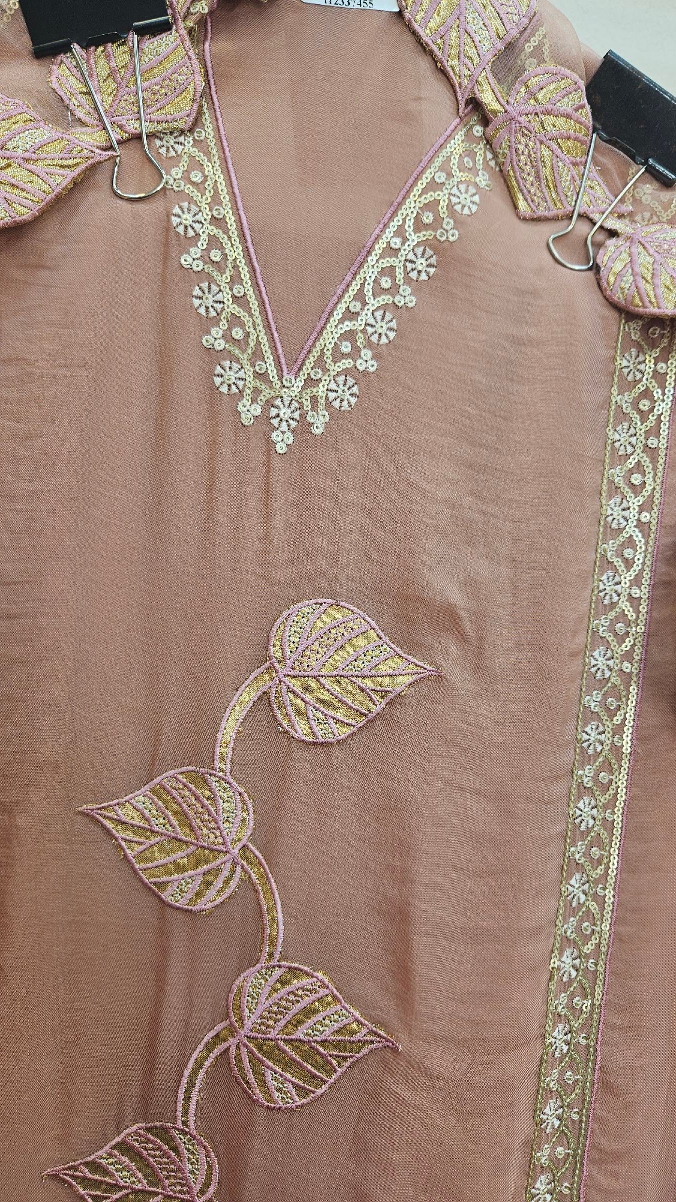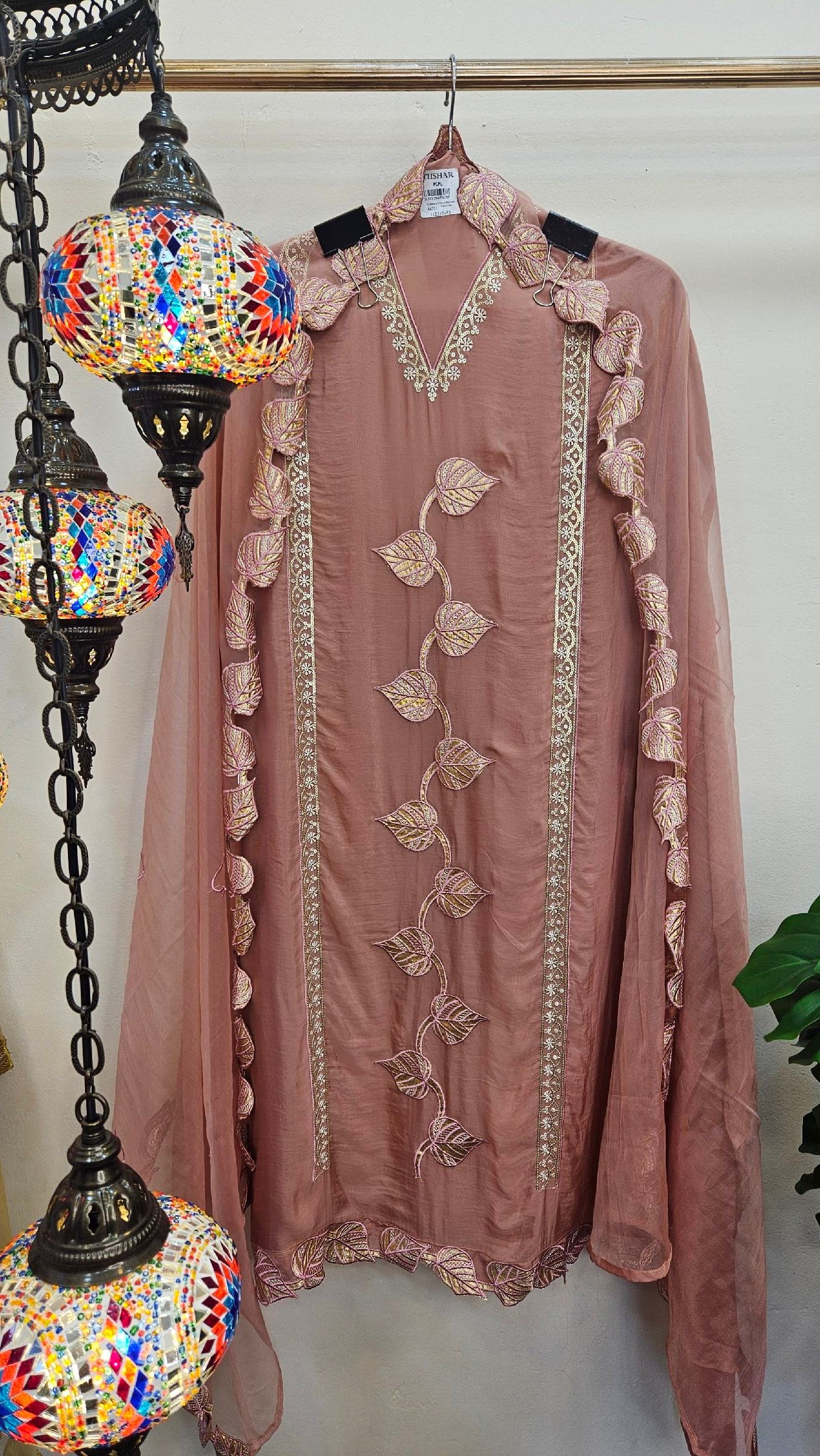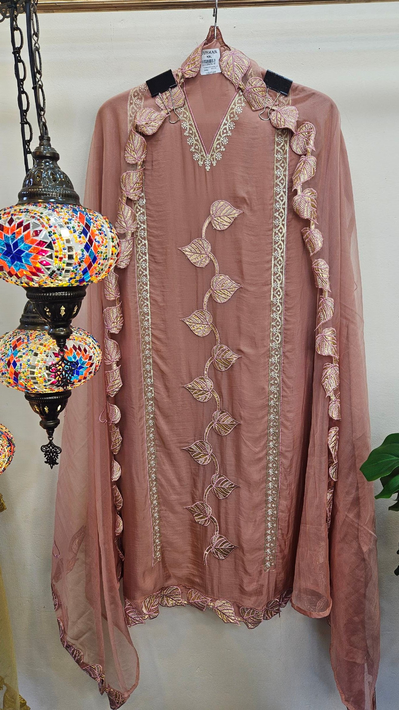 Pure muslin fabric gracefully embellished with intricate Sequence embroidery and refined leather scalping work. Paired with a luxurious soft tissue dupatta featuring delicate cutwork embroidery, and complemented by a smooth santoon bottom—an ensemble that reflects timeless sophistication and understated luxury.