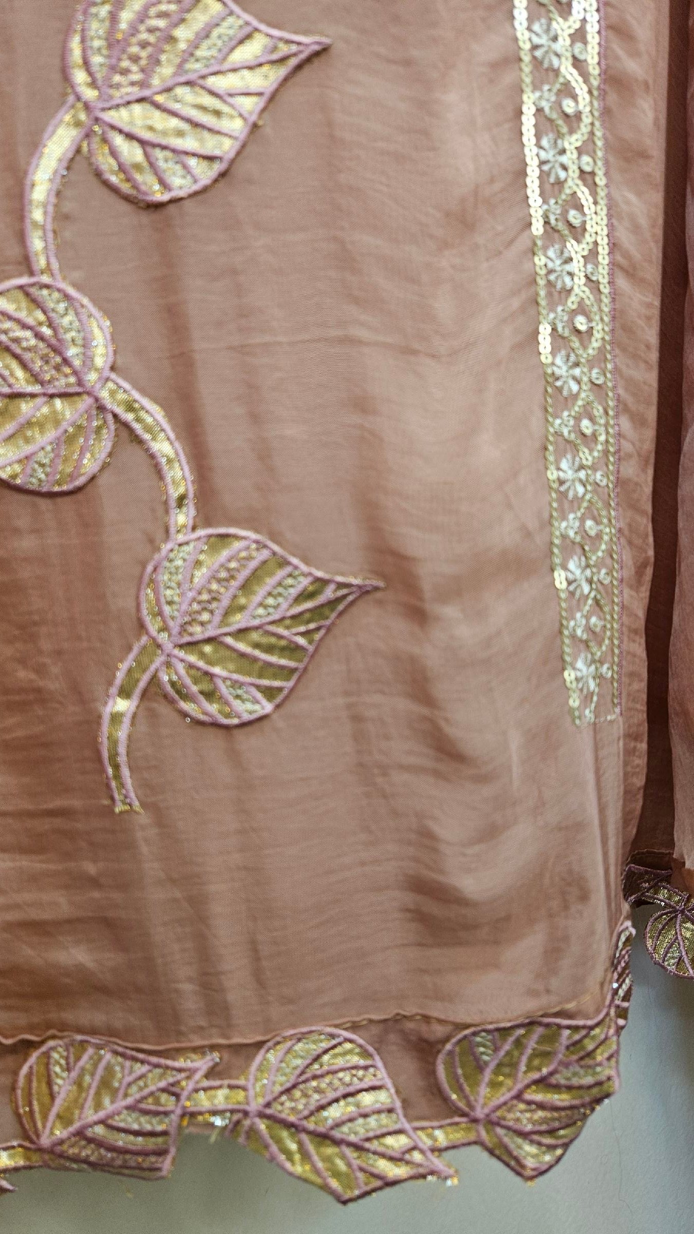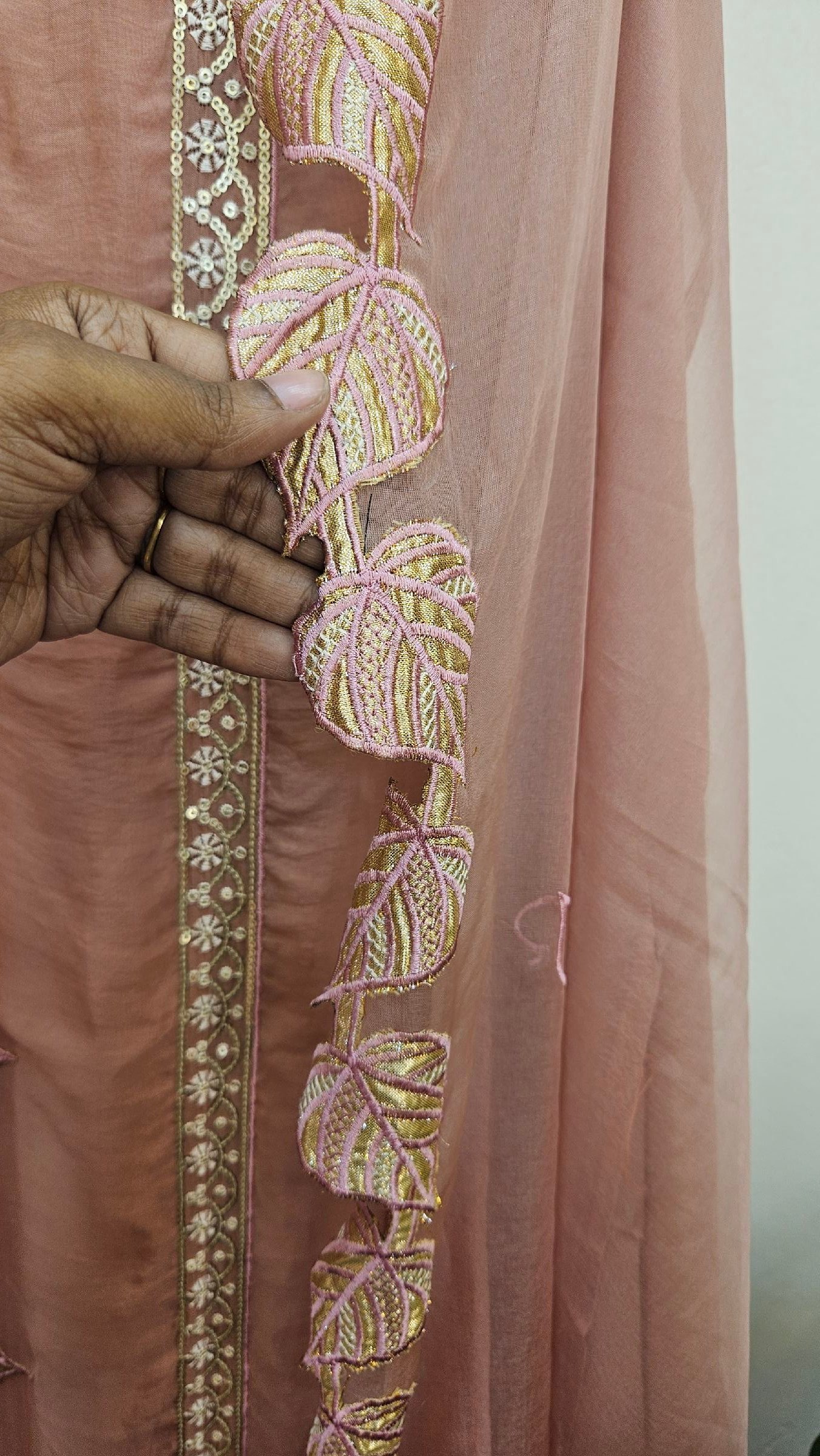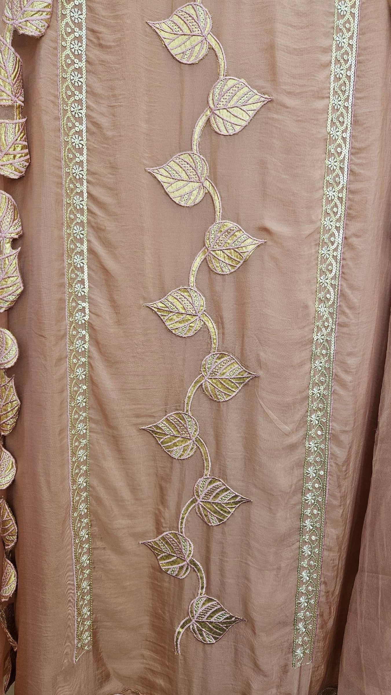 Pure muslin fabric gracefully embellished with intricate Sequence embroidery and refined leather scalping work. Paired with a luxurious soft tissue dupatta featuring delicate cutwork embroidery, and complemented by a smooth santoon bottom—an ensemble that reflects timeless sophistication and understated luxury.