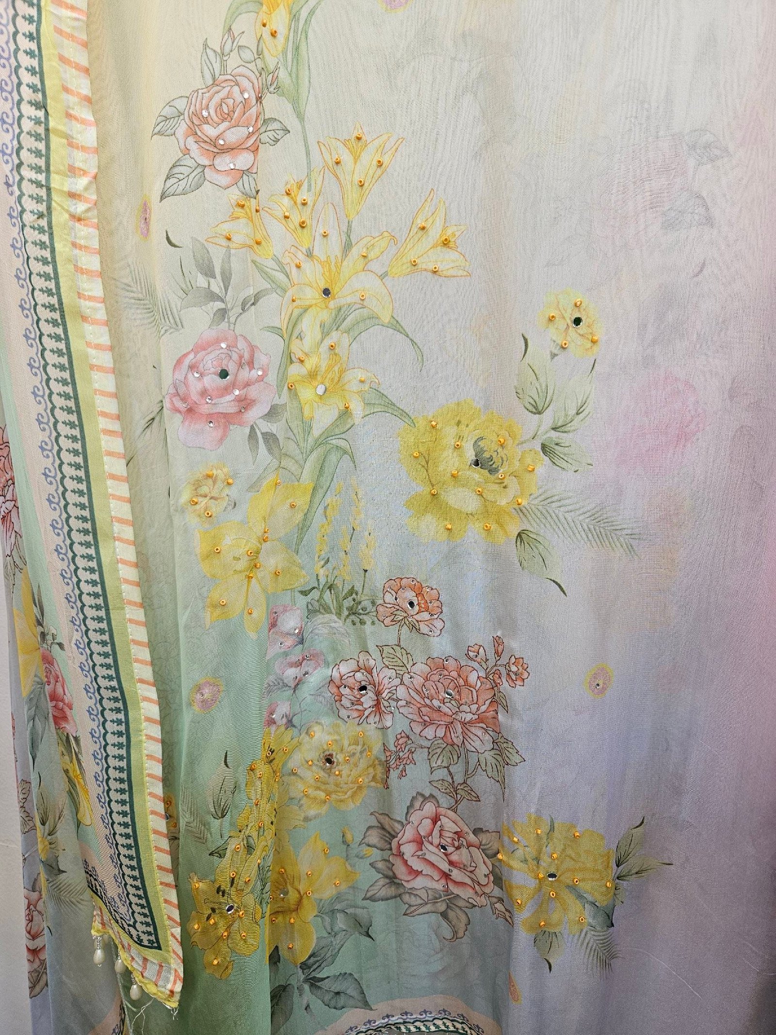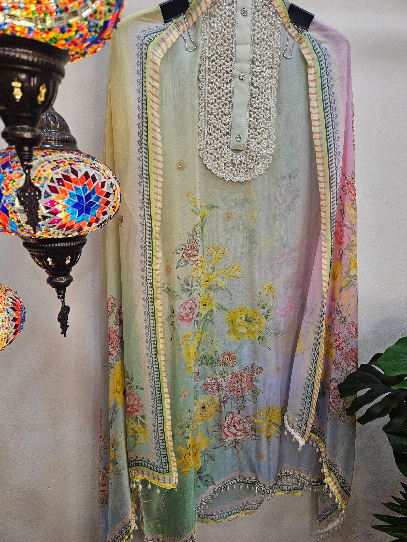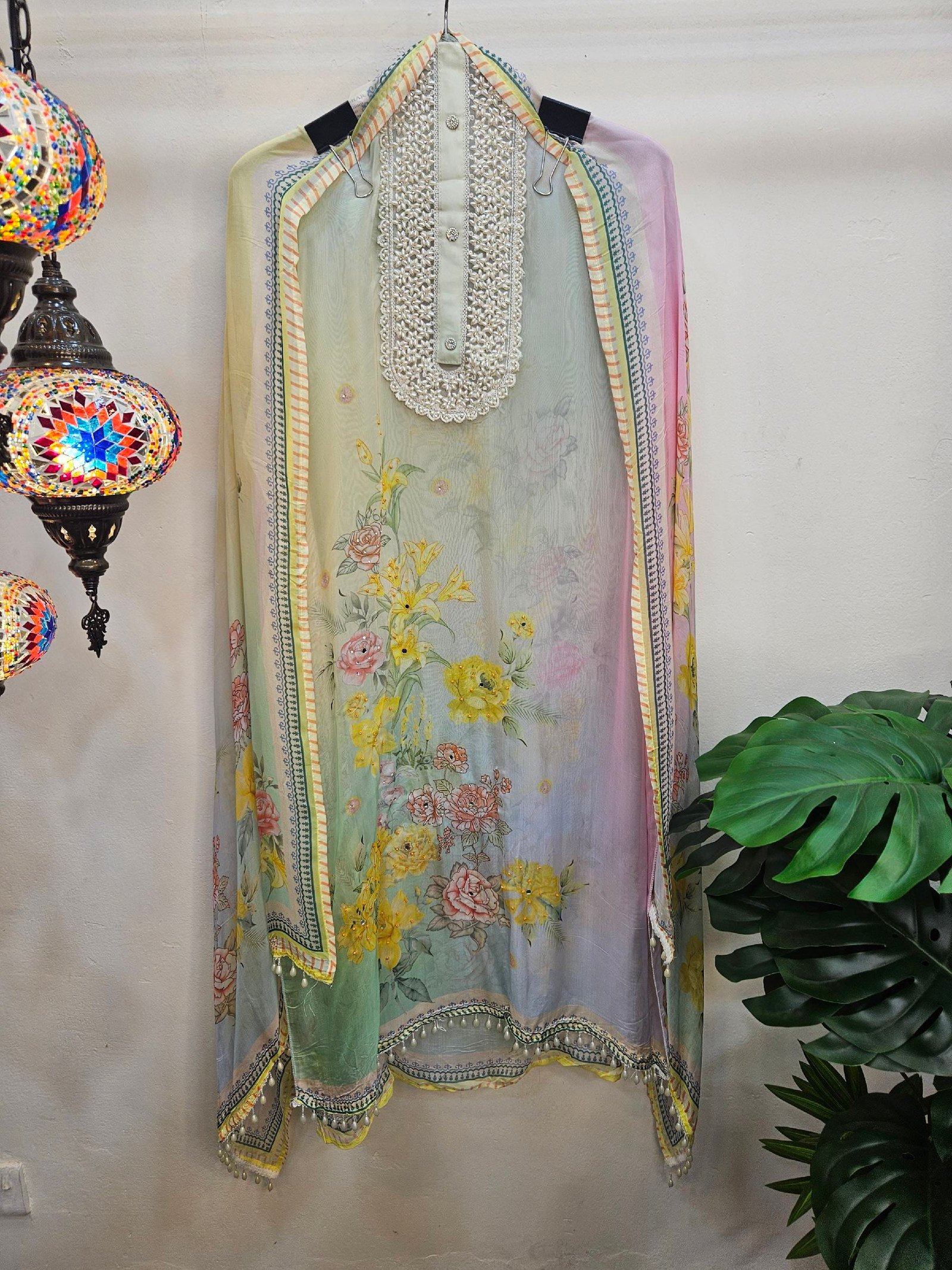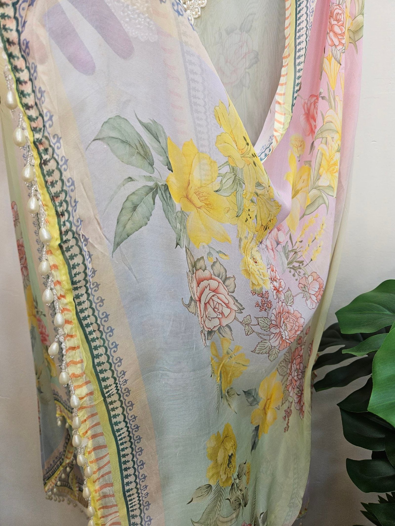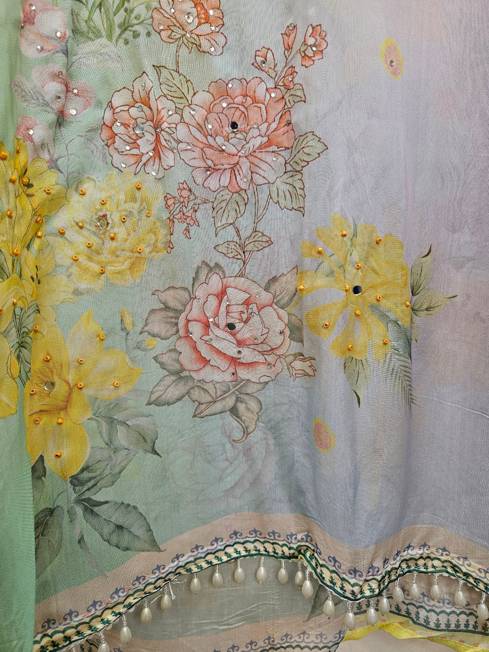 Pure soft muslin with elegant digital print and fully handworked neckline with subtle stone detailing. Printed daman finished with beautiful pearl lacing.