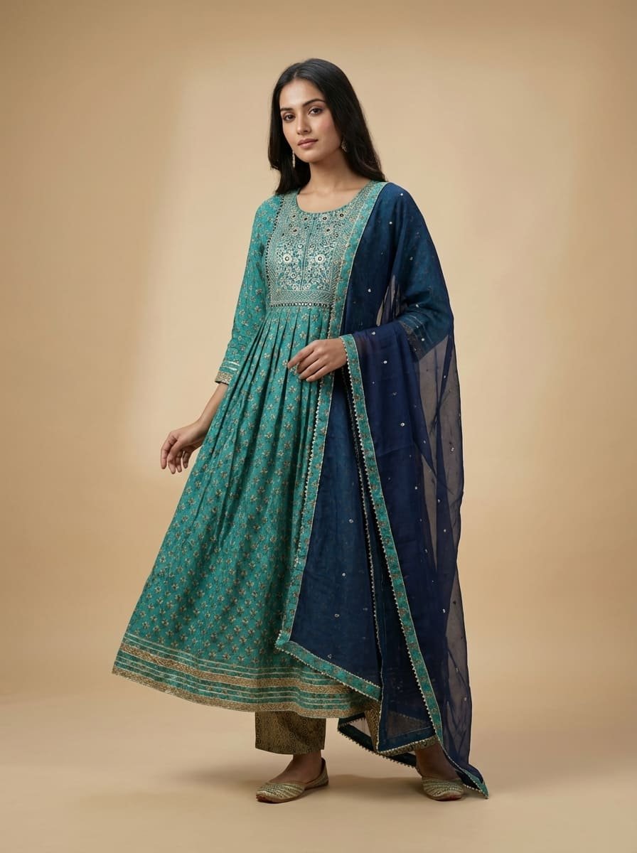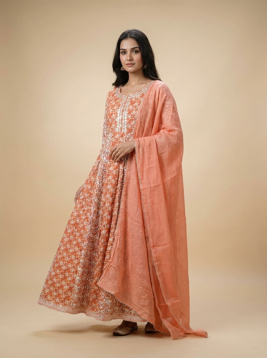 Mal mal cotton silk floor-length gown featuring a Jaipuri printed base with an intricately embroidered neckline. Paired with a soft Muslin dupatta adorned with subtle matte sequin work all over. Lightweight, breathable, and elegantly sophisticated—perfect for summer occasions.