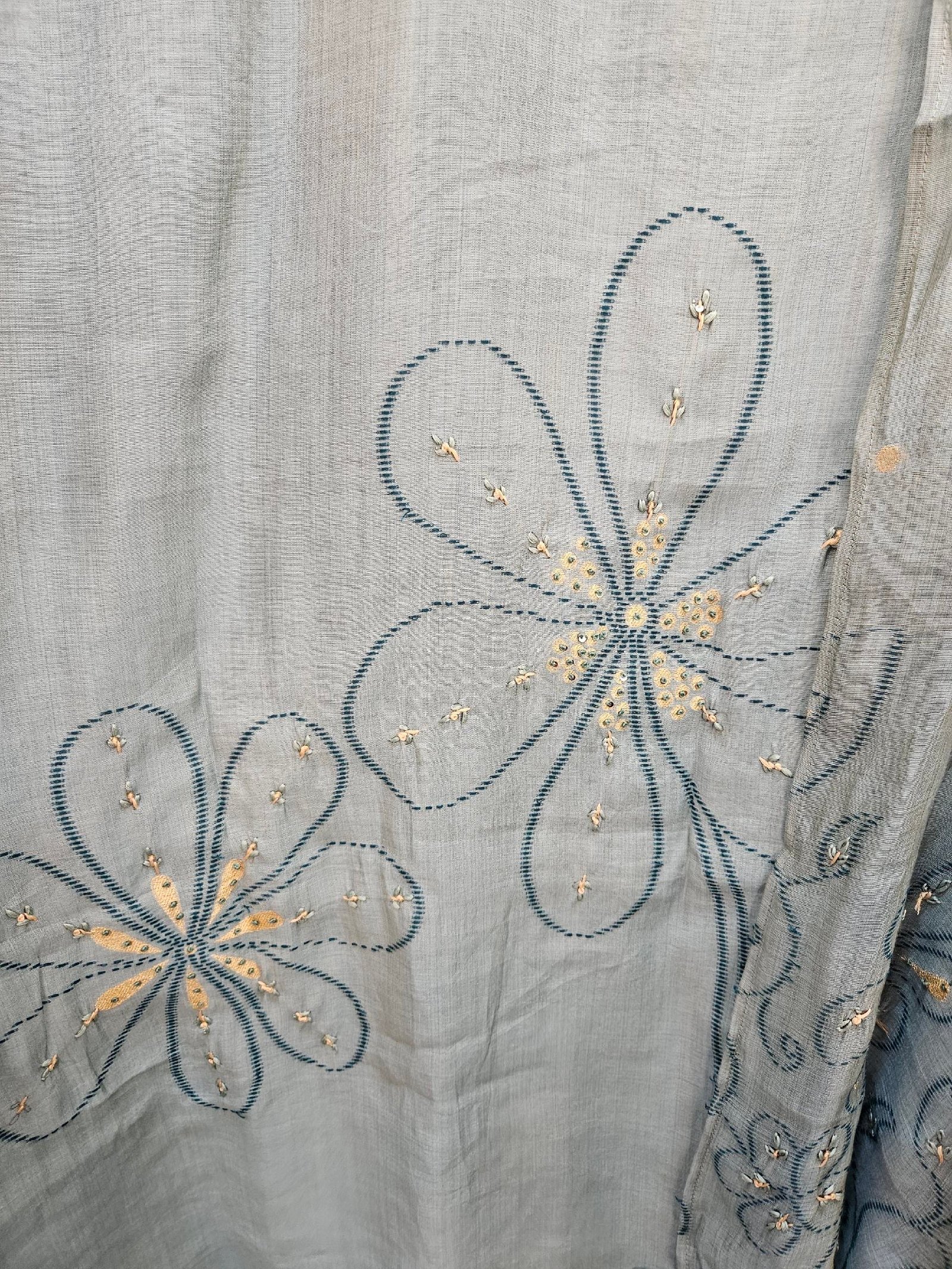 Soft Tassar Jamdani weaving dress beautifully designed with delicate French knot work on the neckline and elegant knit detailing on the daman. Paired with a soft Tassar dupatta featuring Jamdani weaving on the daman and intricate knot work accents. Comes with a comfortable Santoon bottom.
