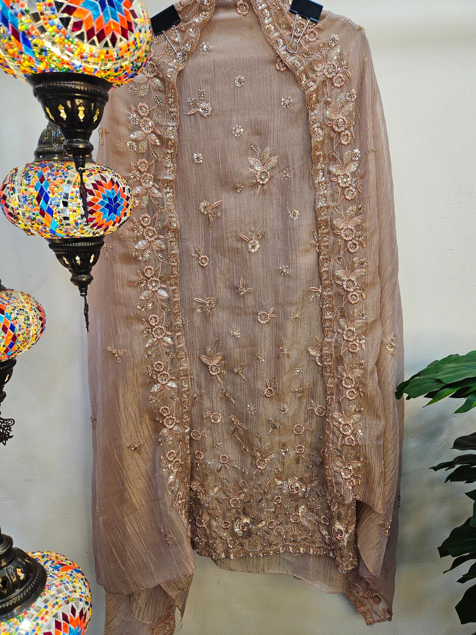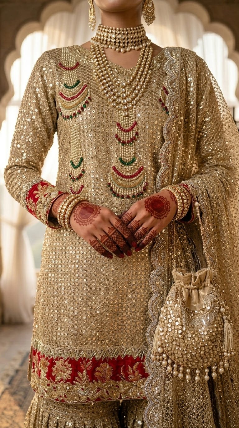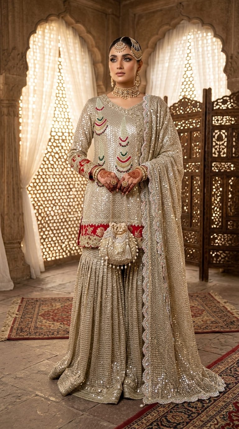 An exquisitely sophisticated bridal Anarkali sharara ensemble, crafted in opulent full-sequin fabric with a meticulously detailed neckline, elevated by fine lace zardozi work in a classic angrakha silhouette. The sleeves in rich red brocade are adorned with intricate zardozi lace, seamlessly echoed on the daman with refined precision. The sharara, fully embellished in shimmering sequins, is gracefully finished with delicate zardozi lace at the hem, adding depth and regal charm. Paired with a statement dupatta featuring four-sided zardozi lace borders and all-over sequin detailing, along with an attached inner for effortless comfort—this ensemble embodies timeless grandeur, couture craftsmanship, and unparalleled bridal sophistication. ✨